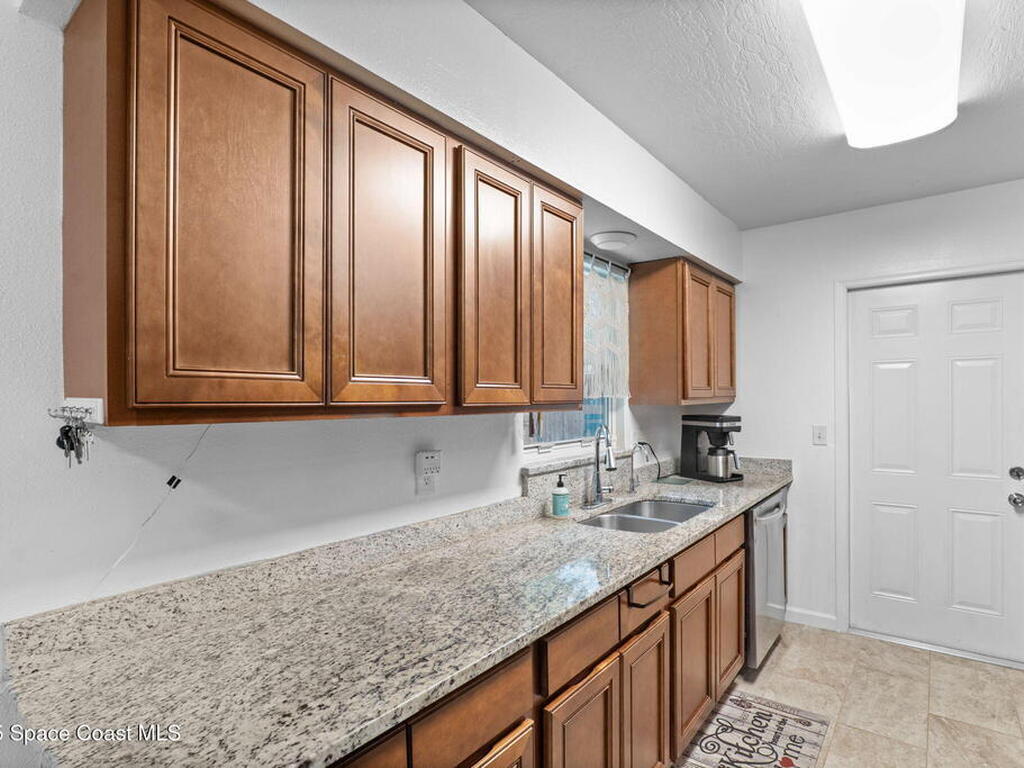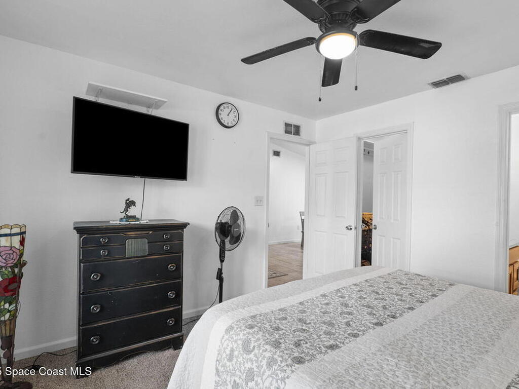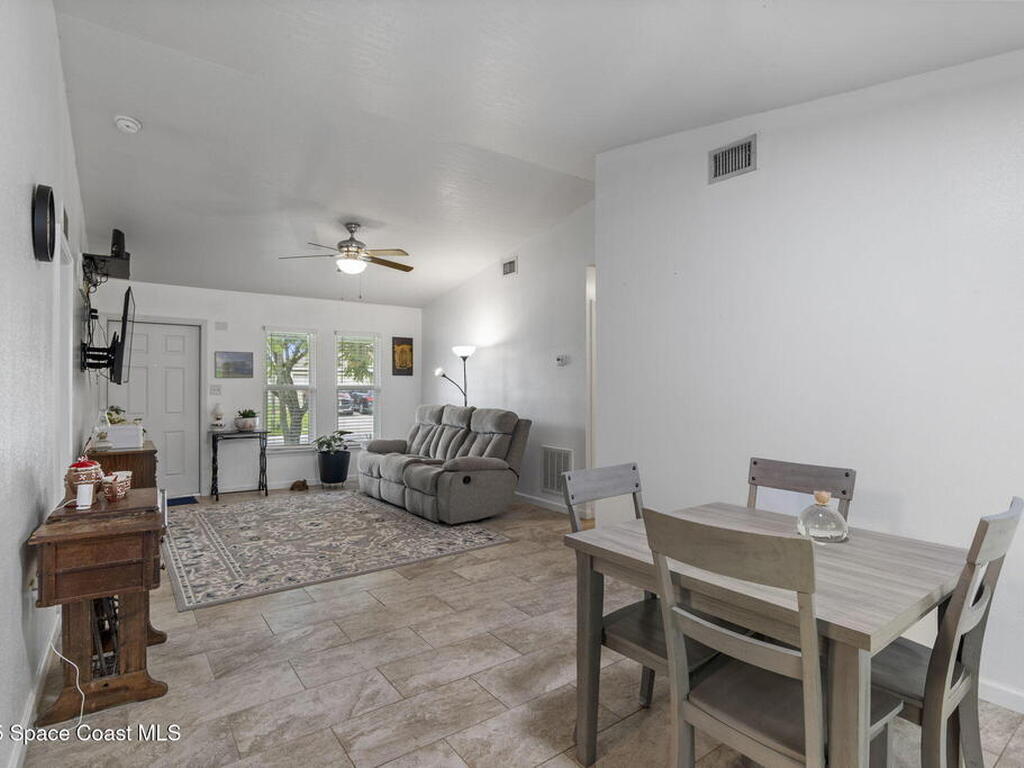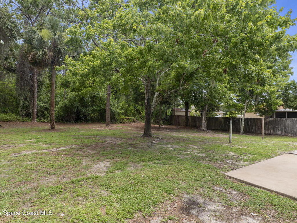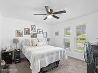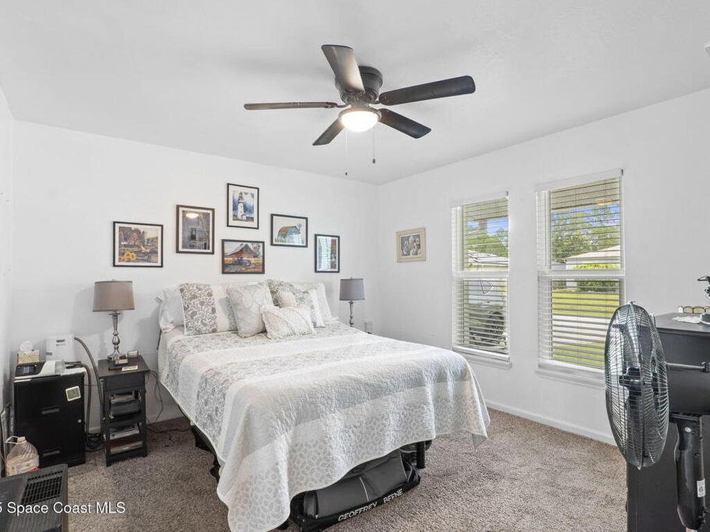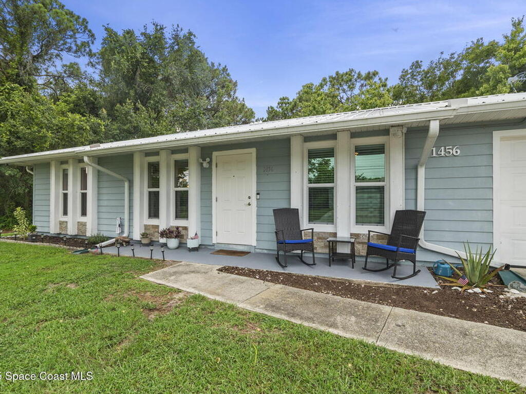 Wanting to live in the Space Coast? This MOVE IN READY home offers new windows in 2023 Updated kitchen features solid wood cabinets, granite countertops and newer appliances. The main areas have ceramic tile floors while the bedrooms have either carpet or luxury vinyl plank flooring. The glass French doors open to the patio while allowing plenty of light to fill the dining area. The metal roof was installed in 2016 and a new HVAC in 2017. The backyard is very roomy with mature shade trees. Solar panels installed in 2023 (monthly payment is $164 a month). Electric bills run $40-$80 per month.
