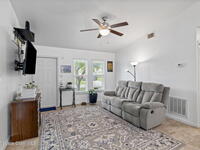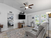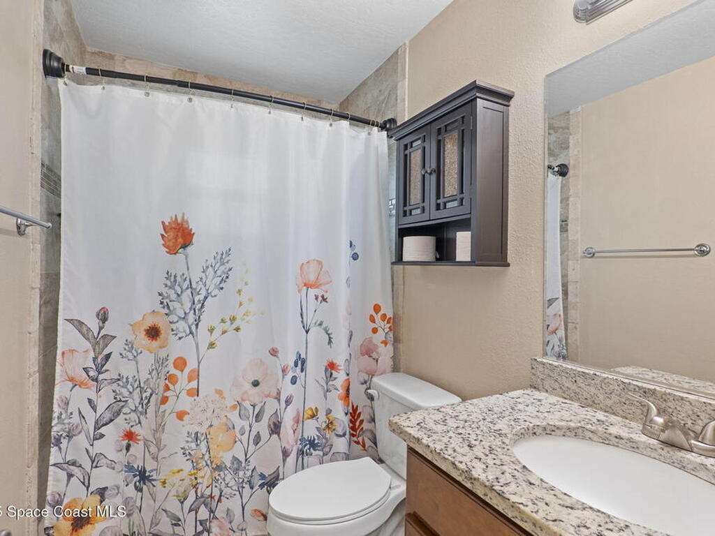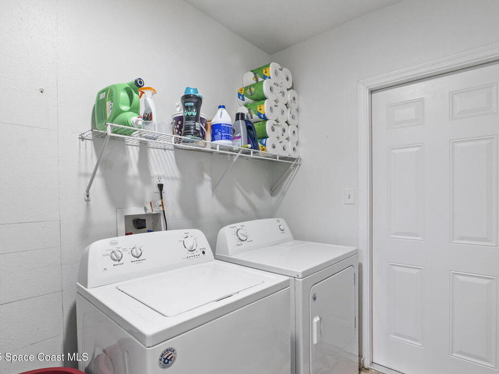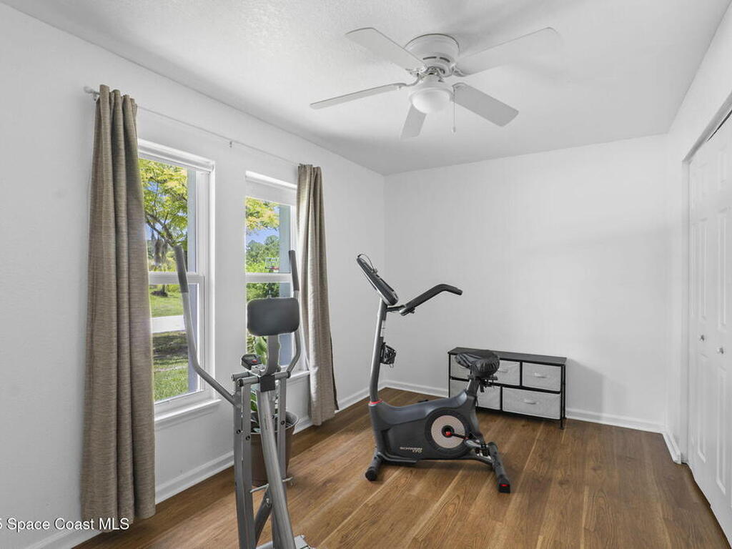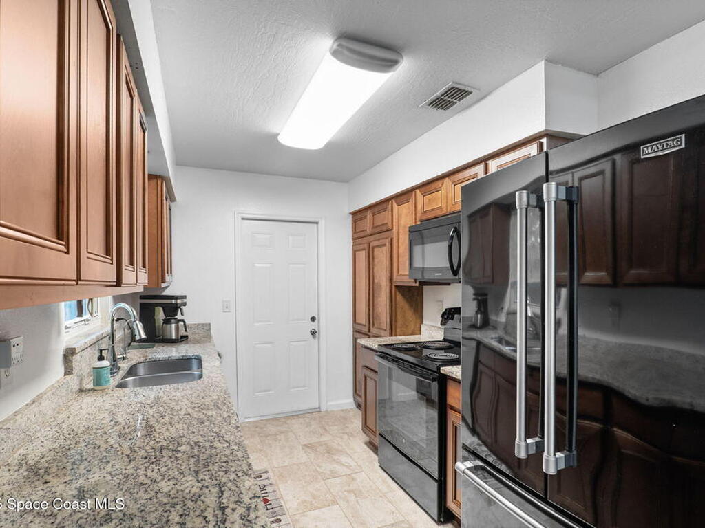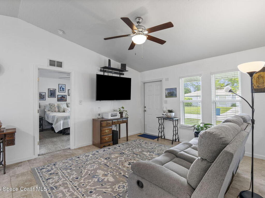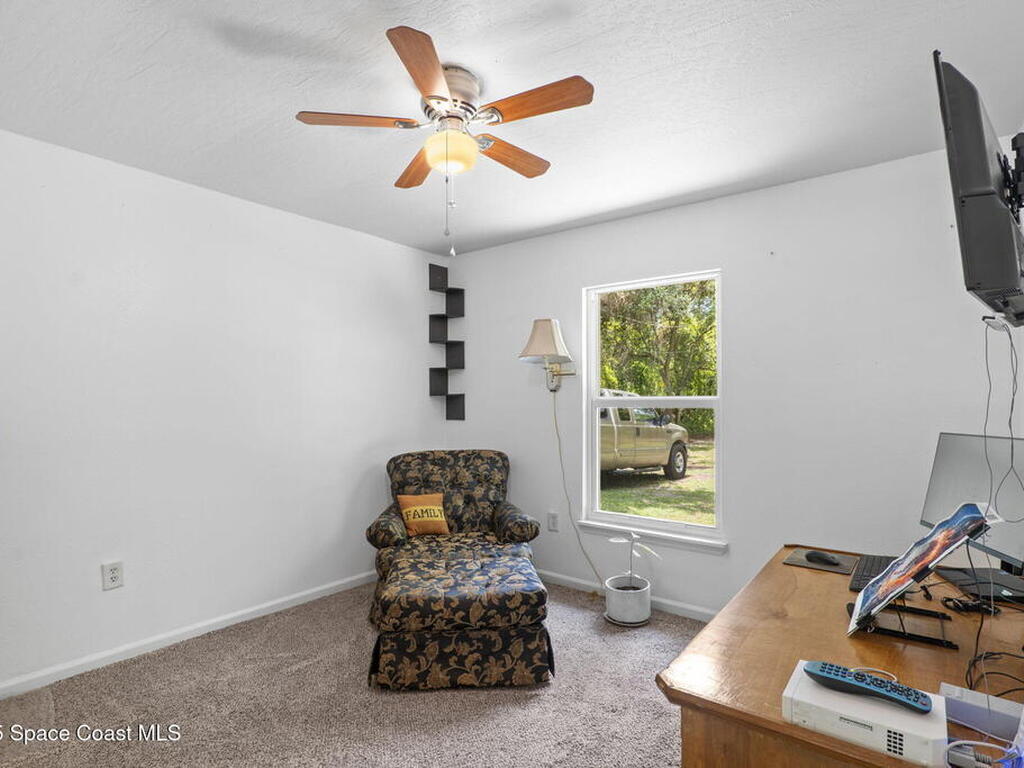 Wanting to live in the Space Coast? This MOVE IN READY home offers new windows in 2023 Updated kitchen features solid wood cabinets, granite countertops and newer appliances. The main areas have ceramic tile floors while the bedrooms have either carpet or luxury vinyl plank flooring. The glass French doors open to the patio while allowing plenty of light to fill the dining area. The metal roof was installed in 2016 and a new HVAC in 2017. The backyard is very roomy with mature shade trees. Solar panels installed in 2023 (monthly payment is $164 a month). Electric bills run $40-$80 per month.