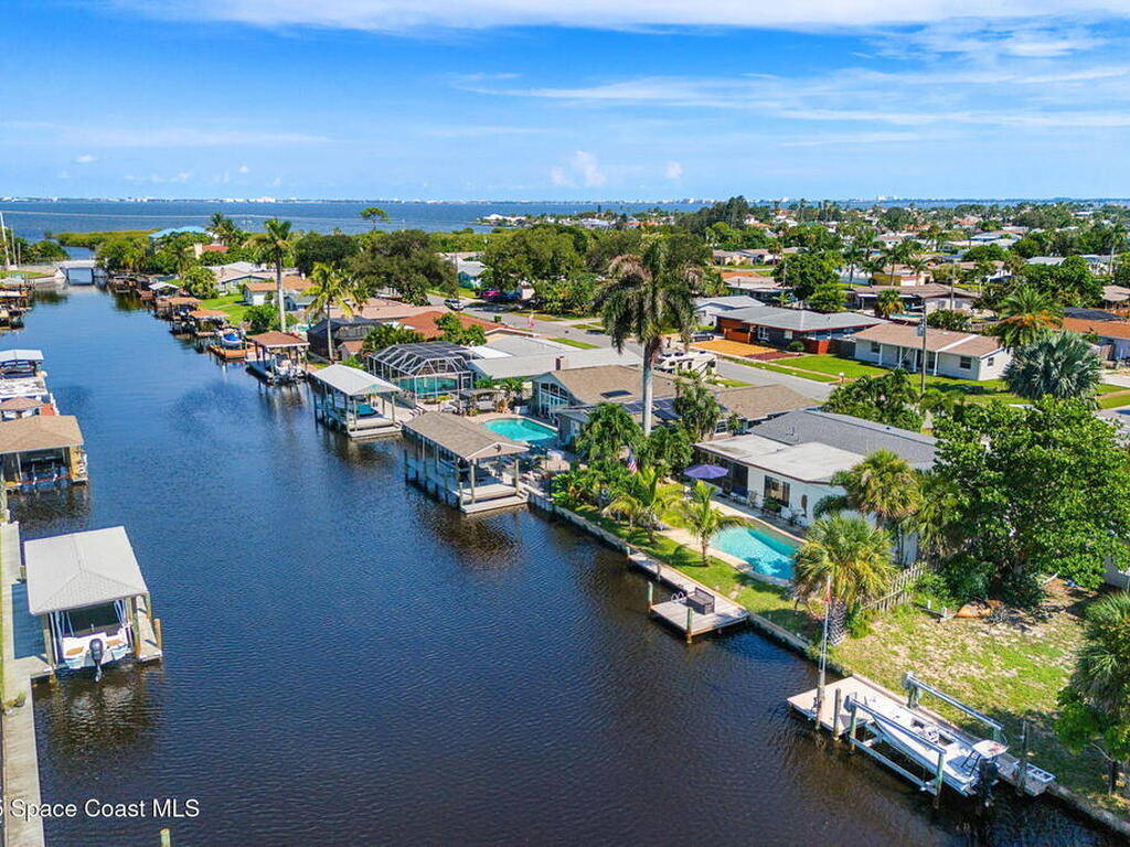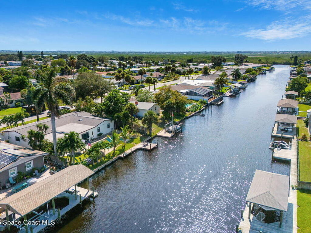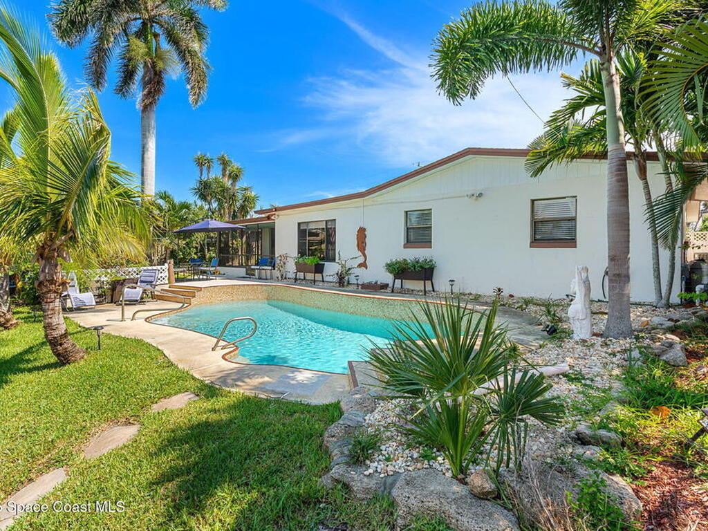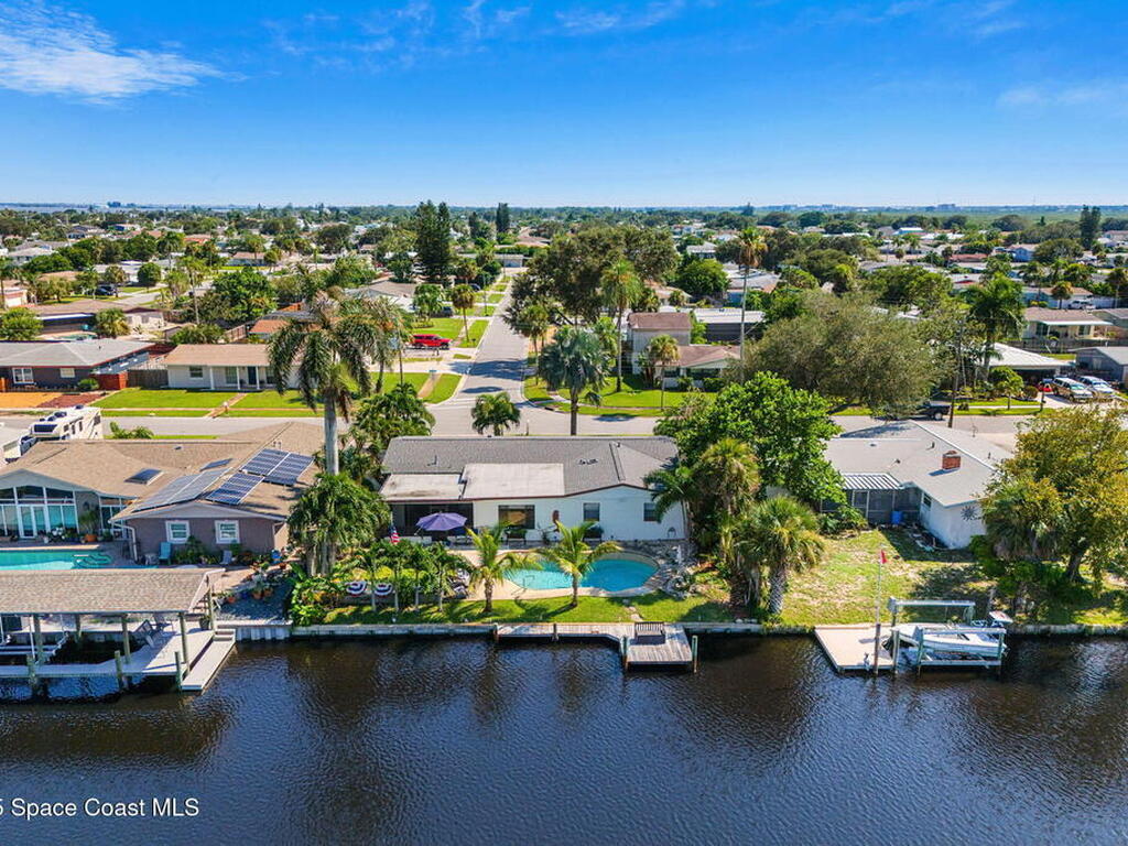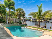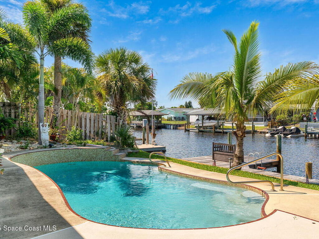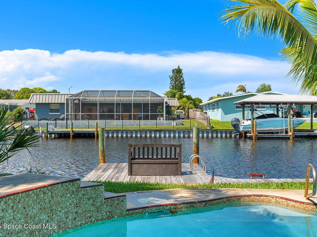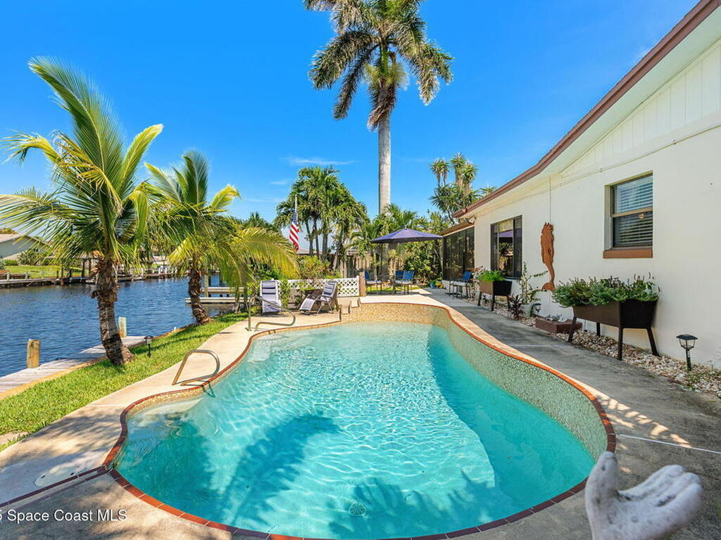 Live the waterfront lifestyle in Holiday Cove. This single story 3 bedroom, 2 bathroom canal front pool home offers easy access to the Banana River and Ulumay Wildlife Sanctuary via a deep water canal. The oversized covered lanai and tropical pool area create the perfect setting to relax or entertain while enjoying stunning water views. Inside, you'll find nearly 1, 900 square feet of living space with original terrazzo floors, a modernized kitchen with gas range, tile backsplash, and stainless steel appliances. Other updates include a new HVAC system and sleeved plumbing. The home is move in ready with room for cosmetic updates and personal touches. No HOA and located just around the corner from Kelly Park boat ramp and only 10 minutes to Cape Canaveral Beach and Port Canaveral.