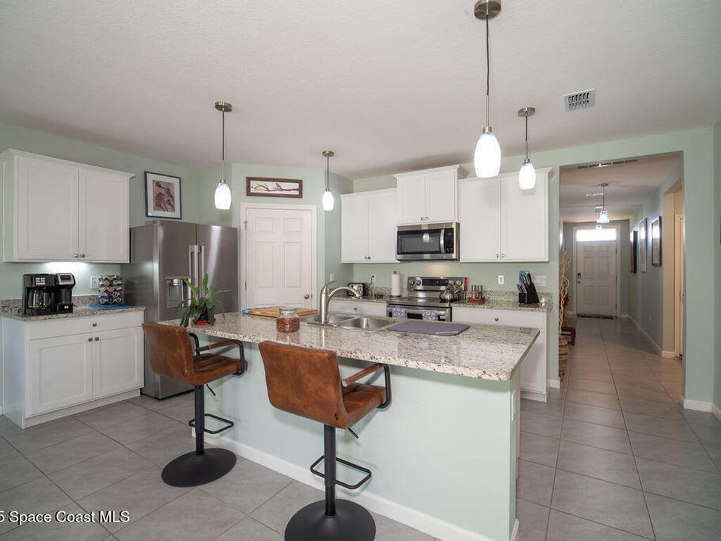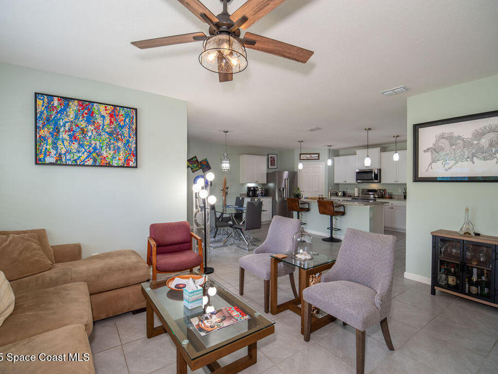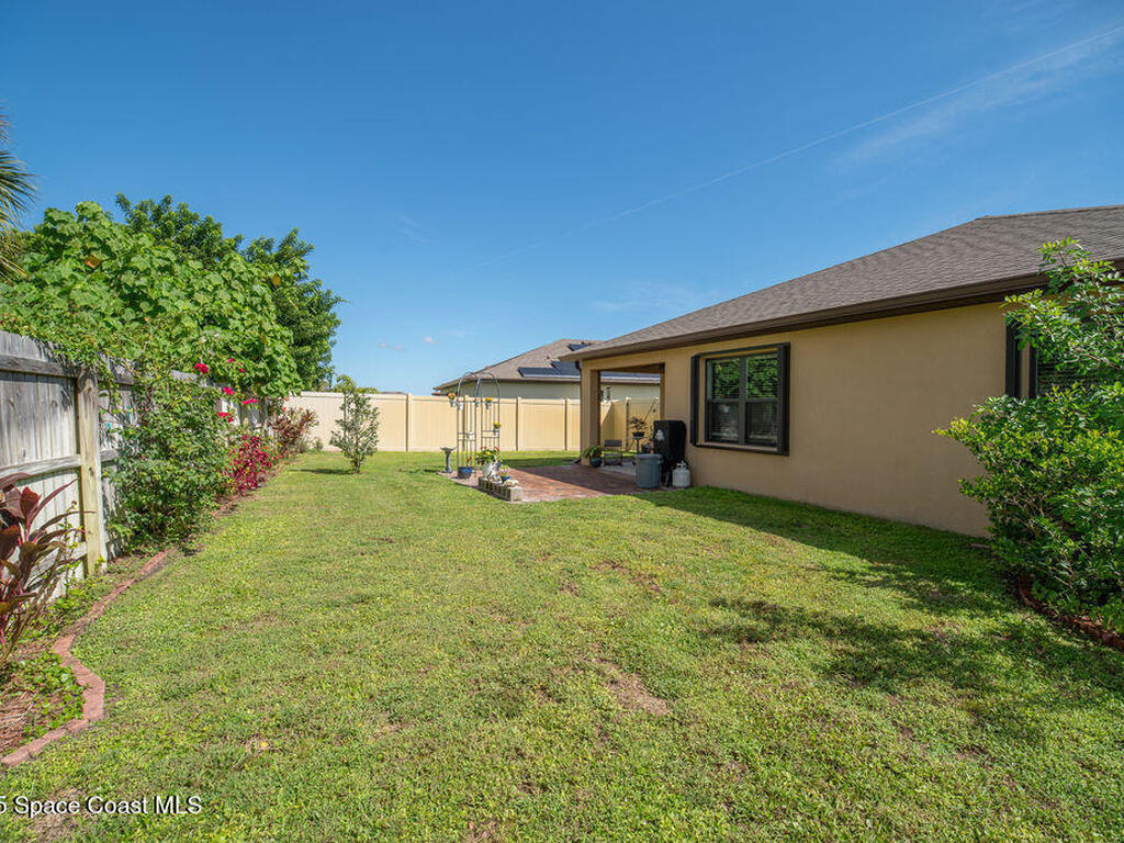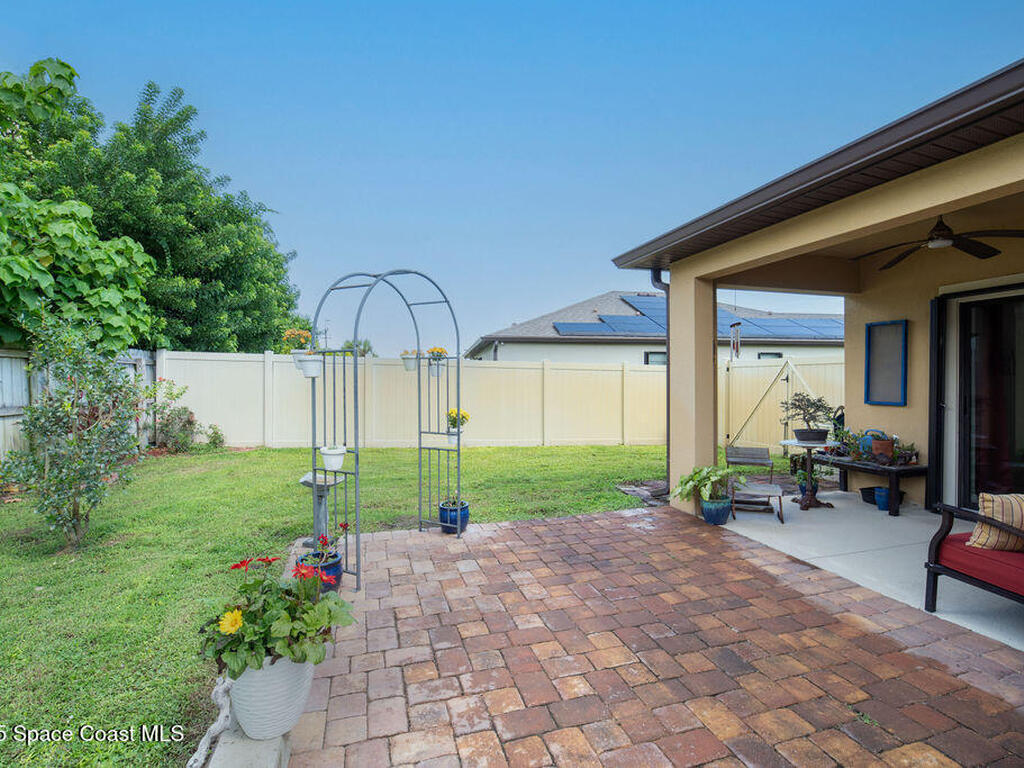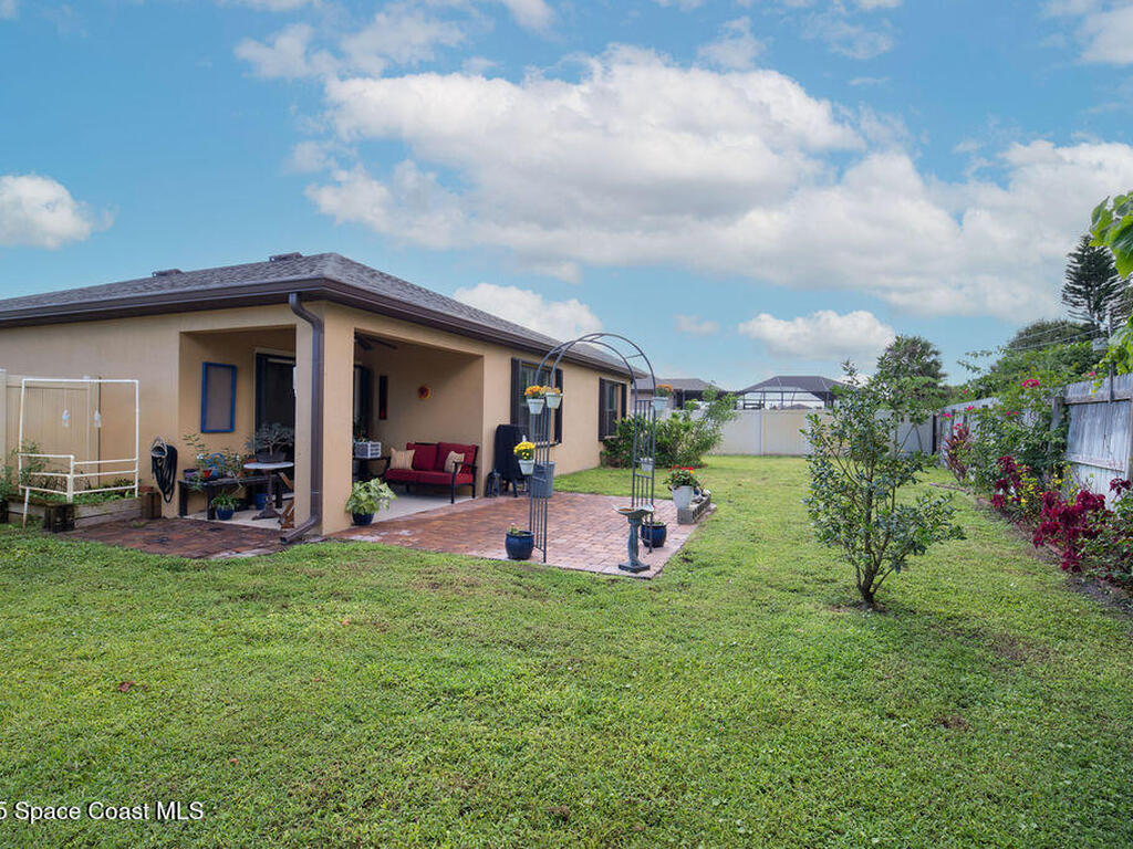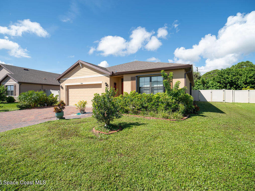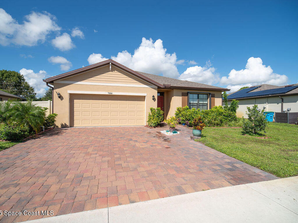 Welcome to 7386 Amethyst Avenue, a stunning move-in ready home located in the highly desirable Crystal Bay community of Grant/Valkaria, Florida. This newer construction residence features the popular Cali floorplan, offering a spacious single-story layout with four bedrooms, two full bathrooms, and a two-car garage. The heart of the home is a large kitchen island that seamlessly connects to the dining area and living room, creating an open-concept space perfect for entertaining or everyday living. The owner's suite is a true retreat, complete with a walk-in shower, double vanity, generous walk-in closet, and a separate linen closet for added convenience. Stunning expanded pavered drive & patio! The home is outfitted with stainless steel appliances, window blinds, and smart home technology through America's Smart Home system, allowing you to control key features from your phone with ease. Not to mention a 440 plug in the garage for EV charging!