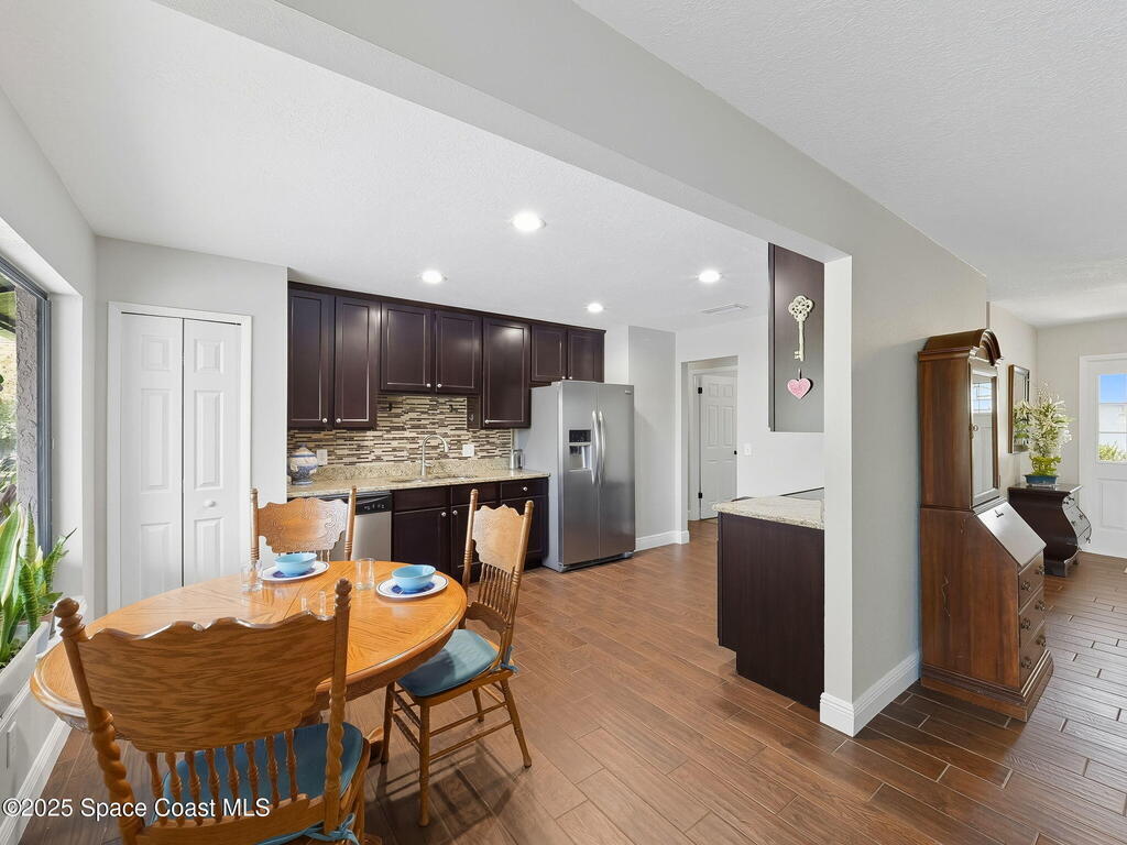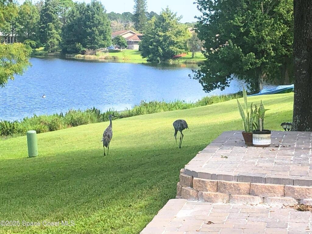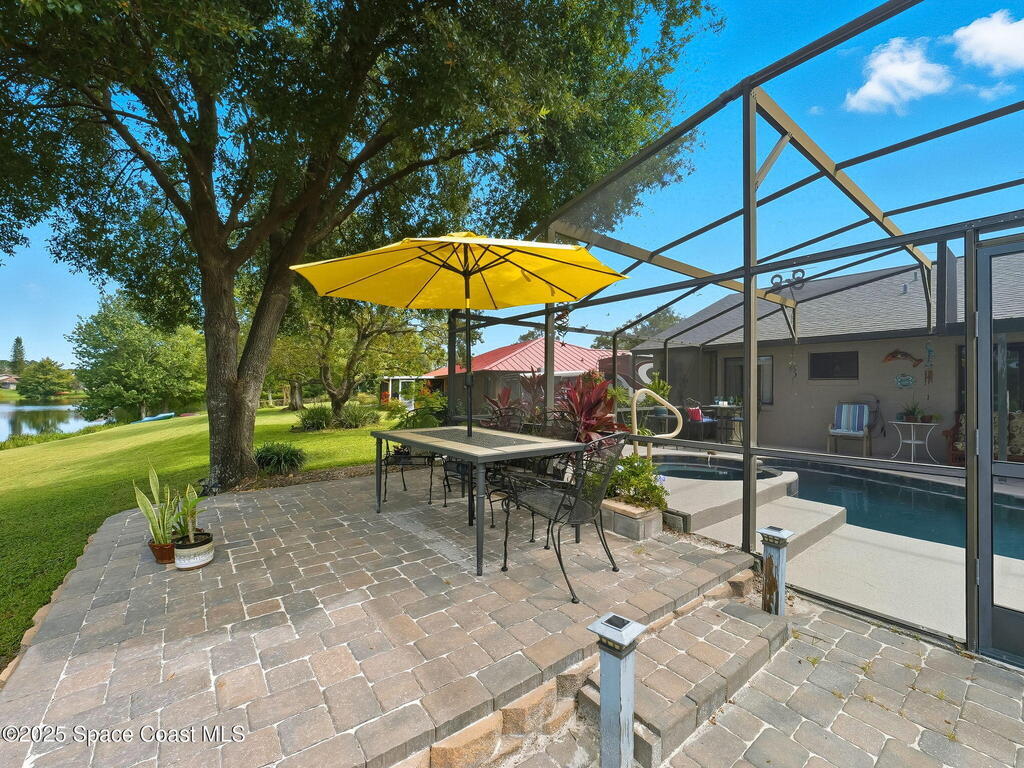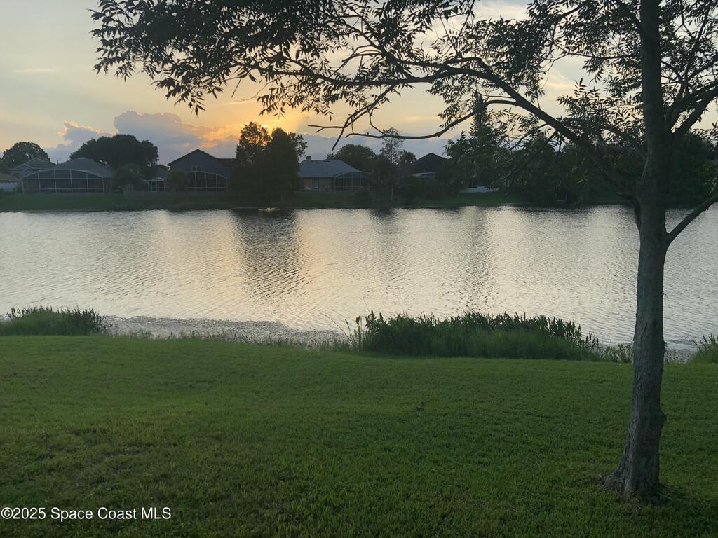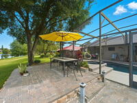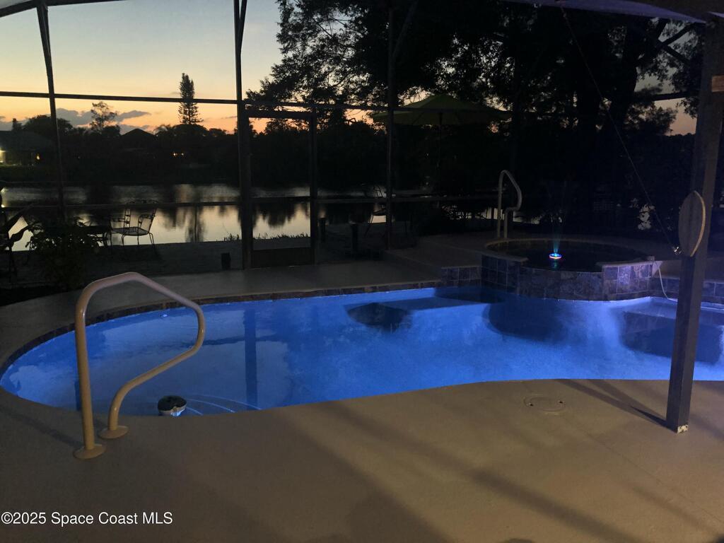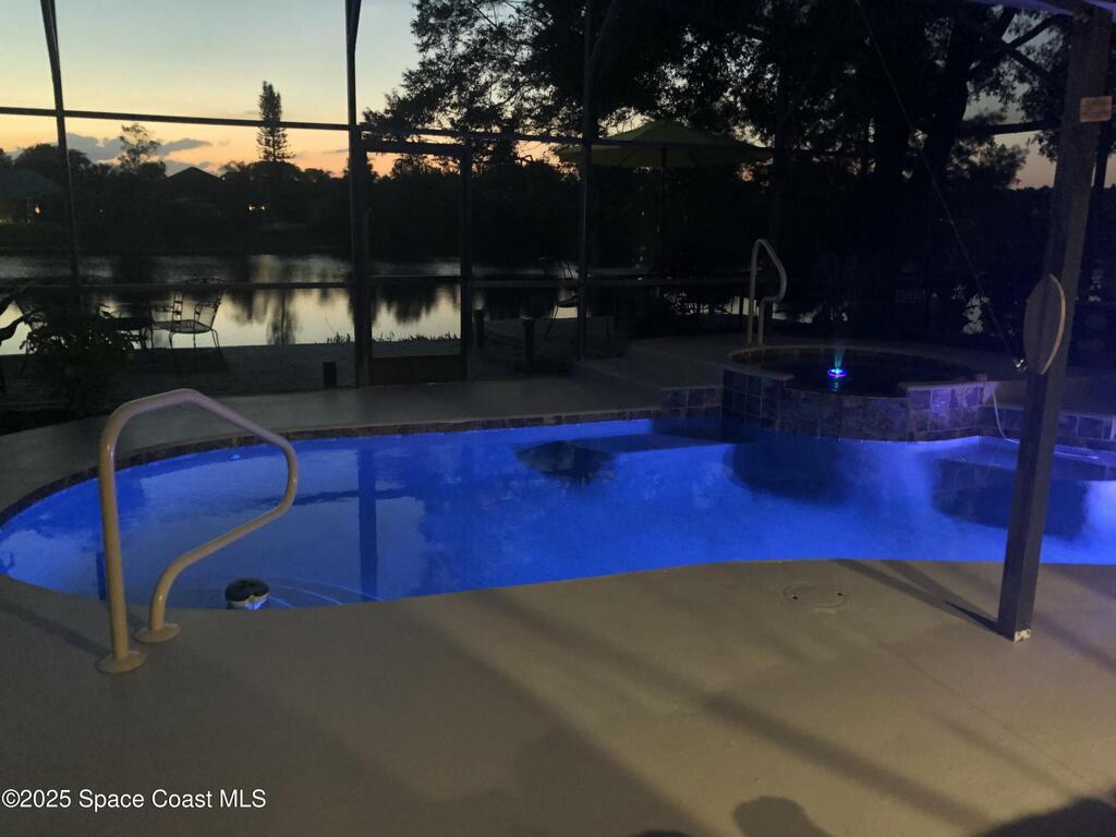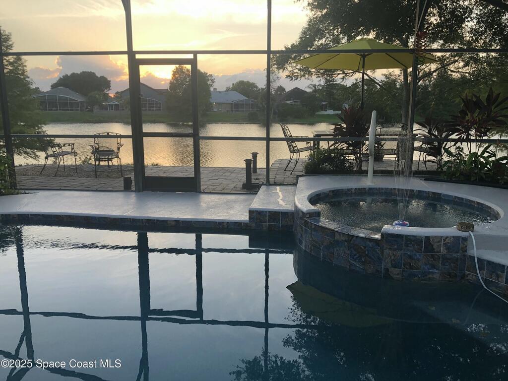 Stunning sunset views of pool, spa, and lake! Enjoy relaxing poolside watching the wildlife while enjoying the spa or a swim after a long day at work. The kitchen, breakfast nook, family room, and primary bedroom all overlook the pool and lake. Owners have upgraded interior flooring to luxury vinyl plank floors in the bedrooms and wood-look tile floors in all other rooms throughout. Kitchen has stainless-steel appliances. The bonus room which also features a private door access in the back would be great as an office, in-law suite, or formal dining. The family room has a corner electric fireplace that turns on with a flip of a switch and the TV over the fireplace can stay. The pool has changing lights perfect to change according to the mood. The spa has a waterfall over splash to the pool heating pool in cooler months if needed. Boats without motors like a canoe are allowed. Community golf, park, pickleball, volleyball, playground, walking trail, ballfield, pavilion and clubhouse.