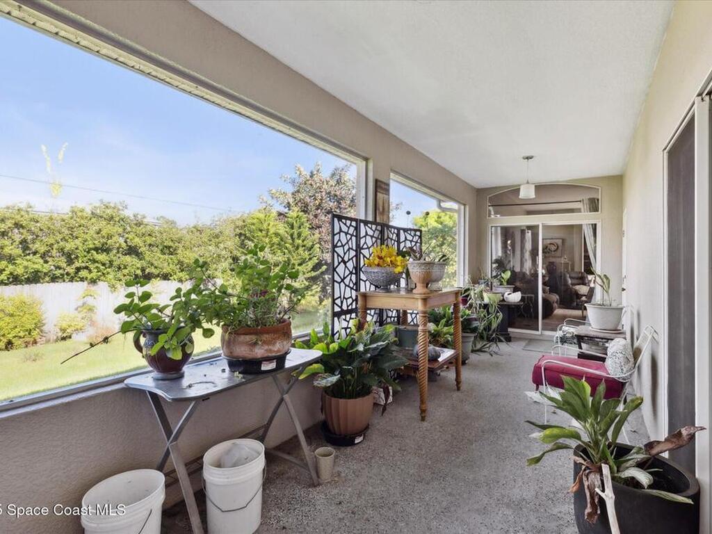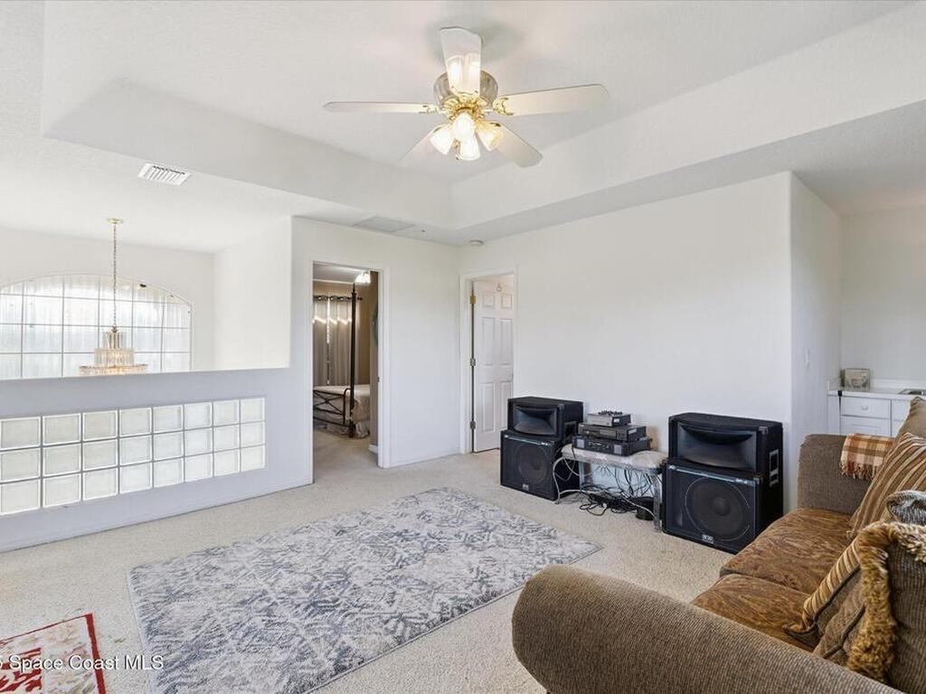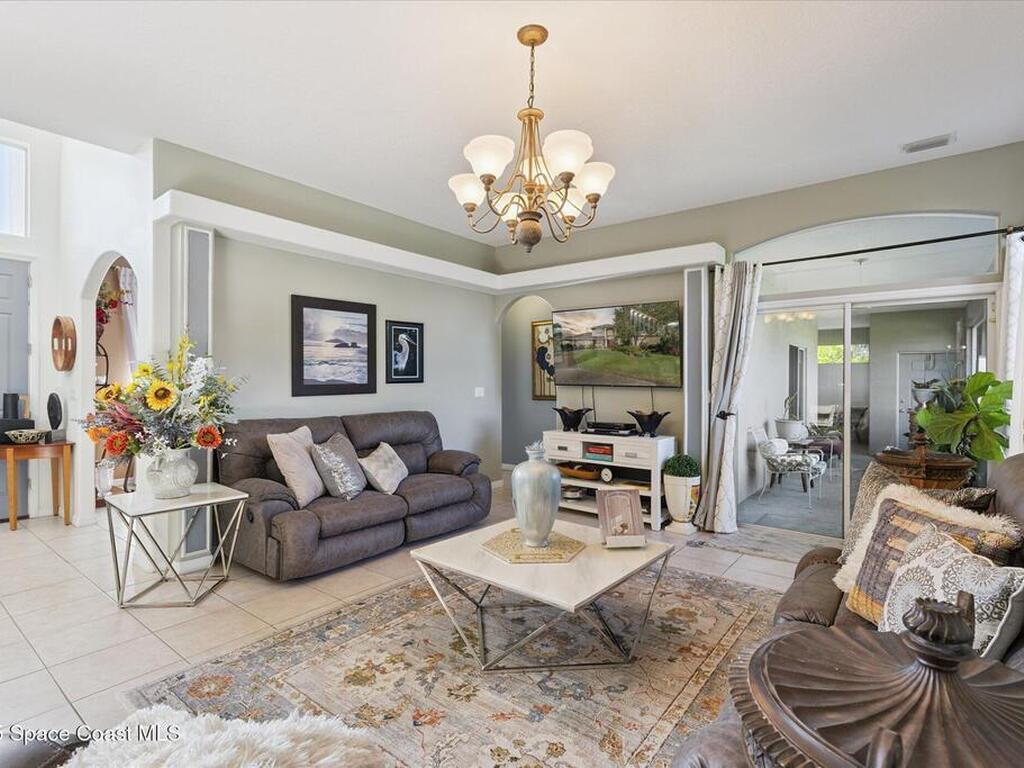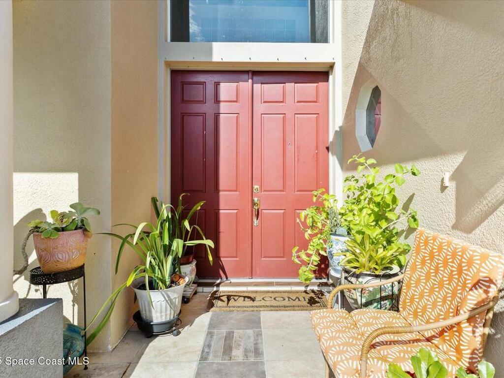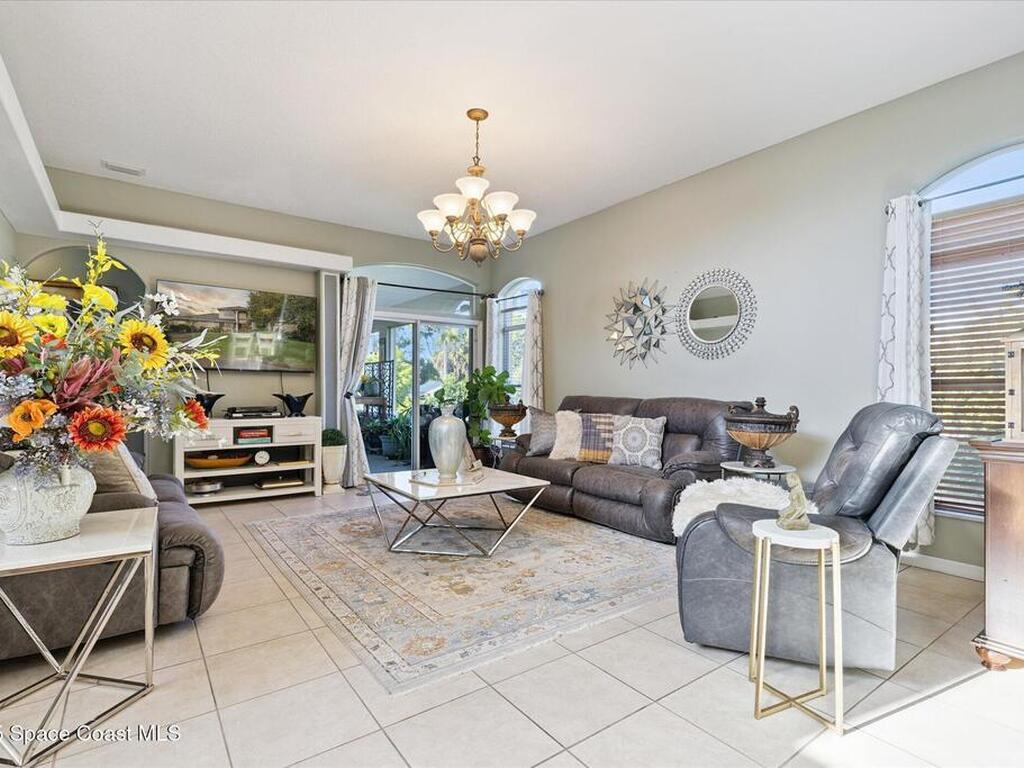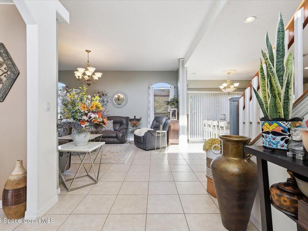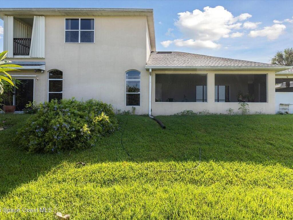 Remarkable 4BD/3BA custom-built home on an oversized lot at the end of a quiet cul-de-sac in Lockmar's prestigious Reserve! Peaceful location with no through traffic, yet close to schools and amenities. Inside, soaring 18-30 ft ceilings, a dramatic foyer with chandelier, and arched windows fill the home with light. The updated kitchen offers granite counters & stainless appliances. A versatile bonus room with private entrance makes an ideal office, in-law, or guest suite. Upstairs features a spacious suite with full bath, wet bar & balcony--perfect for coffee or evening relaxation. The master suite boasts oversized walk-in closets, double vanities, walk-in shower & jetted Jacuzzi tub framed by glass block accents. Outdoor living includes an L-shaped screened porch with hot tub space, lush garden, fruit trees & sprinkler system. Major updates: Roof, AC & Water Heater (2024). A truly one-of-a-kind home in one of Palm Bay's most sought-after neighborhoods!