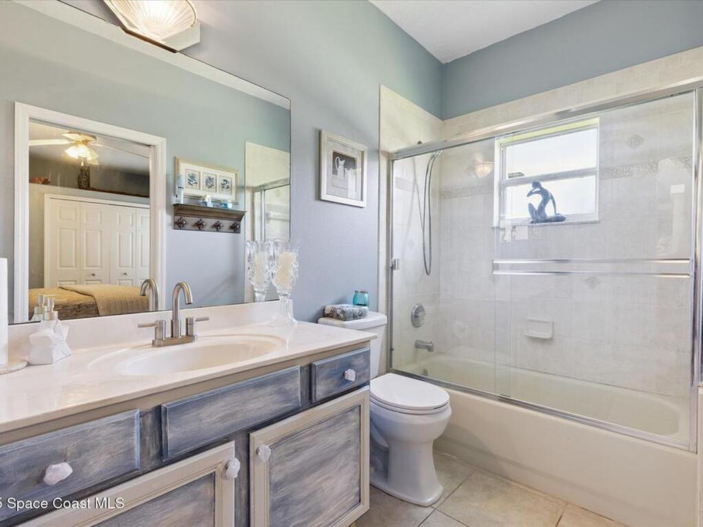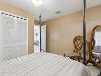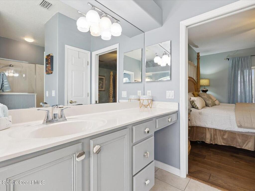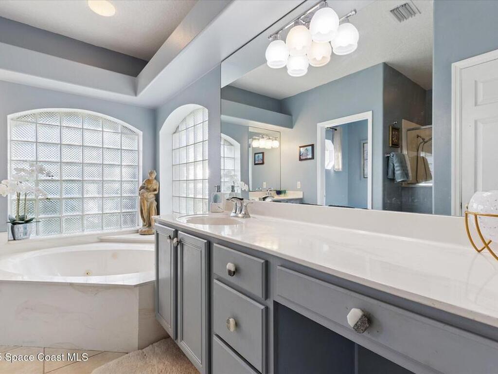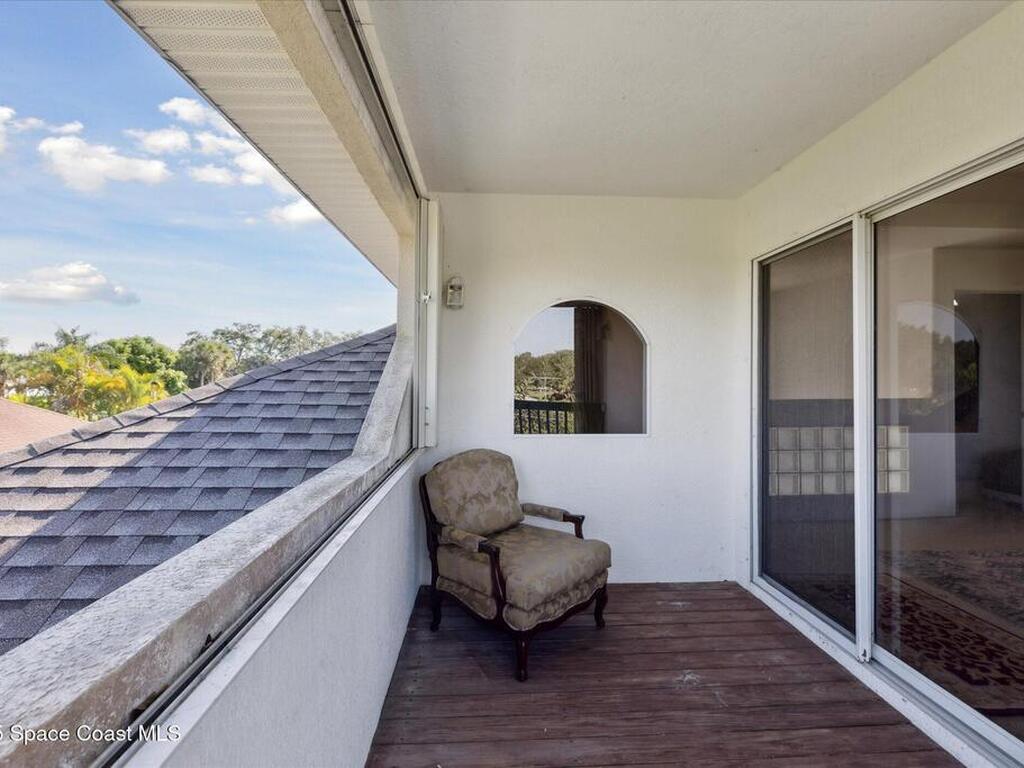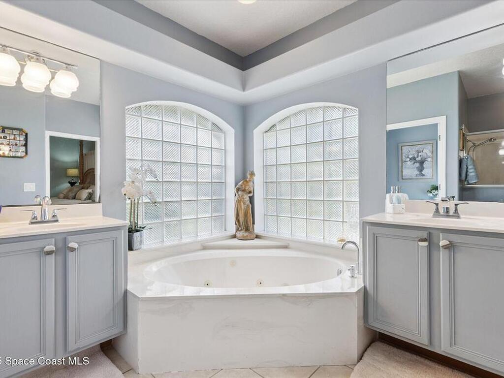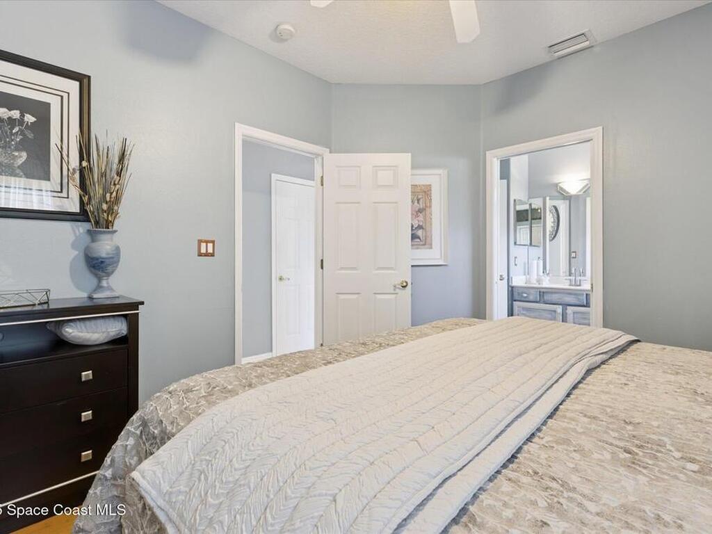 Remarkable 4BD/3BA custom-built home on an oversized lot at the end of a quiet cul-de-sac in Lockmar's prestigious Reserve! Peaceful location with no through traffic, yet close to schools and amenities. Inside, soaring 18-30 ft ceilings, a dramatic foyer with chandelier, and arched windows fill the home with light. The updated kitchen offers granite counters & stainless appliances. A versatile bonus room with private entrance makes an ideal office, in-law, or guest suite. Upstairs features a spacious suite with full bath, wet bar & balcony--perfect for coffee or evening relaxation. The master suite boasts oversized walk-in closets, double vanities, walk-in shower & jetted Jacuzzi tub framed by glass block accents. Outdoor living includes an L-shaped screened porch with hot tub space, lush garden, fruit trees & sprinkler system. Major updates: Roof, AC & Water Heater (2024). A truly one-of-a-kind home in one of Palm Bay's most sought-after neighborhoods!
