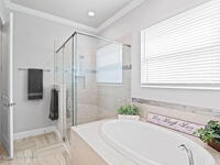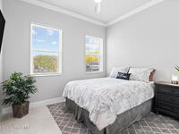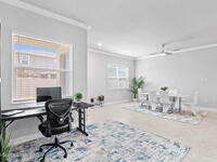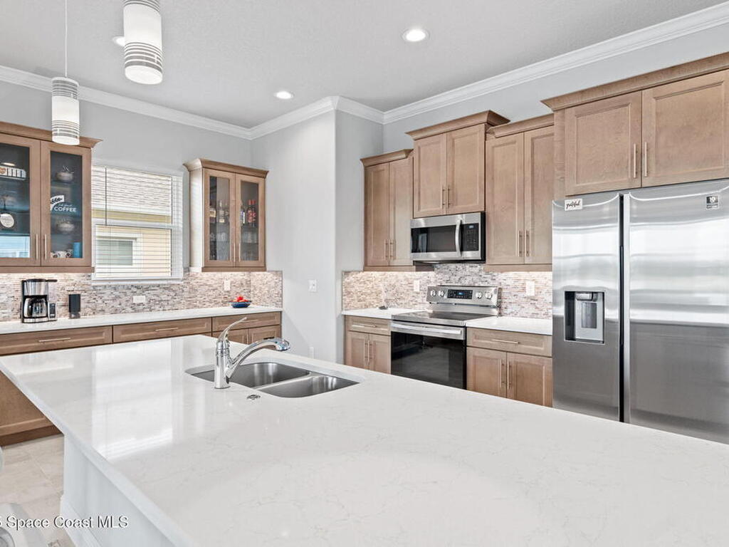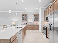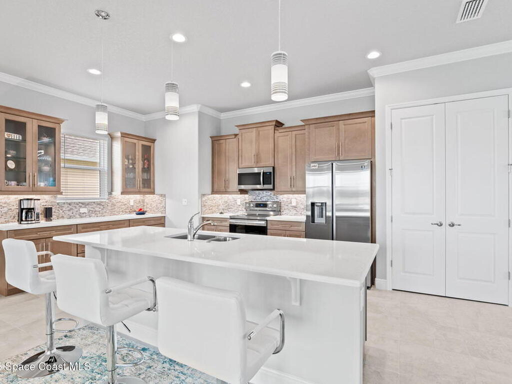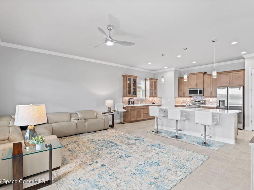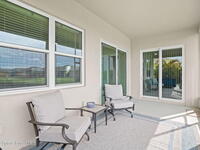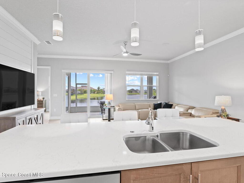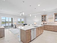 Built in 2021 by Lifestyle Homes, this stunning Tahitian model offers 3 bedrooms, 2 bathrooms, a flex/office space, and 1, 978 sq. ft. of living space on an oversized lot. Step into a bright, open-concept floor plan with 10-foot ceilings, 8-foot doors, crown molding, abundant recessed lighting, and 20-inch tile flooring throughout. Walls of impact-rated windows and sliders fill the home with natural light while framing magnificent lake views from your family room, gourmet kitchen, screened patio, and master suite. The chef's kitchen is the centerpiece of this home--boasting a 9-inch quartz island, custom soft-touch cabinetry, buffet area, large double-door pantry, mosaic tile backsplash, under-cabinet lighting, and stainless steel appliances. A custom shiplap wall accents the great room, seamlessly connecting the entertaining spaces. The spacious master retreat offers serene lake views, a large walk-in closet, and a spa-like bath featuring a frameless glass shower with decorative
