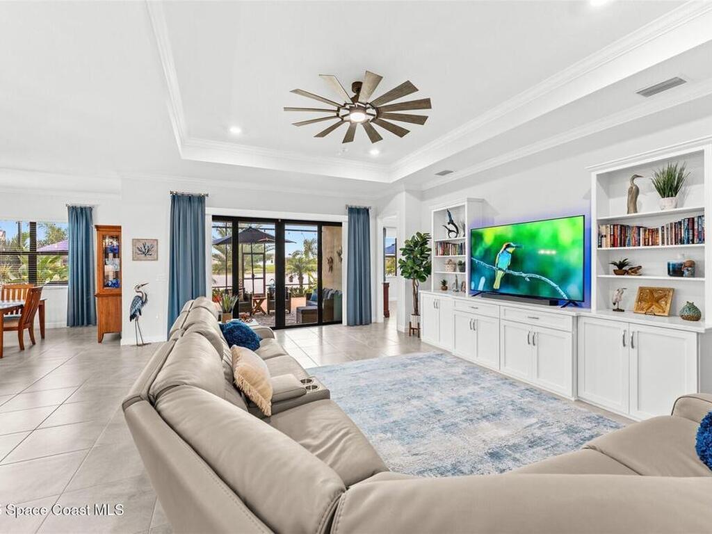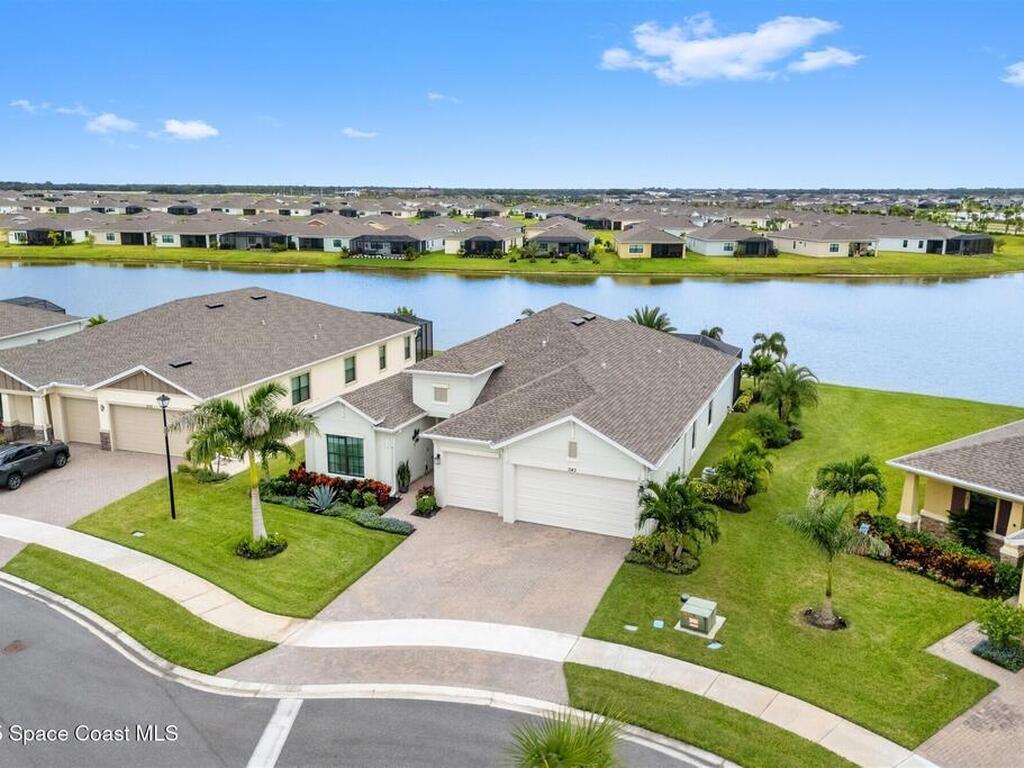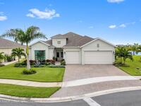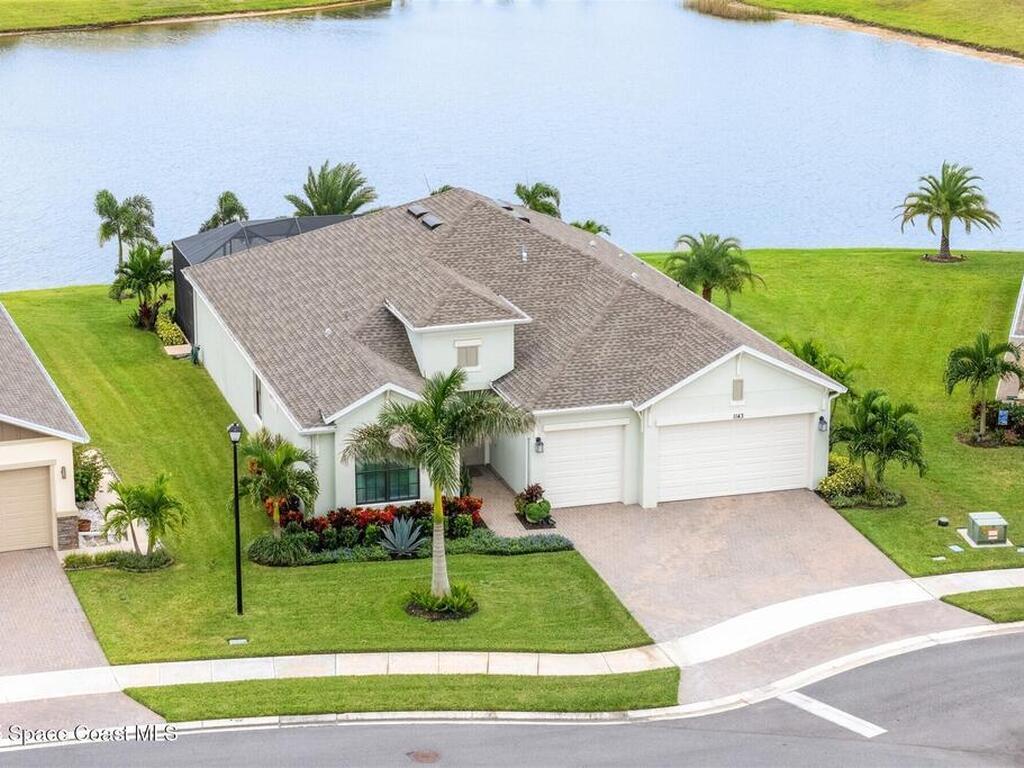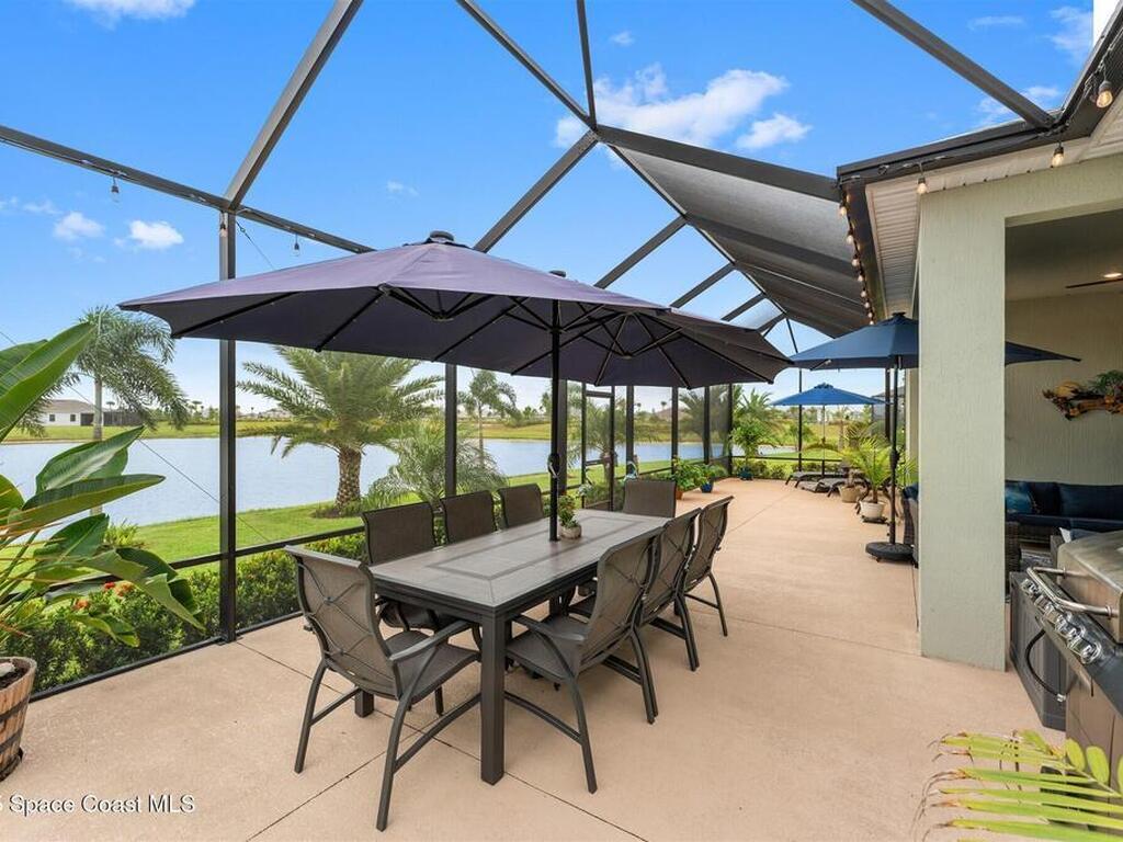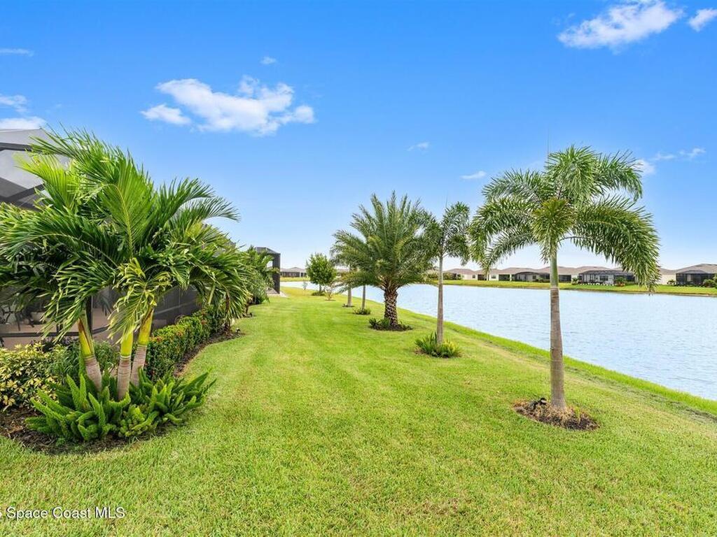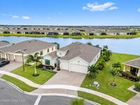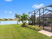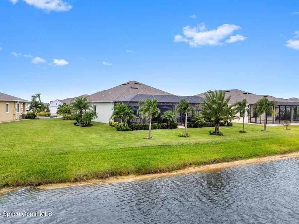 Waterfront luxury in Bridgewater, Viera's 55+ resort style gated community! This striking 3-bedroom + den, 3-bath, 3-car garage home was inspired by the builder's decorated model and features elegant upgrades such as custom shiplap accent walls and designer trim plus great room built-ins! Additional ''must-have'' features include IMPACT WINDOWS & SLIDERS, tile and crown molding throughout, a gourmet kitchen w/ wall ovens, cooktop and an oversized island. The primary suite boasts a sumptuous bath w/ walk-in shower, soaking tub, and dual walk-in custom closets. Perfect for entertaining, the great room's expansive sliders lead to a stunning 50'x15' screened lanai overlooking the water. And overnight guests enjoy their own en-suite retreat for comfort and privacy. Even the garage impresses with epoxy floors, overhead storage, and 240V outlet for an electric car. Bridgewater's private clubhouse offers a heated pool, spa, fitness center, tennis & pickleball courts, and even a movie theater!