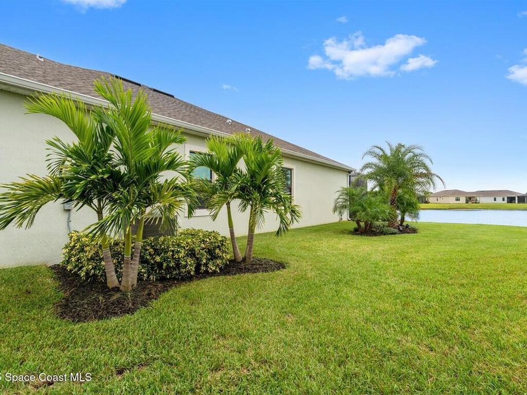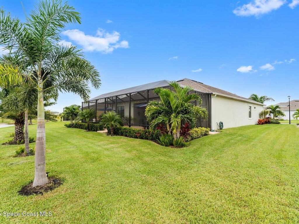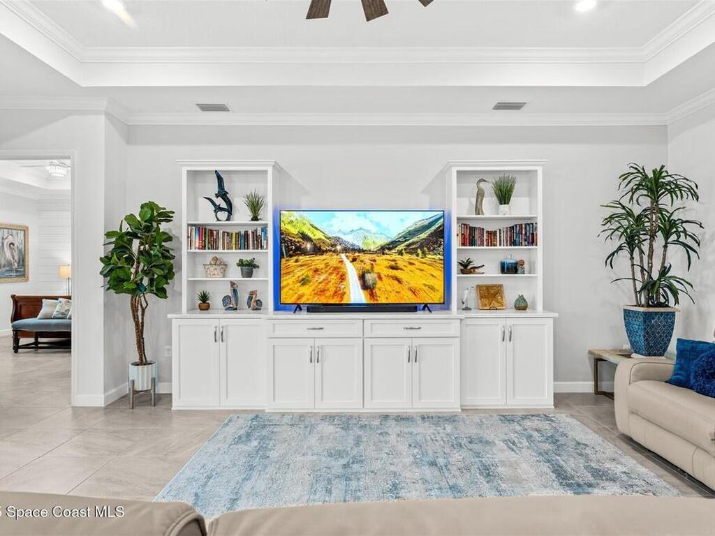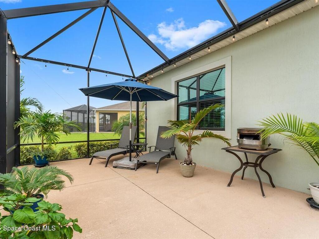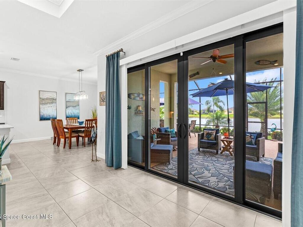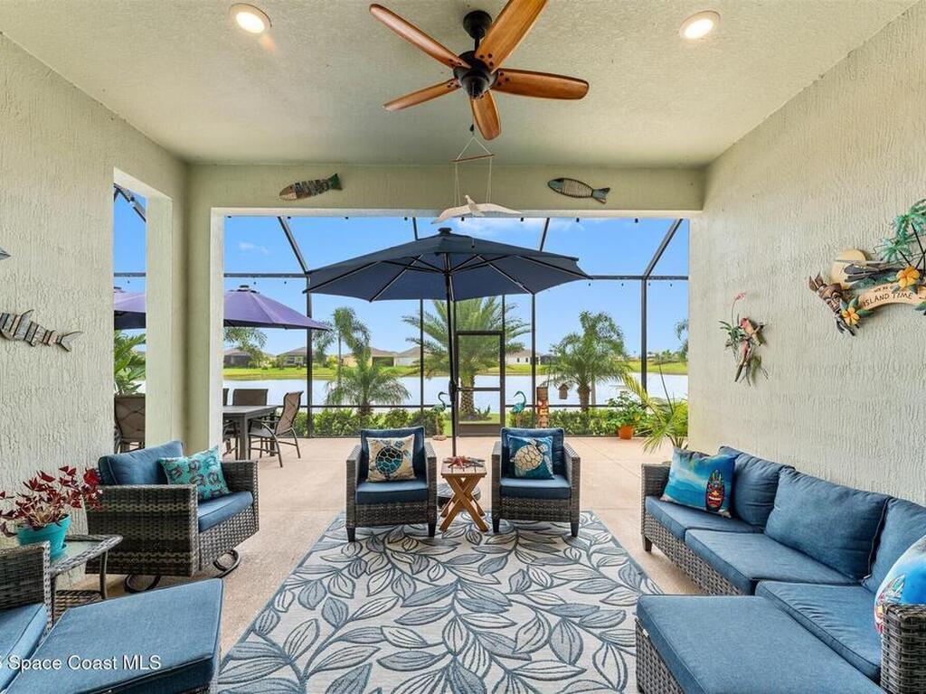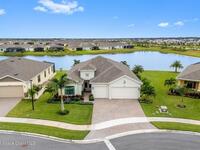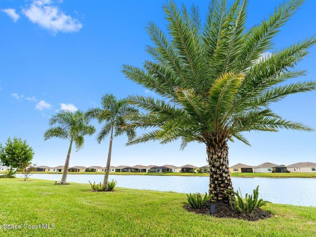 Waterfront luxury in Bridgewater, Viera's 55+ resort style gated community! This striking 3-bedroom + den, 3-bath, 3-car garage home was inspired by the builder's decorated model and features elegant upgrades such as custom shiplap accent walls and designer trim plus great room built-ins! Additional ''must-have'' features include IMPACT WINDOWS & SLIDERS, tile and crown molding throughout, a gourmet kitchen w/ wall ovens, cooktop and an oversized island. The primary suite boasts a sumptuous bath w/ walk-in shower, soaking tub, and dual walk-in custom closets. Perfect for entertaining, the great room's expansive sliders lead to a stunning 50'x15' screened lanai overlooking the water. And overnight guests enjoy their own en-suite retreat for comfort and privacy. Even the garage impresses with epoxy floors, overhead storage, and 240V outlet for an electric car. Bridgewater's private clubhouse offers a heated pool, spa, fitness center, tennis & pickleball courts, and even a movie theater!