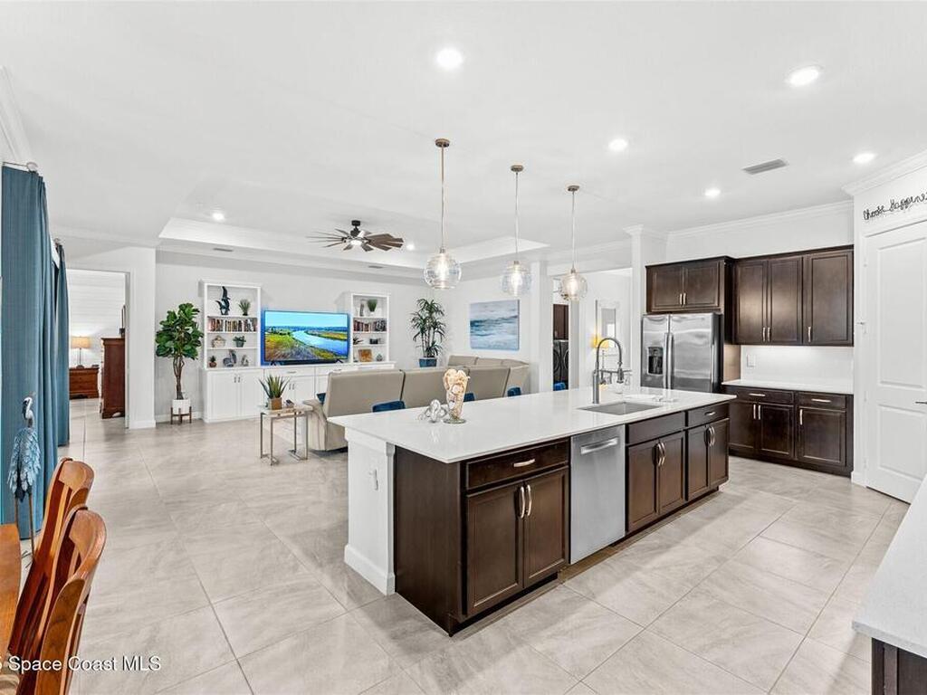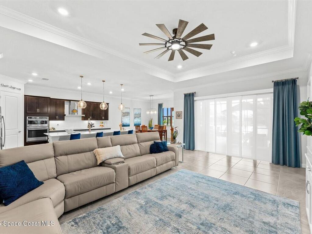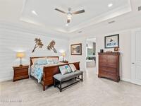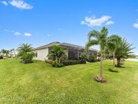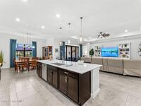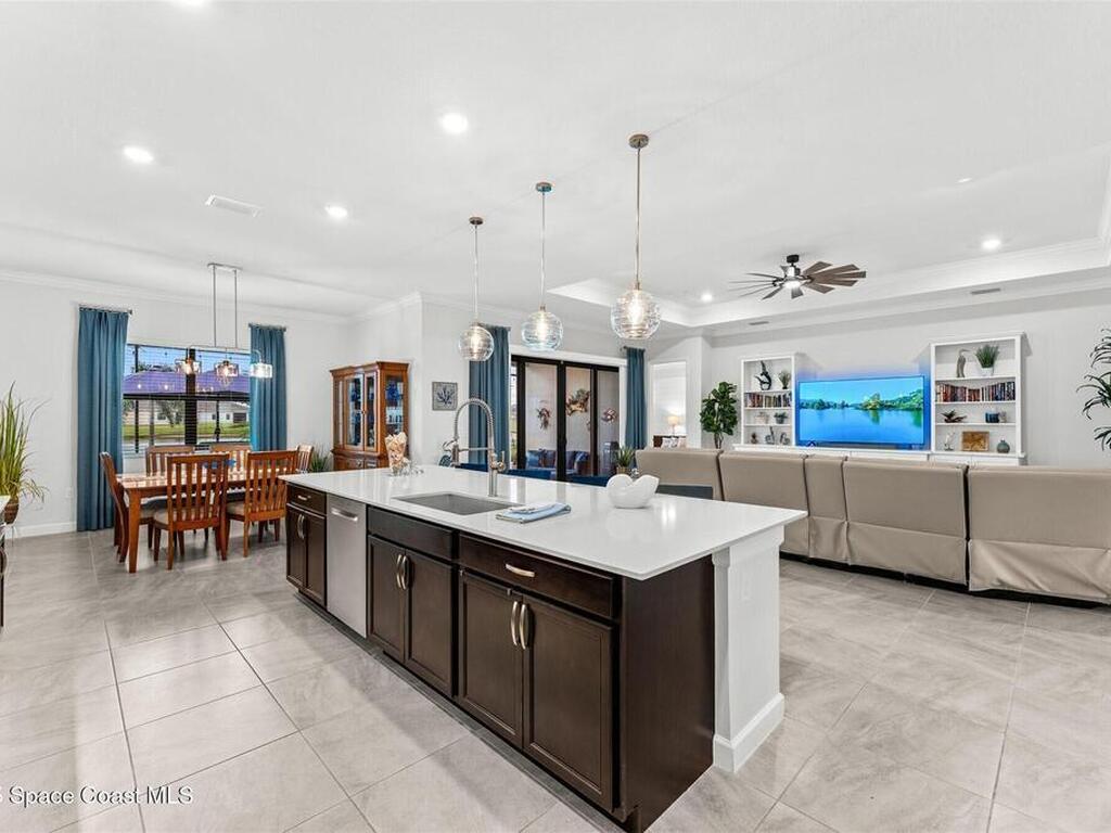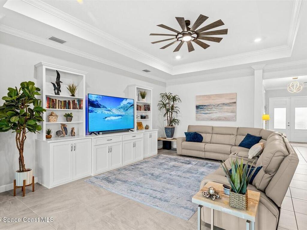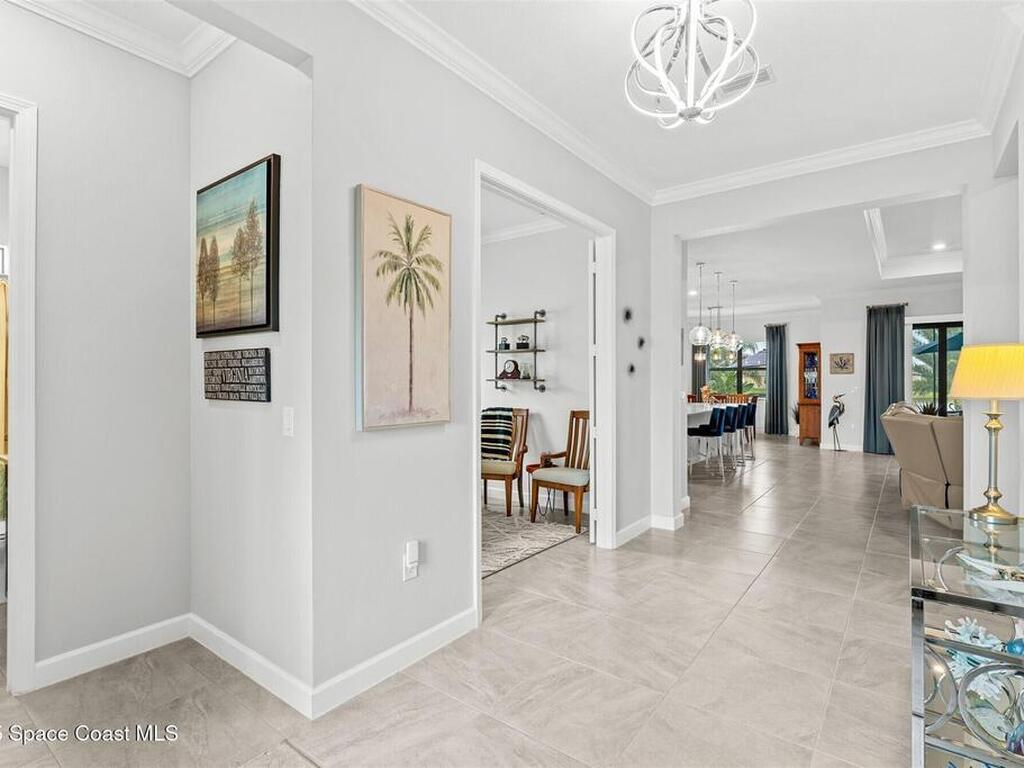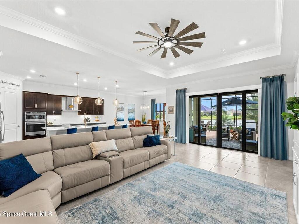 Waterfront luxury in Bridgewater, Viera's 55+ resort style gated community! This striking 3-bedroom + den, 3-bath, 3-car garage home was inspired by the builder's decorated model and features elegant upgrades such as custom shiplap accent walls and designer trim plus great room built-ins! Additional ''must-have'' features include IMPACT WINDOWS & SLIDERS, tile and crown molding throughout, a gourmet kitchen w/ wall ovens, cooktop and an oversized island. The primary suite boasts a sumptuous bath w/ walk-in shower, soaking tub, and dual walk-in custom closets. Perfect for entertaining, the great room's expansive sliders lead to a stunning 50'x15' screened lanai overlooking the water. And overnight guests enjoy their own en-suite retreat for comfort and privacy. Even the garage impresses with epoxy floors, overhead storage, and 240V outlet for an electric car. Bridgewater's private clubhouse offers a heated pool, spa, fitness center, tennis & pickleball courts, and even a movie theater!