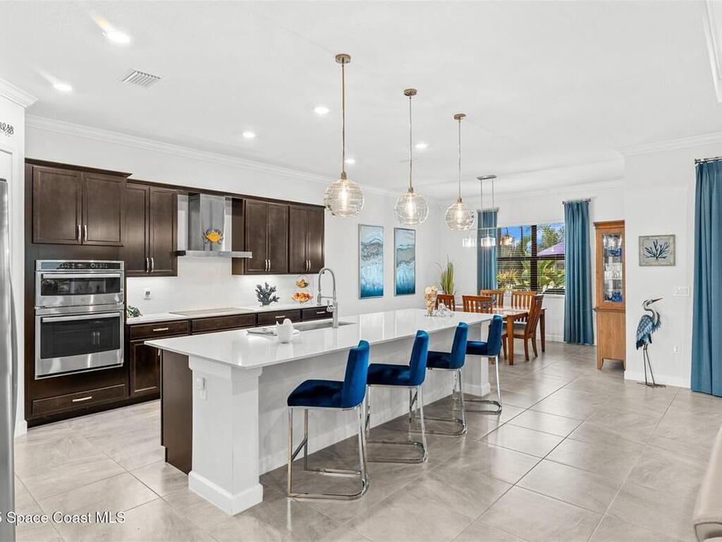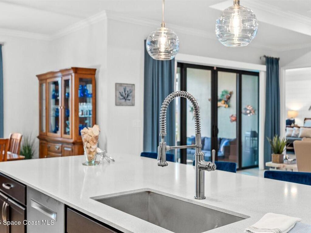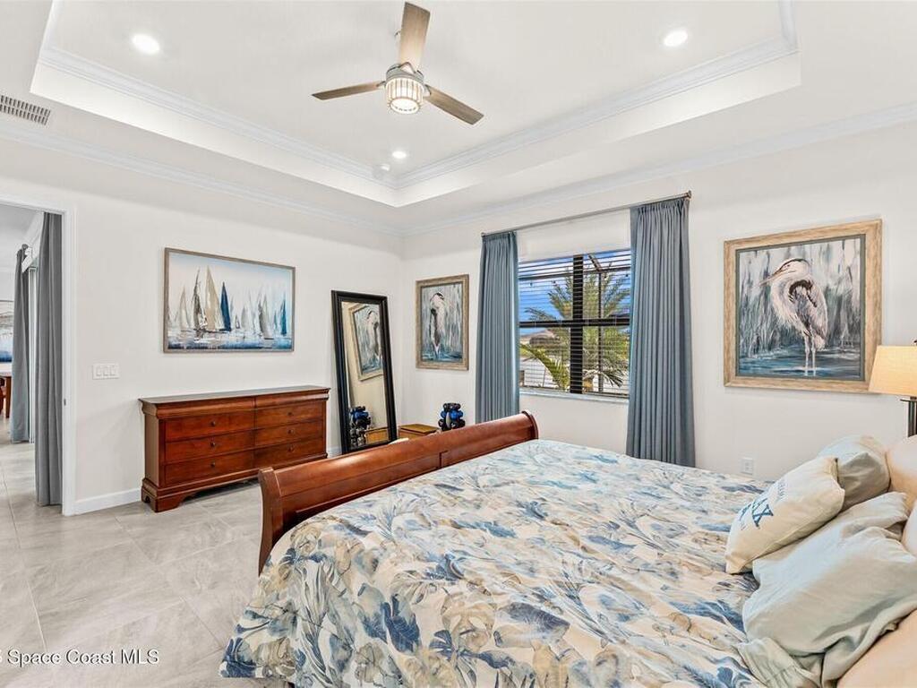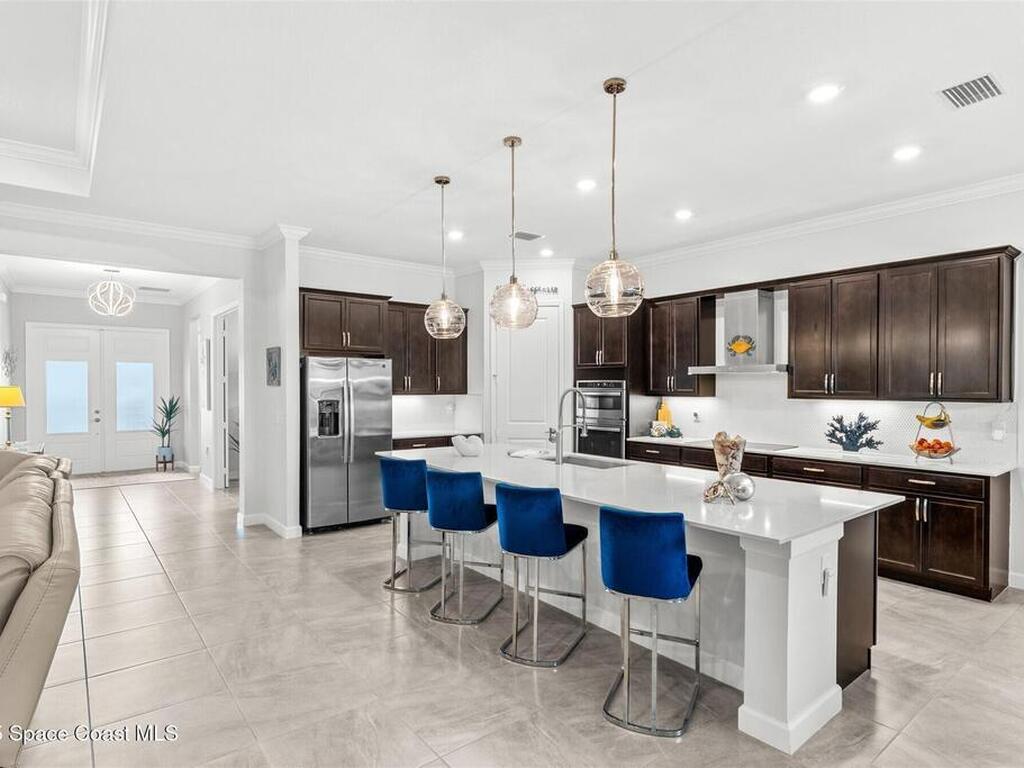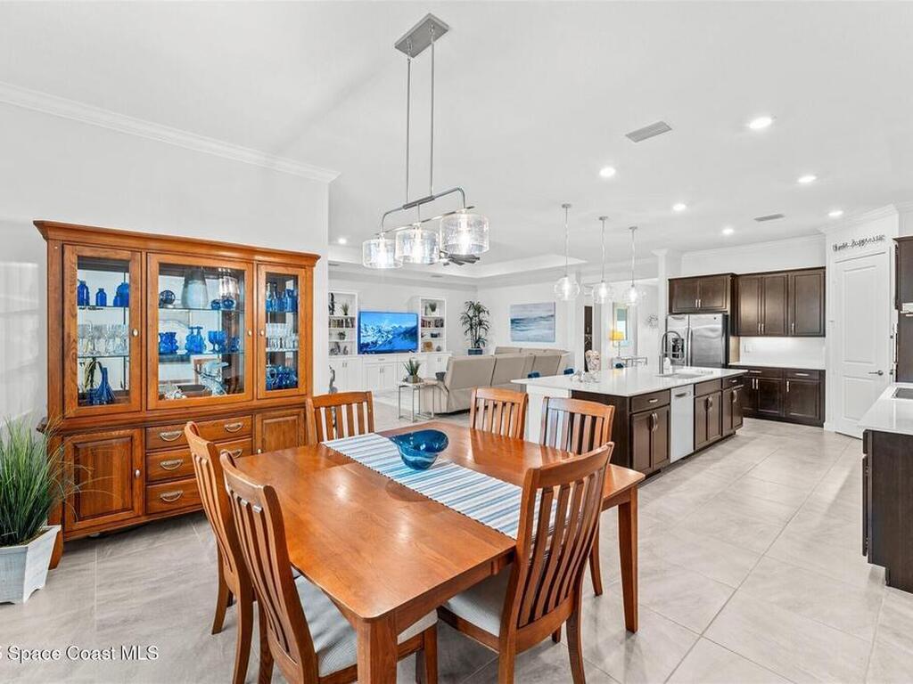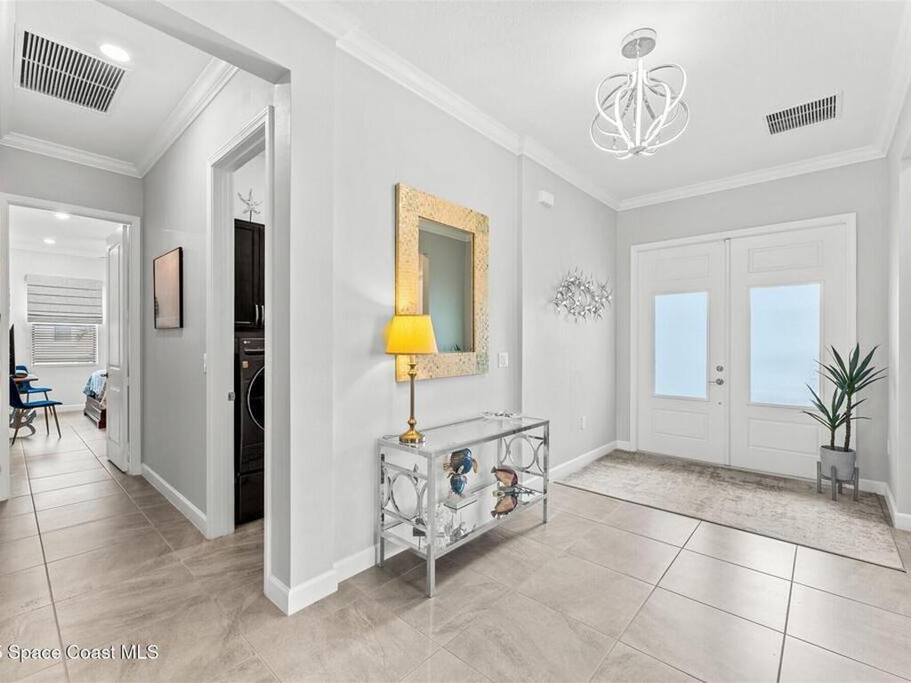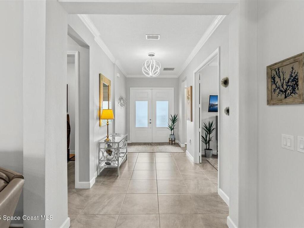 Waterfront luxury in Bridgewater, Viera's 55+ resort style gated community! This striking 3-bedroom + den, 3-bath, 3-car garage home was inspired by the builder's decorated model and features elegant upgrades such as custom shiplap accent walls and designer trim plus great room built-ins! Additional ''must-have'' features include IMPACT WINDOWS & SLIDERS, tile and crown molding throughout, a gourmet kitchen w/ wall ovens, cooktop and an oversized island. The primary suite boasts a sumptuous bath w/ walk-in shower, soaking tub, and dual walk-in custom closets. Perfect for entertaining, the great room's expansive sliders lead to a stunning 50'x15' screened lanai overlooking the water. And overnight guests enjoy their own en-suite retreat for comfort and privacy. Even the garage impresses with epoxy floors, overhead storage, and 240V outlet for an electric car. Bridgewater's private clubhouse offers a heated pool, spa, fitness center, tennis & pickleball courts, and even a movie theater!