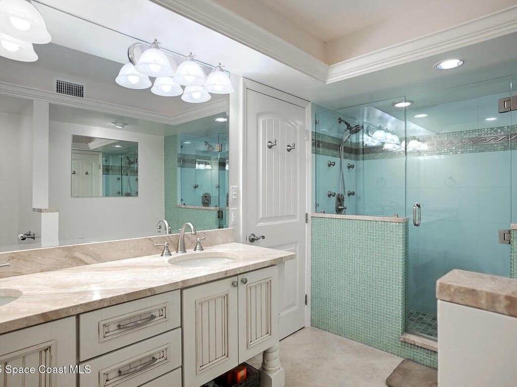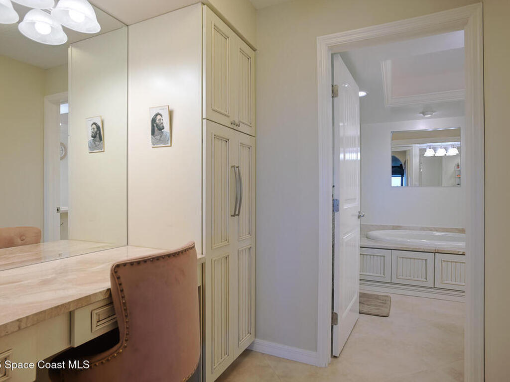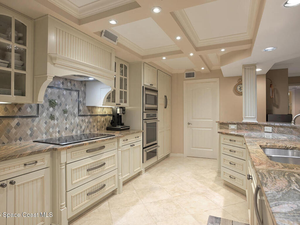 A classic Florida lifestyle awaits you in this beautifully remodeled, spacious 6th floor oceanfront home. A rare opportunity w/East & West facing balconies to enjoy ocean sunrises and Banana River sunsets. This open, well-appointed kitchen is a chef's dream - coffered ceiling, cream wooden beadboard cabinets, antiqued styled paned glass, quality soft close dovetailed drawers, pull-out shelving & drawers. Hi-end appliances - Thermador oven, microwave & warming drawer; Bosch DW; SS LG ThinQ refrigerator; 5 burner induction stove. Floor to ceiling hurricane impact sliders w/cooling fabric blinds. Renovated Primary bath w/double shower heads, lg jacuzzi tub & double sinks. More features: renovated laundry room w/cabinets, closet organizer systems, crown molding & electric shutters. Oversized garage space w/more room than typical & private storage closet. Both Milestone & SIRS are complete and in place for peace of mind. Come explore the quiet & secluded nature that is south Cocoa Beach.