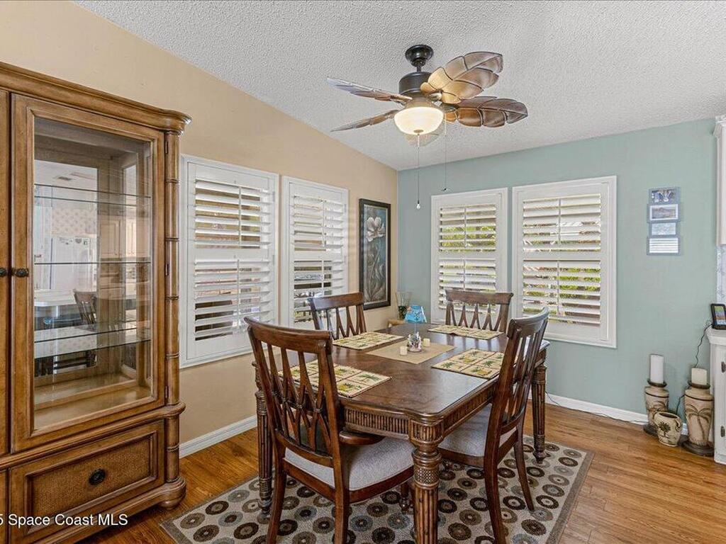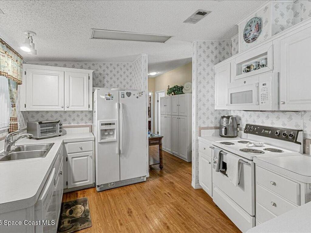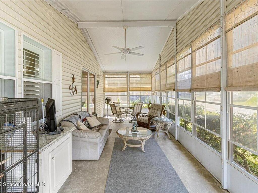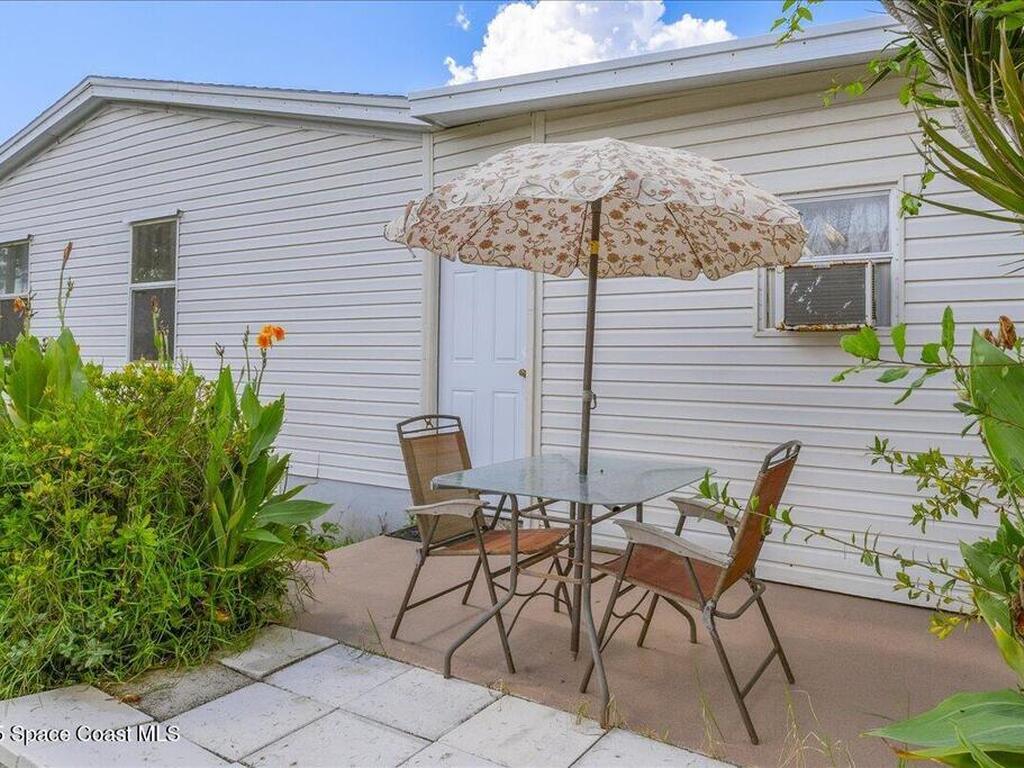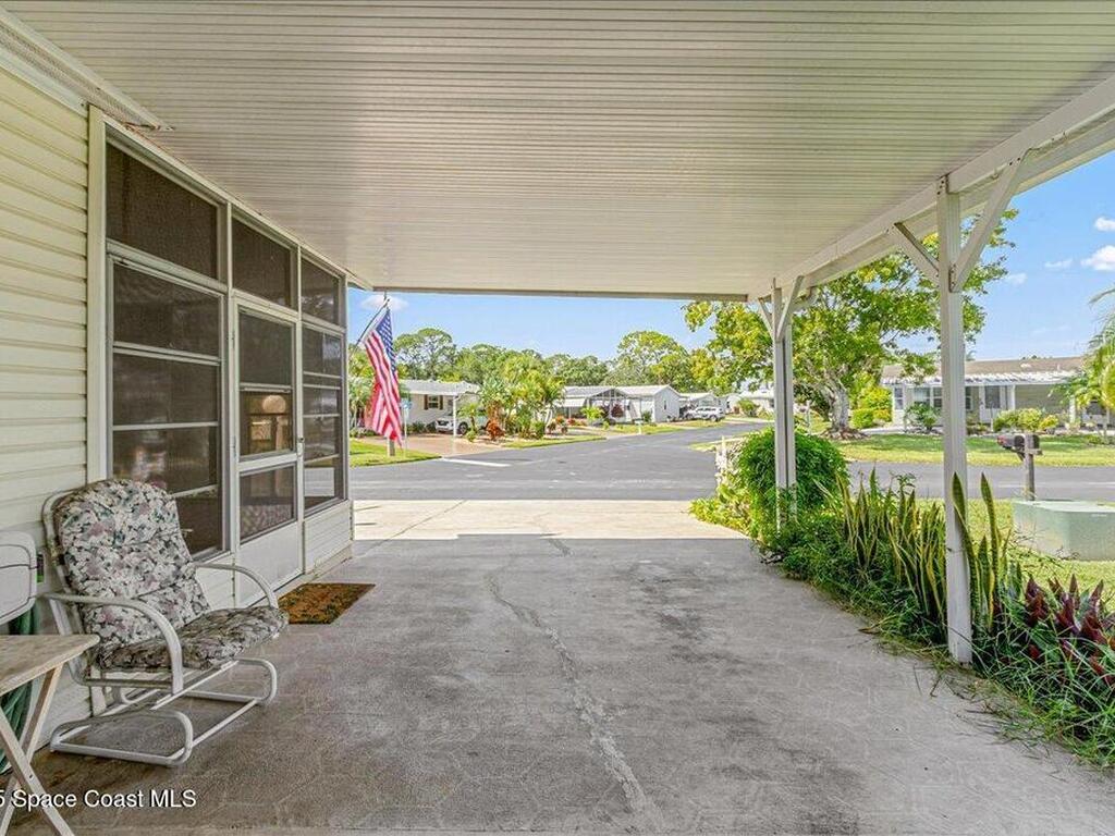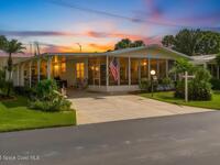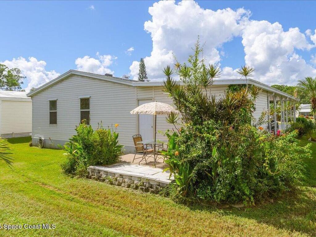 Own your land in this senior community where HOA fees are low and include cable, internet, lawncare and security.This charming 2/2 home has a front and back patio, an oversized.shed and workshop, . Plenty of parking for cars and toys, golfcart, kayak, etc.Community activities aplenty with swimming pool.pickle ball, billiards, plus a card room, just to name a few.Watch rocket launches from your yard.....check it out, you're going to love it!