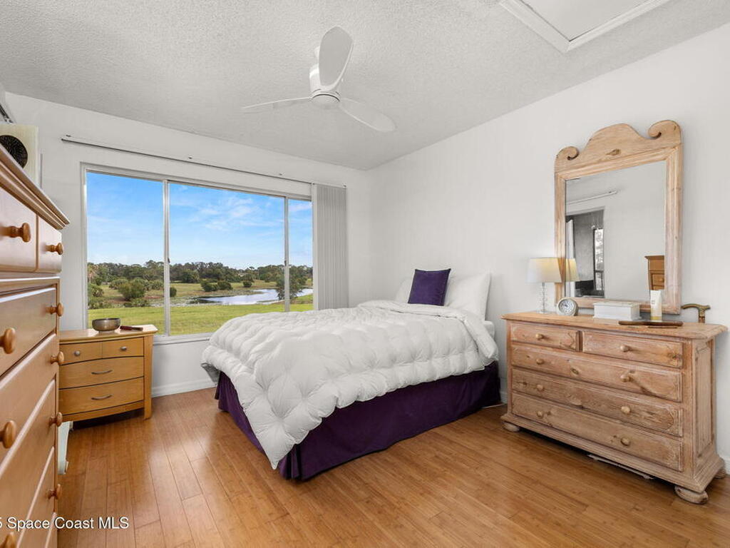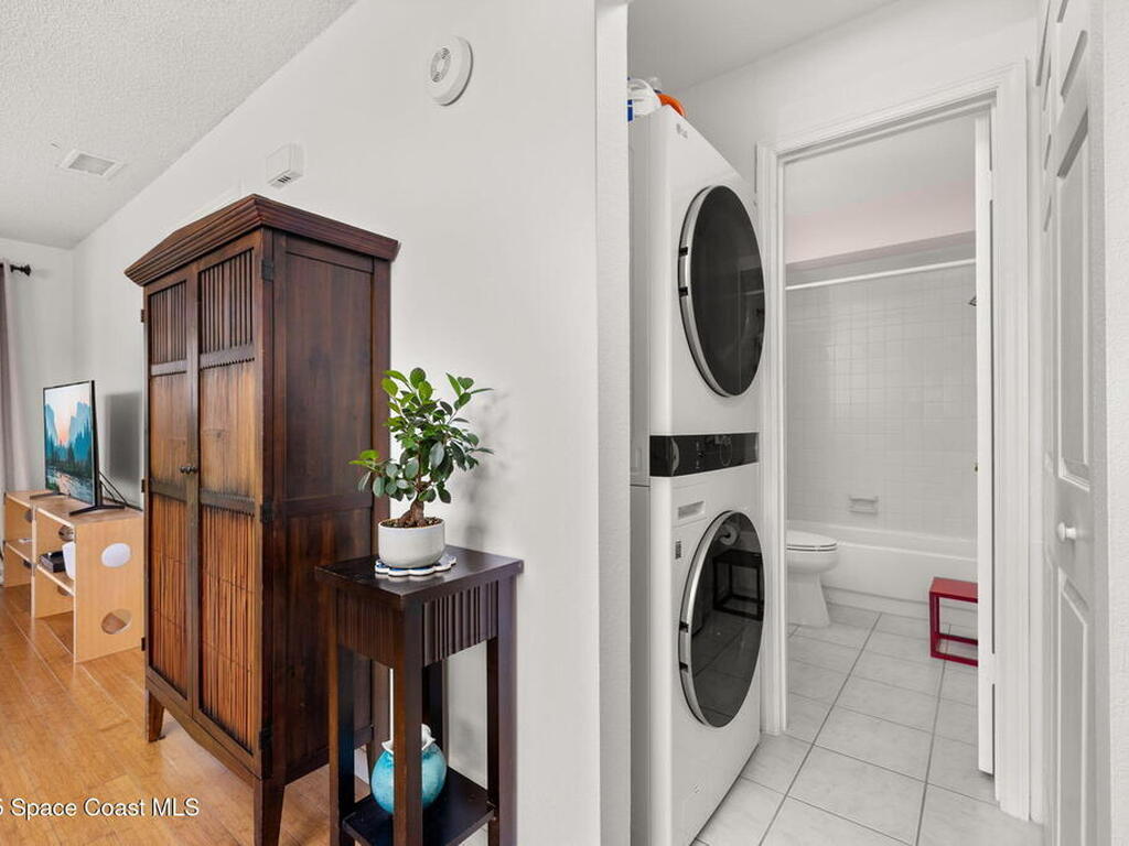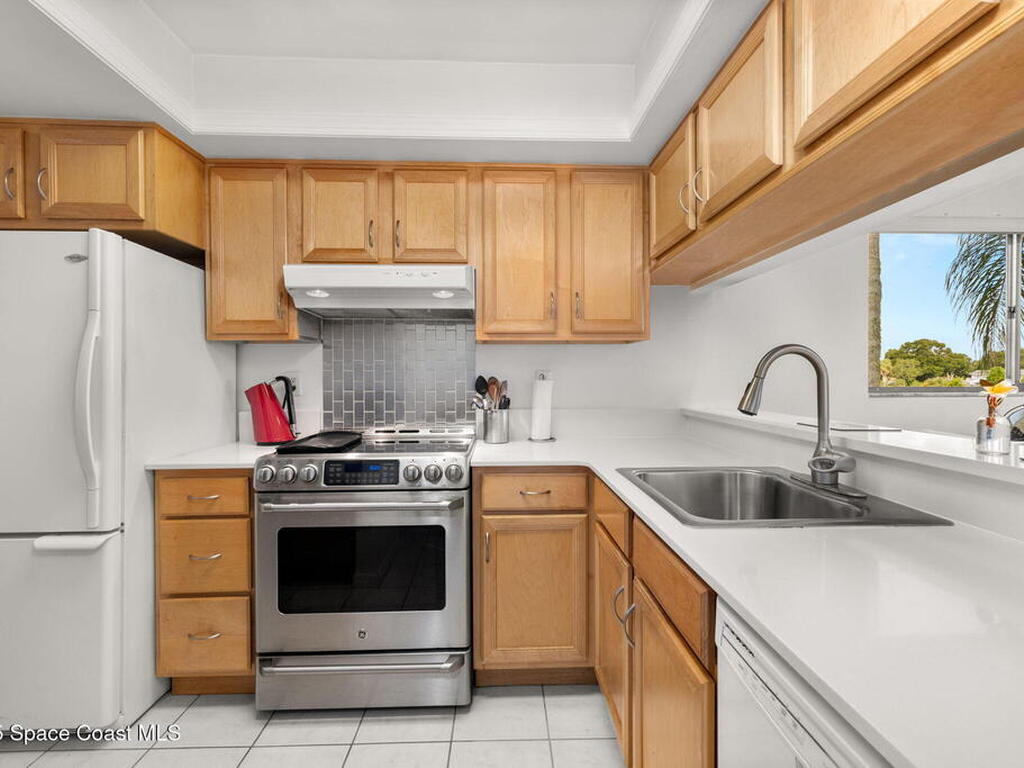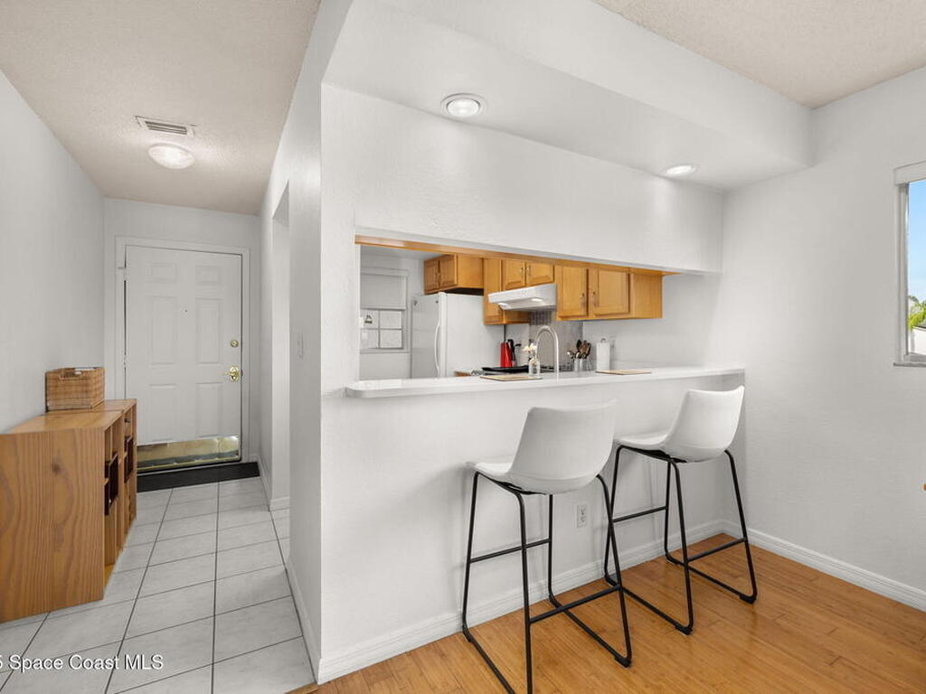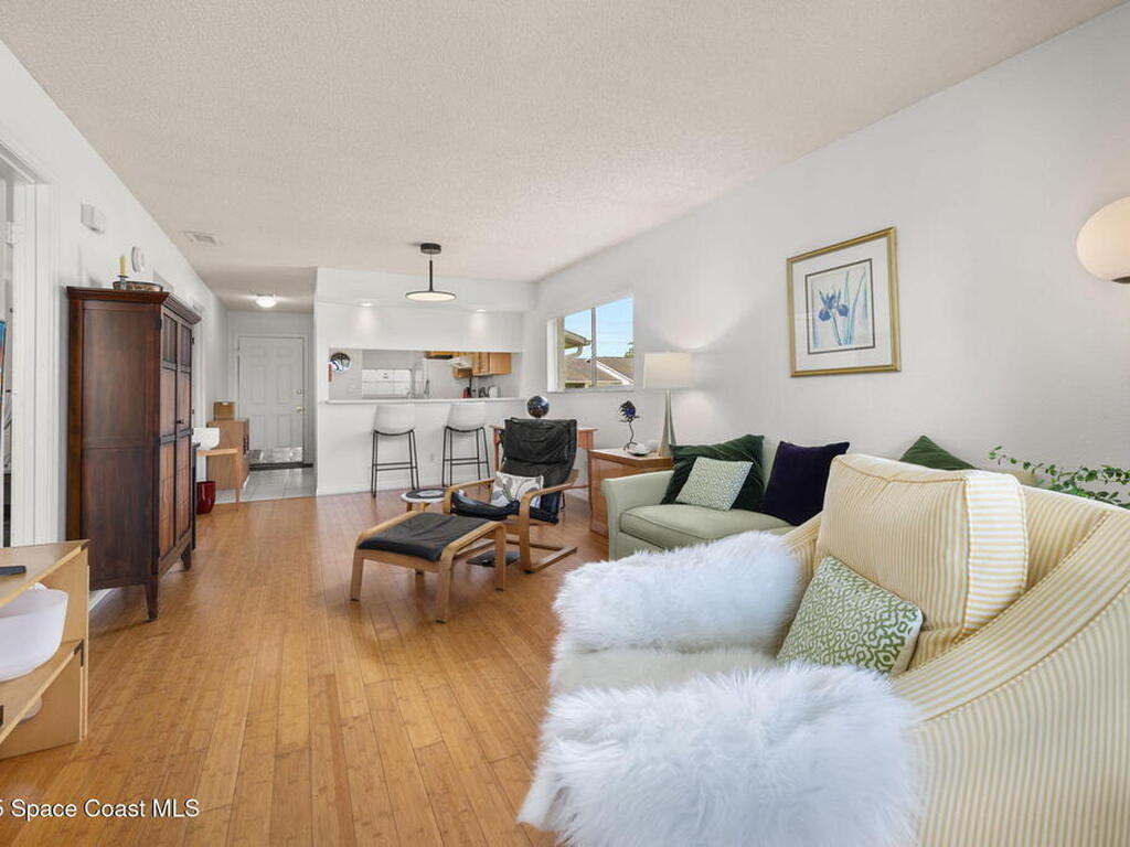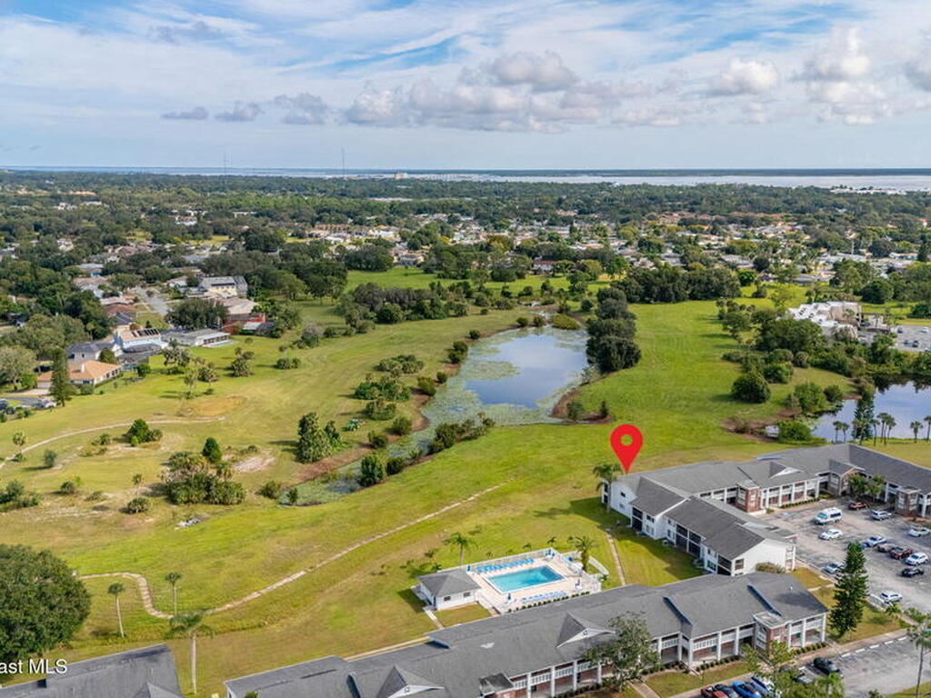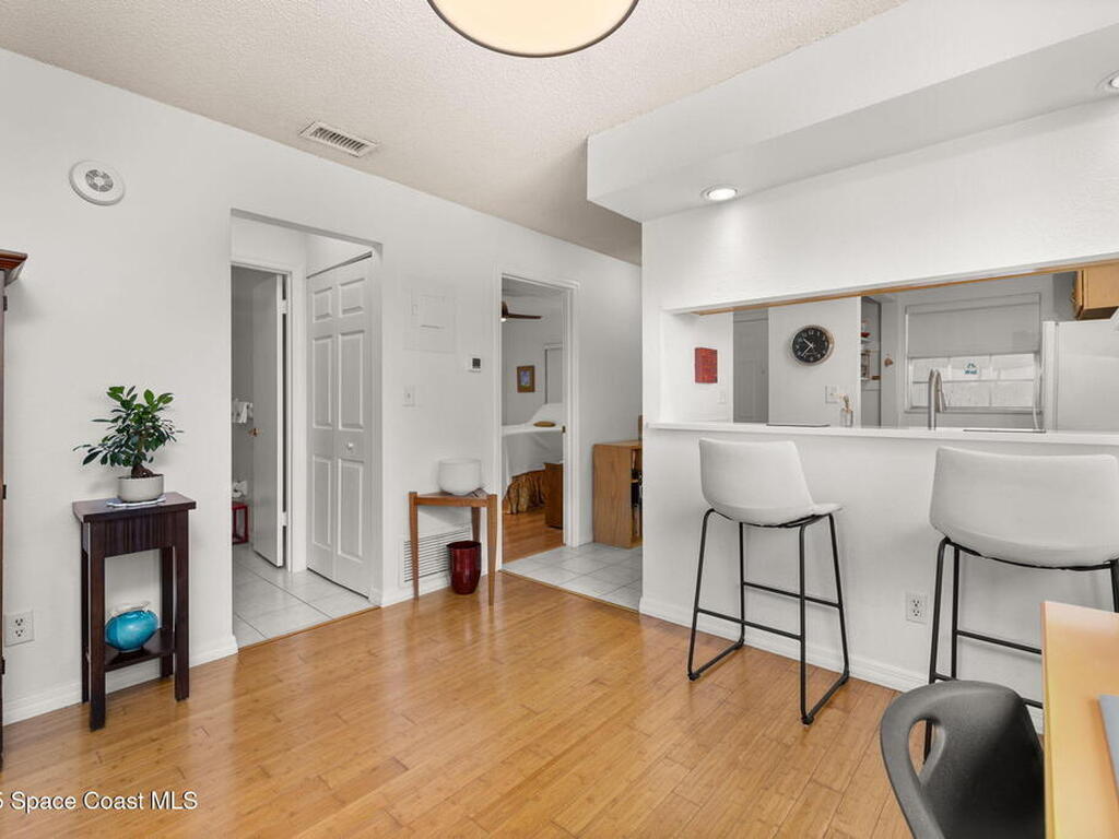 Experience Florida living at its best in this beautifully updated partially furnished corner-unit condo with western exposure, where you can enjoy gorgeous sunsets from your private screened balcony overlooking the former Royal Oak Golf Course. This 2-bed, 2-bath home features an updated kitchen with Wellborn cabinets, white quartz countertops, upgraded appliances, modern lighting, and bamboo wood flooring throughout. The primary suite offers a walk-in shower while the guest bath includes a tub/shower combo. Convenience is key with an in-unit LG washer & dryer (2024), plus peace of mind from recent updates: tankless water heater (2024), updated electric panel (2024), and A/C with heat pump (2016). Enjoy year-round sunshine at the heated community pool or watch rocket launches right from your balcony. This pet-friendly community allows two pets up to 24 lbs, making it the perfect blend of comfort and lifestyle. Don't miss your chance at purchasing this charming coastal retreat!