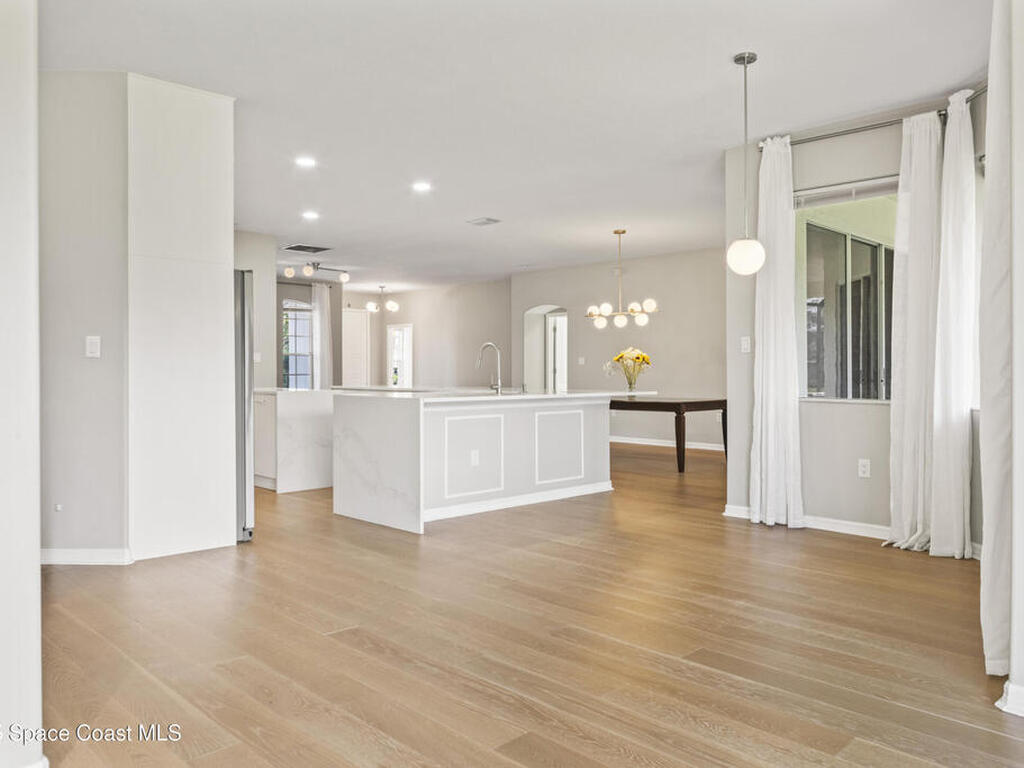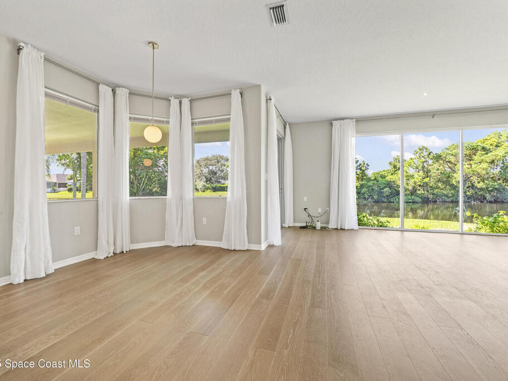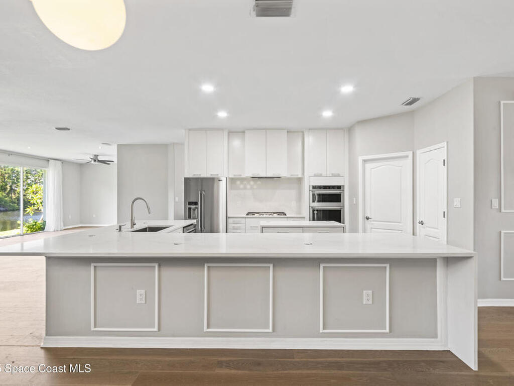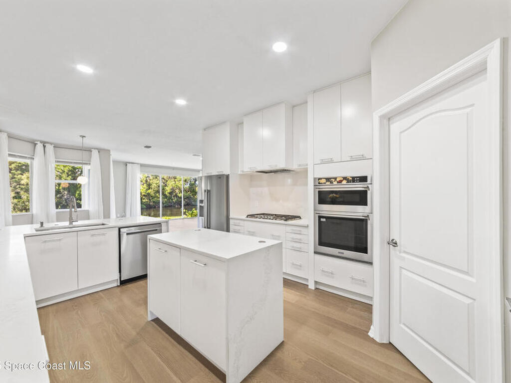 Fully renovated 4 bed/2 bath/3 car garage, 2, 570 sq ft waterfront home in peaceful Suntree. Enjoy manicured landscaping & perennial flowers upon entry. Upgrades include wide plank oak hardwood floors, quartz countertops, & soft-close cabinetry. The chef's kitchen features stainless steel appliances, gas cooktop, large pantry, & wrap-around island. Bathrooms have microcement finishes--no grout to clean! The master suite offers a quartz-surrounded jetted tub & walk-in shower. Built-ins provide ample storage throughout. The finished garage includes built-in storage, a workshop area, & extra fridge. Details include wall moldings, electric fireplace, marble handles, & coordinated nickel finishes. Recent roof, water heater, & A/C. Shutters included. Low HOA offers pools, tennis courts, playground, & clubhouse. The lot faces a nature preserve with water views & beautiful sunsets. Enjoy wildlife from your screened porch in this move-in ready retreat, close to top schools & I-95.