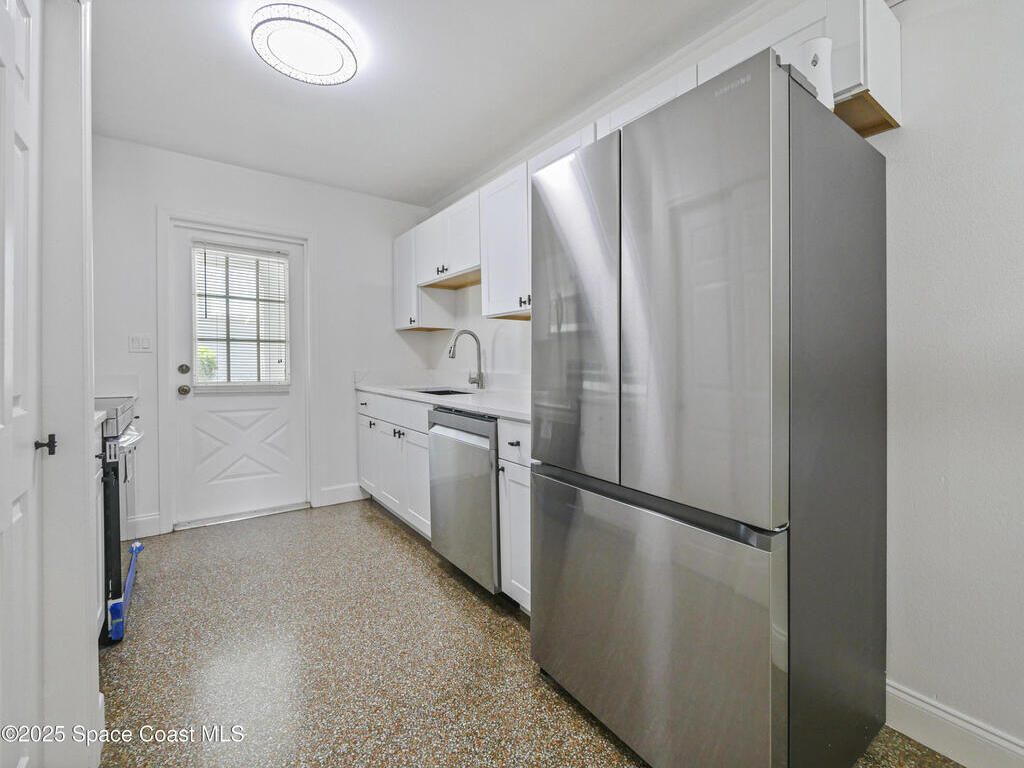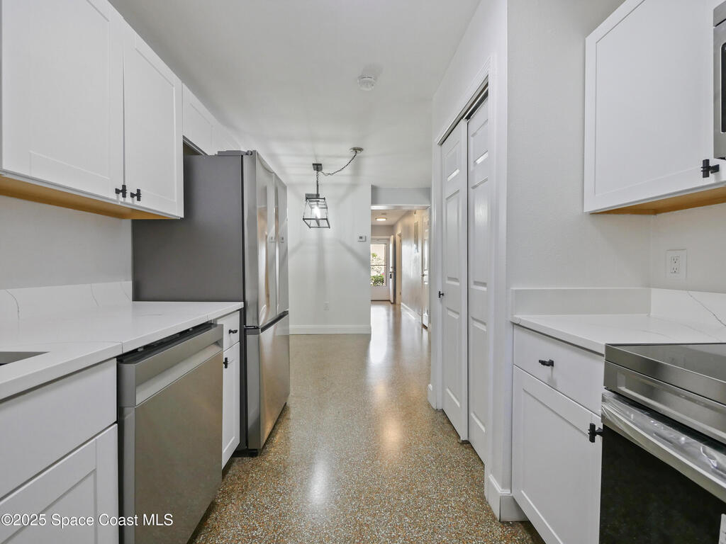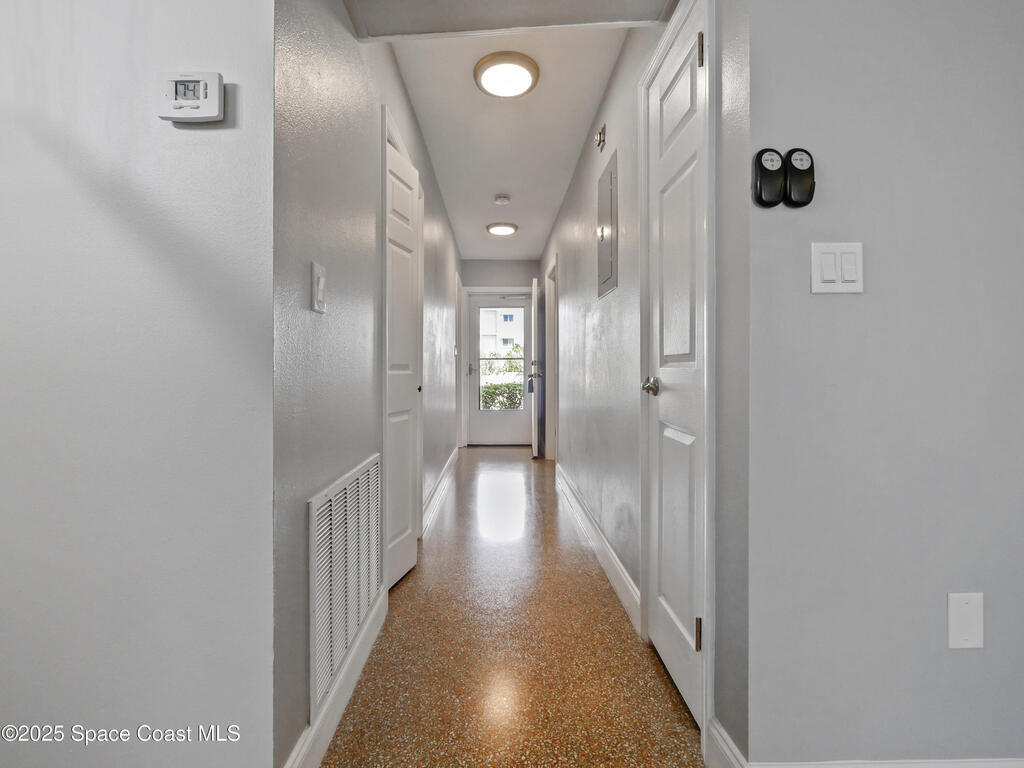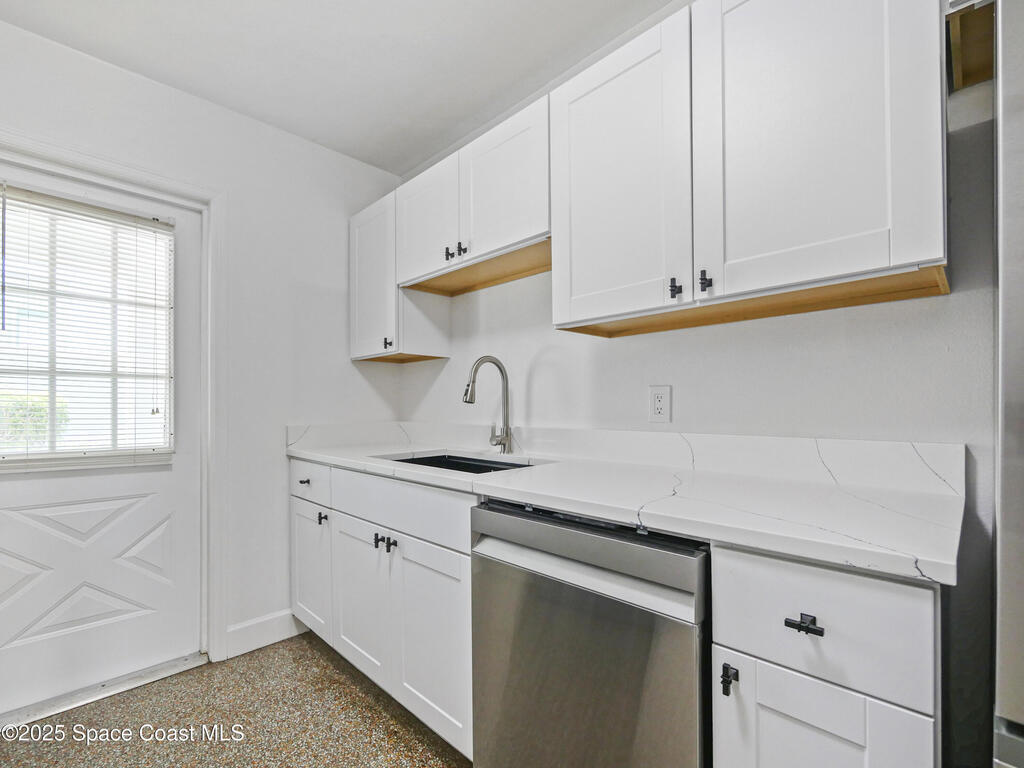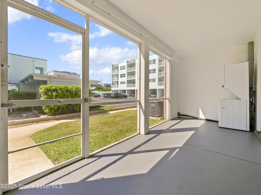This beautifully updated condo is steps to the direct access to pristine sands, perfect for a morning swim. You are just steps from local shops and restaurants, Ron Jon Surf shop, the pier and other attractions offering the best of both relaxation and convenience. This one bedroom features brand new appliances, newer electric panel and central A/C unit. Washer and dryer are included. Polished terrazzo in excellent condition makes this a one of a kind unit. Kitchen has new cabinets and beautiful quartz countertops. Bathroom was completely renovated. HOA includes: cable, sewer, maintenance, pest control, trash and water. it also offers the convenience of being on the first floor for the elderly or pet owner. No special assessments pending and no milestone inspections to worry about as this building only as 2 stories.