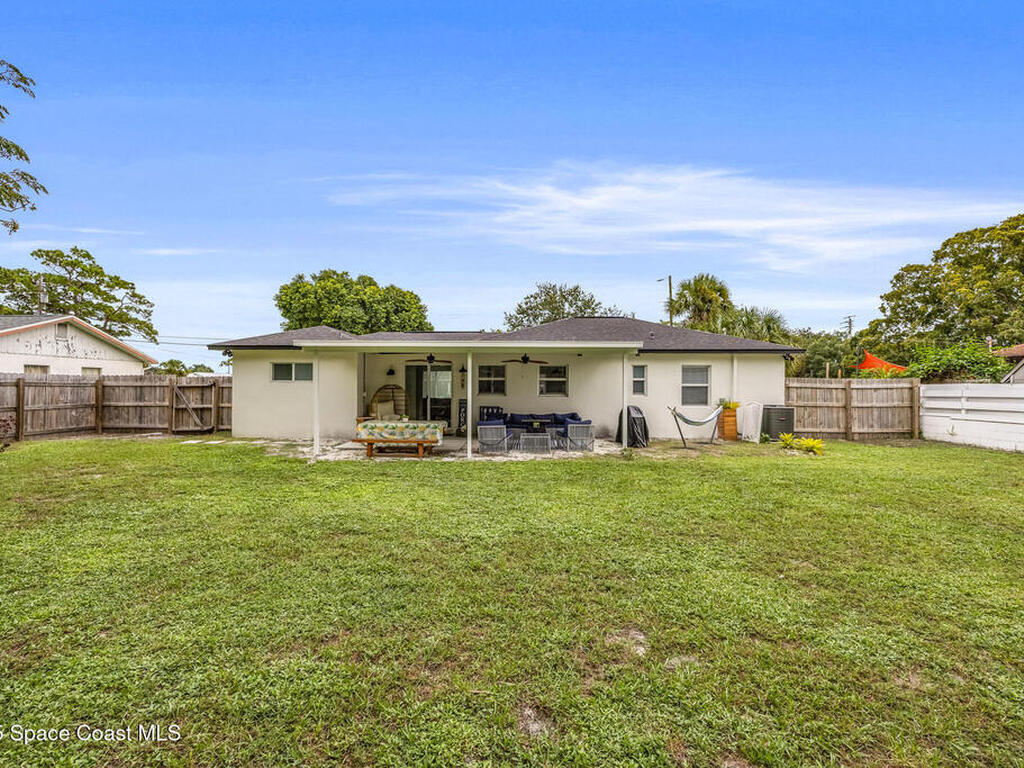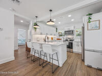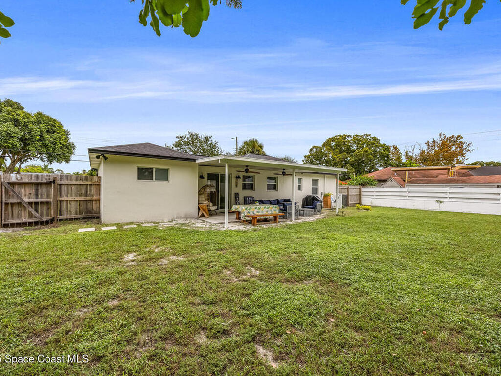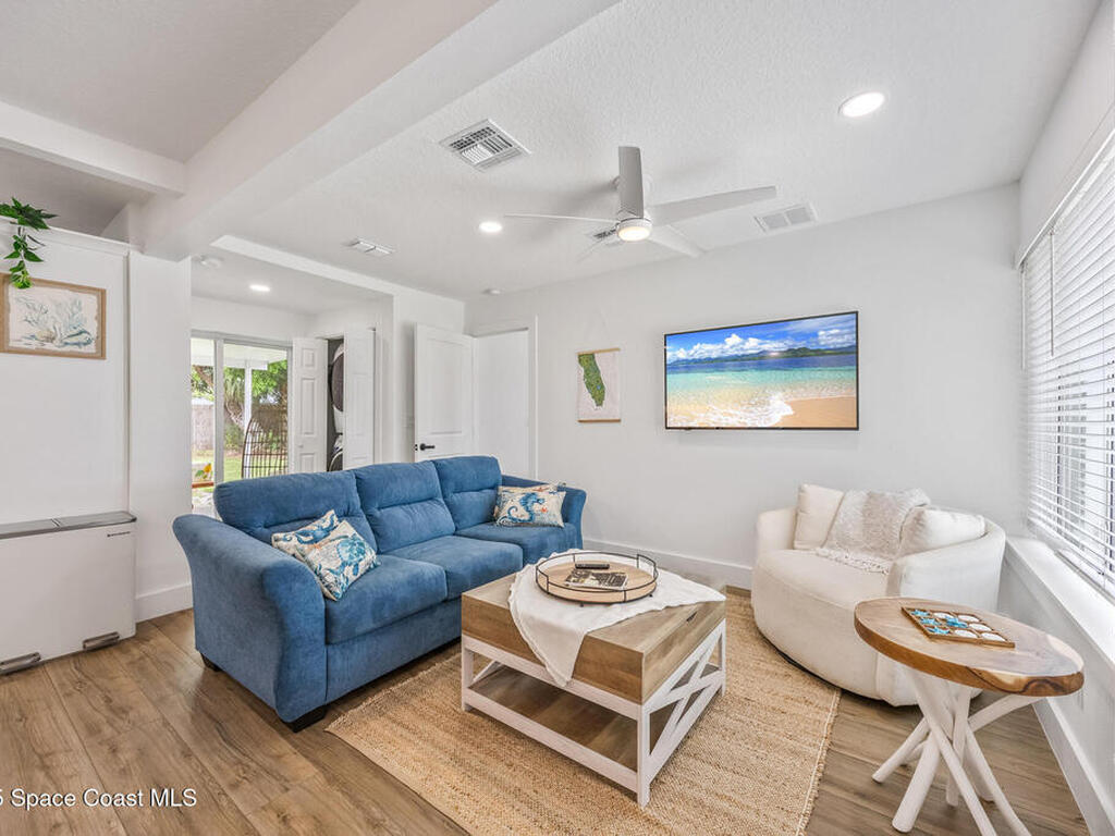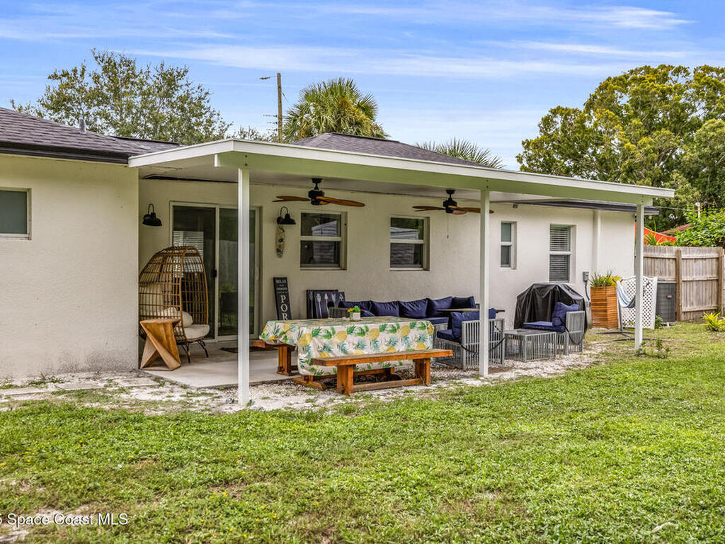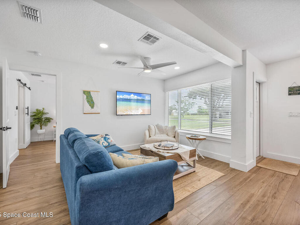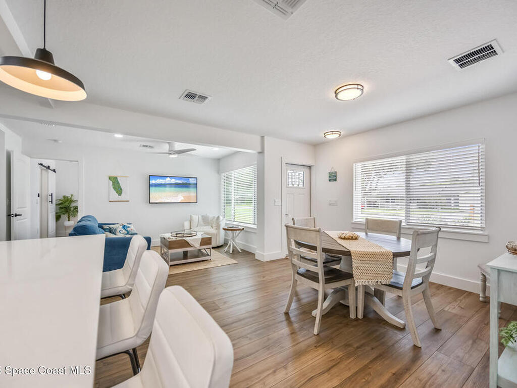This stylish home is fully renovated & perfectly located w/ a quick hop to the beach, Melbourne airport, downtown Eau Gallie, shopping & more! Nestled in a quiet, coveted neighborhood near scenic Ballard Park, you can walk to the Eau Gallie River & enjoy sunrises, boat ramp, fishing, tennis, playground & more. This 3 bdrm, 2 bathroom home has an open floor plan with very nice flow, great for entertaining. The home has all the modern finishes - quartz countertops, tile flooring/shower surrounds, LVP flooring, breakfast bar, barn door, 2024 roof & HVAC, updated plumbing, on demand hot water heater. The wide open backyard has plenty of room for a pool & a large, high quality awning that you could screen in to make a Florida room. The property has low maintenance landscaping & ample room for parking your RV or boat! The home is perfect as a second home for snowbirds or full time living & in a true gem of a neighborhood. Currently a functioning vacation rental, furnishings are negotiable.