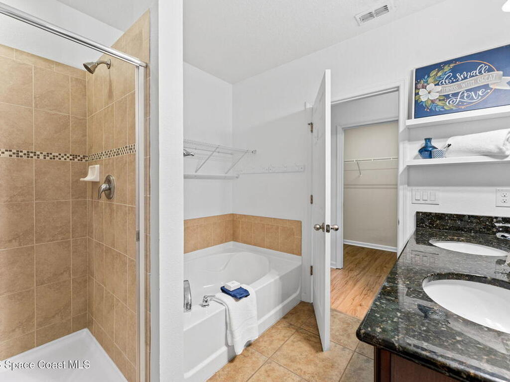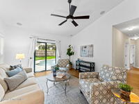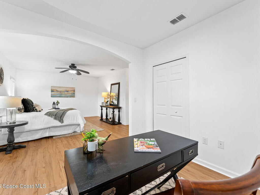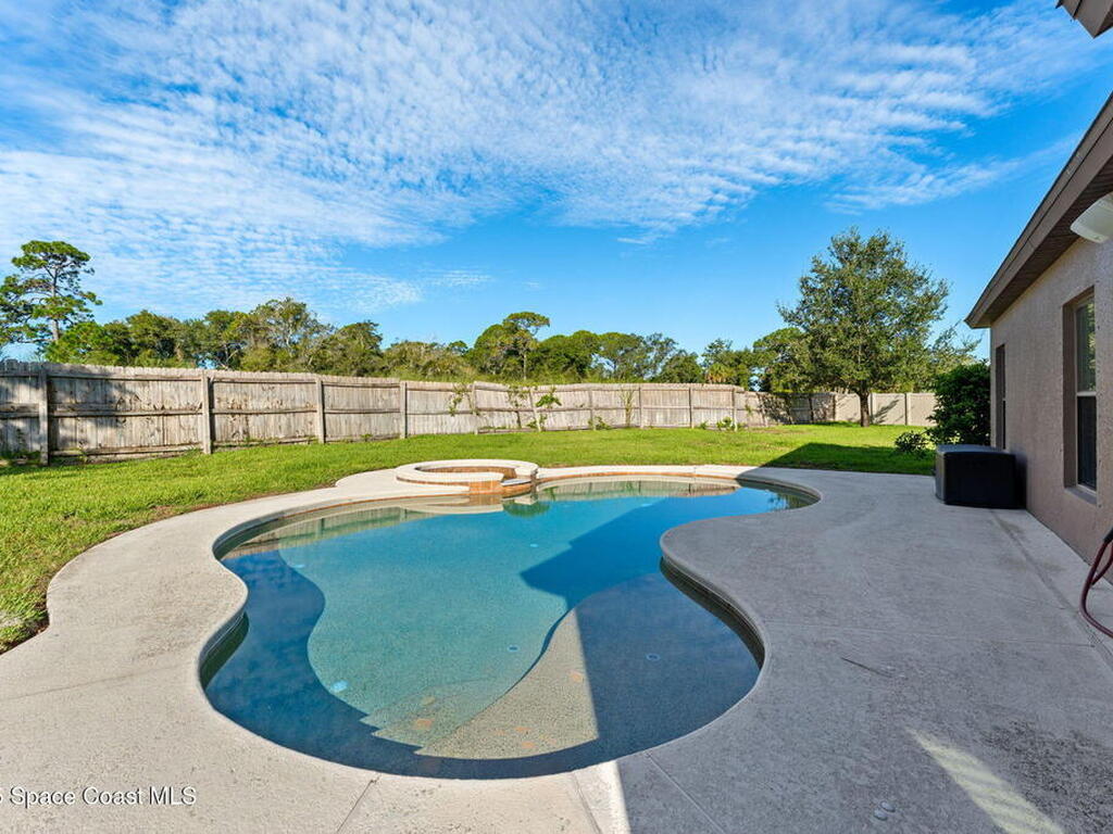 Tucked at the end of a cul-de-sac on an oversized lot, this home is all about good living. Inside, you'll find brand-new tile plus laminate floors, an open floorplan that flows with ease, and a kitchen built for connection- think island, breakfast bar, and a cozy eat-in nook. The split-bedroom layout delivers privacy, while the primary suite goes next-level with its own FLEX space - perfect spot for an office, spin bike, reading nook, or whatever vibe you're into. Interior perks like surround sound speakers keep the energy high, and out back a huge yard sets the stage for all your outdoor dreams-complete with a sparkling salt pool and spa. With a propane tank on site for spa heating, a shed for your extras, a new HVAC, and manual storm shutters, this one nails the balance of comfort, convenience, and vacation-mode living!