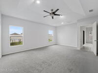 5.25% Assumable VA Loan! This stunning 4-bedroom, 3-bath home blends modern design with everyday comfort, featuring luxurious finishes and a bright, open layout. From the paved driveway and impressive entryway to sleek tile flooring (with removable carpet overlay), every detail has been thoughtfully crafted.The gourmet kitchen is a chef's dream, solid- quarts countertops, subway tile backsplash, oversized island, stylish gray cabinetry, stainless steel appliances including a brand-new refrigerator, and a walk-in pantry with plenty of storage. The open living and dining areas flow seamlessly to the private, fully fenced backyard with a screened, trussed patio, perfect for relaxing or entertaining.