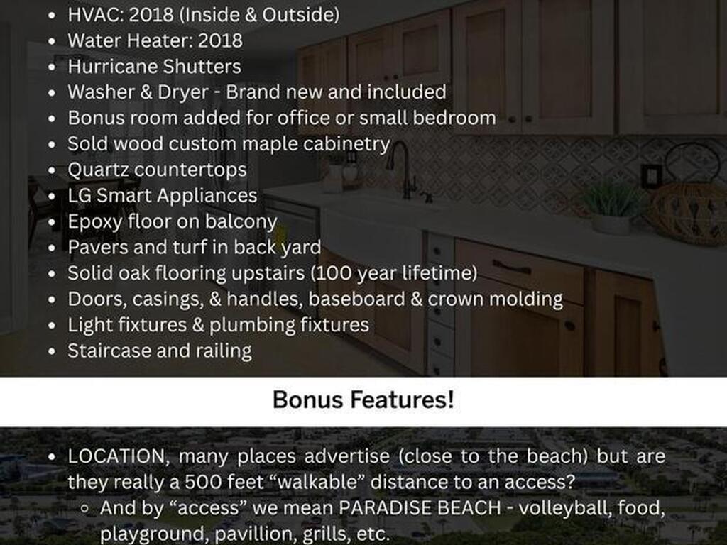 IMMACULATE, remodeled (2025), and extremely spacious townhome just steps from Paradise beach! This quiet and beautiful boutique community has a truly unbeatable location (walk to paradise beach plus shopping, dining, and live music). Just a few of the countless updates include solid maple cabinetry, quartz counters, LG smart appliances, epoxy balcony, turf and pavers, washer & dryer, light fixtures, and doors. Both bedrooms are HUGE and have their own walk-in closets PLUS a bonus room for an office or kid's room. ALL major systems have been updated roof (2024), electric panel (2025), HVAC (2018), & hurricane shutters for complete peace of mind. Added bonus: cable & internet included. Arguably the best property below $500k in Indialantic - come see for yourself!