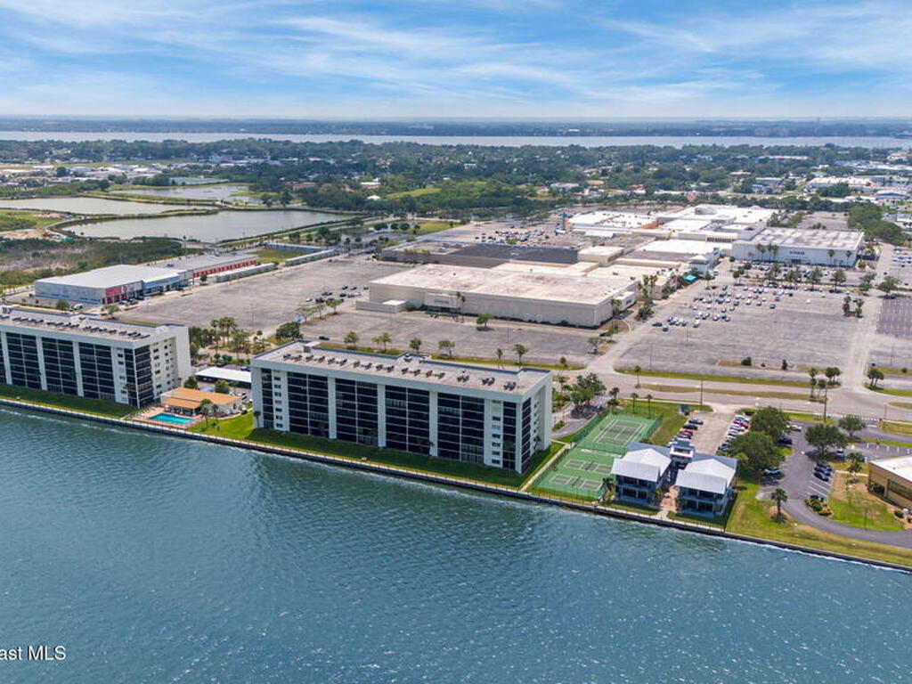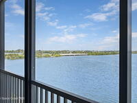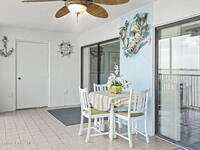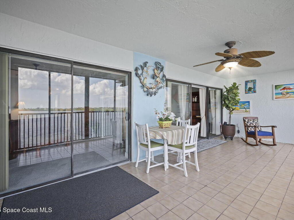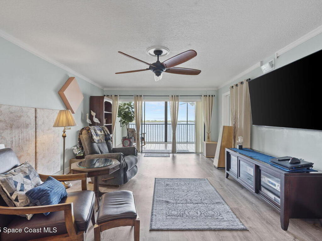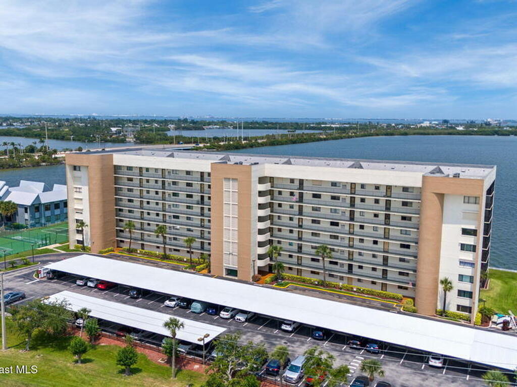 Updated 5th floor condo at Merritt Towers with direct panoramic views of Sykes Creek. Enjoy coastal breezes and watch rocket launches from your own balcony! Inside you'll find a thoughtfully updated kitchen with modern finishes, an open layout, designer pocket door at the laundry room and custom lighting. Additional design features include crown molding, elegant tiled showers, luxury vinyl plank flooring and built-in bar area. For your convenience and safety the front windows have hurricane panels and the balcony has accordion style hurricane shutters. This well-managed community offers great amenities including two waterside pools, tennis and pickleball courts, shuffleboard, riverfront boardwalk, sauna, clubhouse and more! Condo fees cover all utilities except electric. Recent building updates include new elevators, concrete and balcony restoration. All assessments have been paid in full.