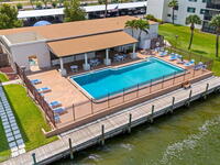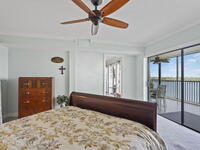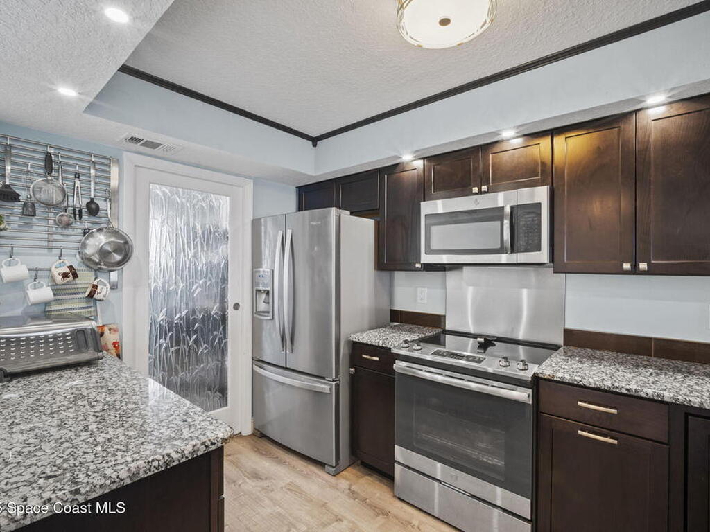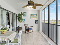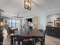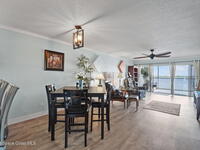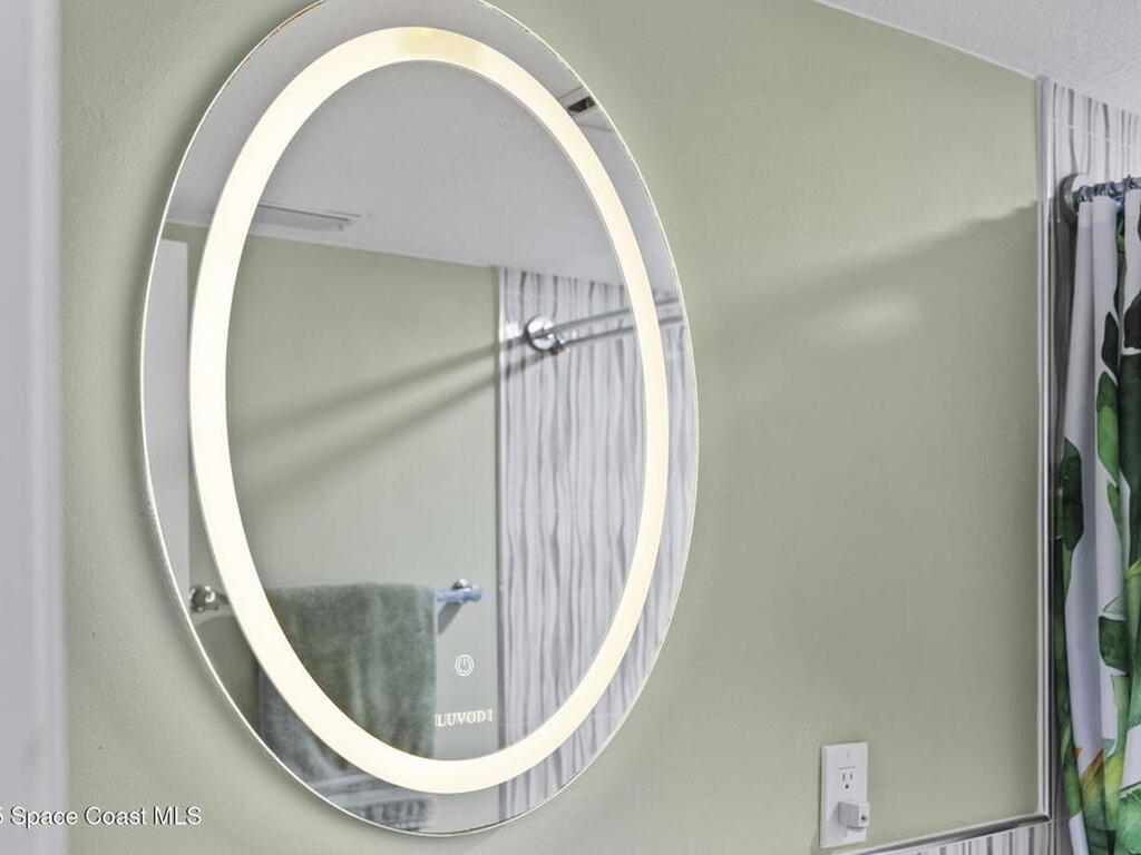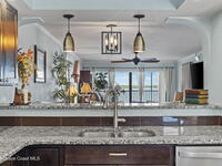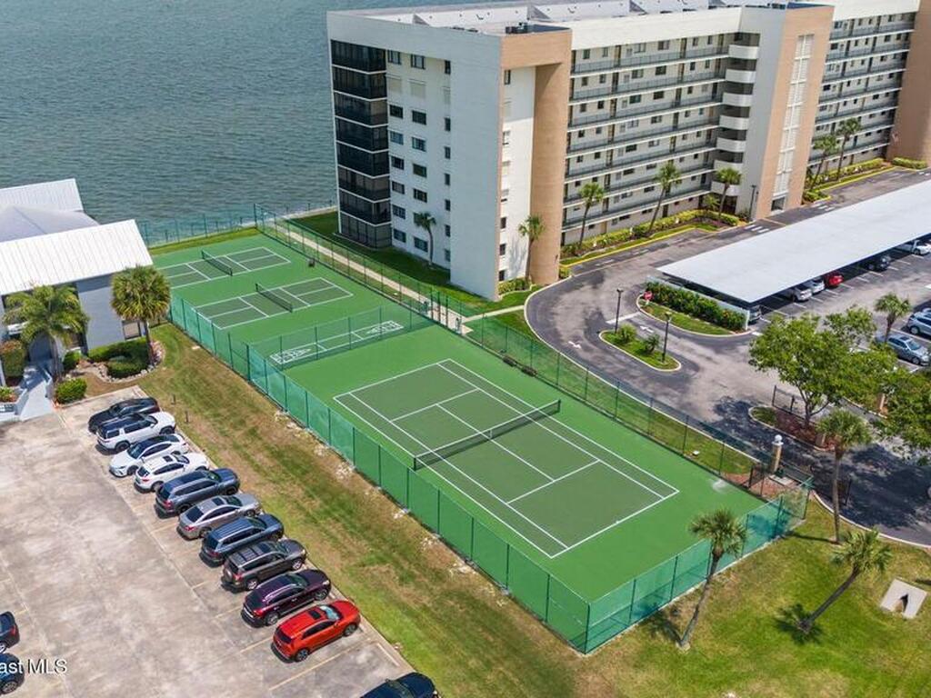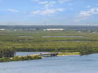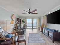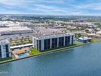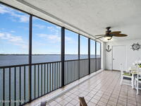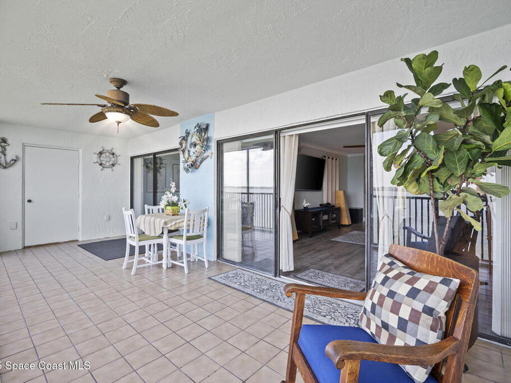 Updated 5th floor condo at Merritt Towers with direct panoramic views of Sykes Creek. Enjoy coastal breezes and watch rocket launches from your own balcony! Inside you'll find a thoughtfully updated kitchen with modern finishes, an open layout, designer pocket door at the laundry room and custom lighting. Additional design features include crown molding, elegant tiled showers, luxury vinyl plank flooring and built-in bar area. For your convenience and safety the front windows have hurricane panels and the balcony has accordion style hurricane shutters. This well-managed community offers great amenities including two waterside pools, tennis and pickleball courts, shuffleboard, riverfront boardwalk, sauna, clubhouse and more! Condo fees cover all utilities except electric. Recent building updates include new elevators, concrete and balcony restoration. All assessments have been paid in full.