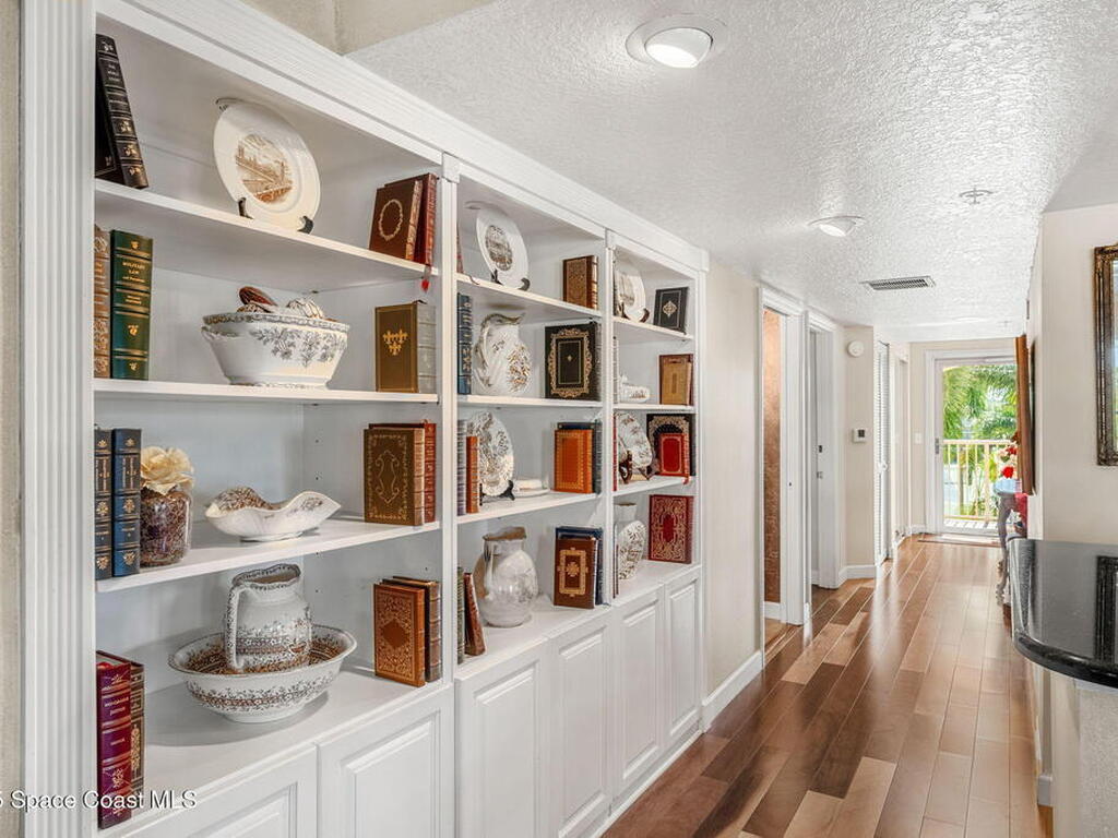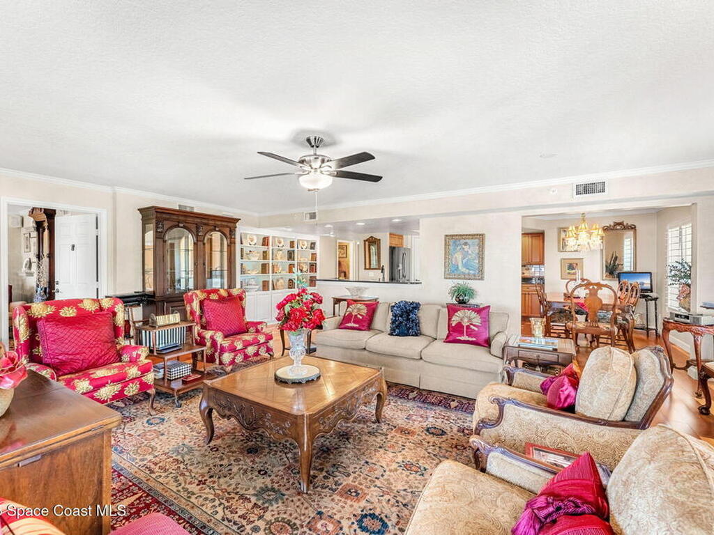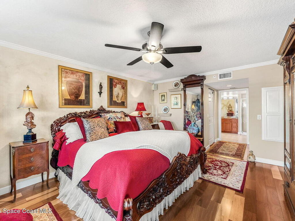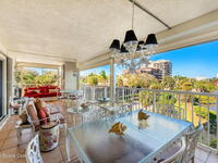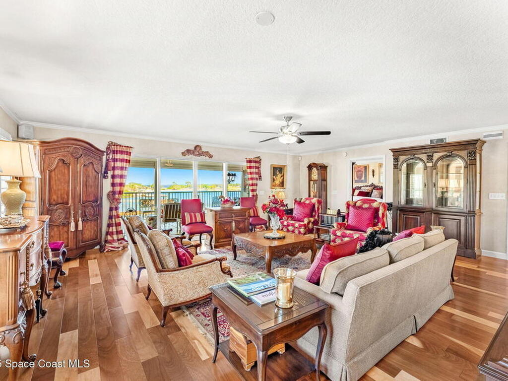 Experience resort-style living in this stunning 3BR/3BA end unit with panoramic water views and front-row seats to rocket launches, Fireworks, and Boat parades. Elegant details include hardwood floors, a custom-built-in bookcase, crown molding, plantation shutters & a built-in speaker system. The updated kitchen showcases custom cabinetry, granite counters & an island with a breakfast bar--perfect for entertaining. Relax in your spacious primary suite with a spa-like bath featuring dual vanities, a jetted tub & a separate walk-in shower. Two balconies with electric roll-down shutters invite you to soak in breathtaking views! Enjoy the convenience of a large, climate-controlled private storage unit, secure garage parking, slips available & endless amenities--pool, spa, boat sauna, gym, clubhouse, tennis, pickleball & more! Walk to Cocoa Village festivals, concerts & dining--or drive minutes to world-famous Cocoa Beach. Live where every day feels like a vacation!