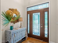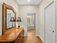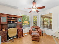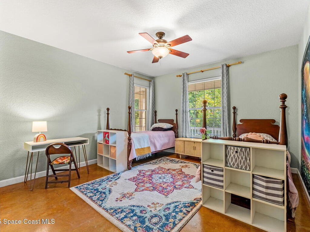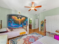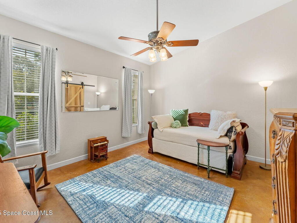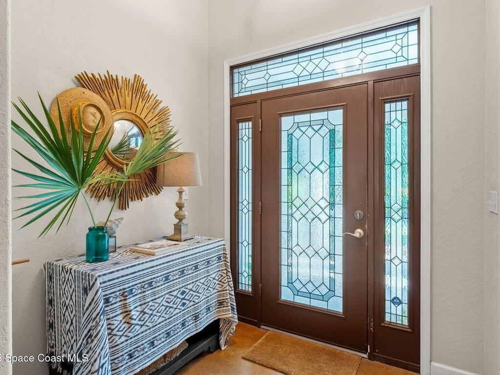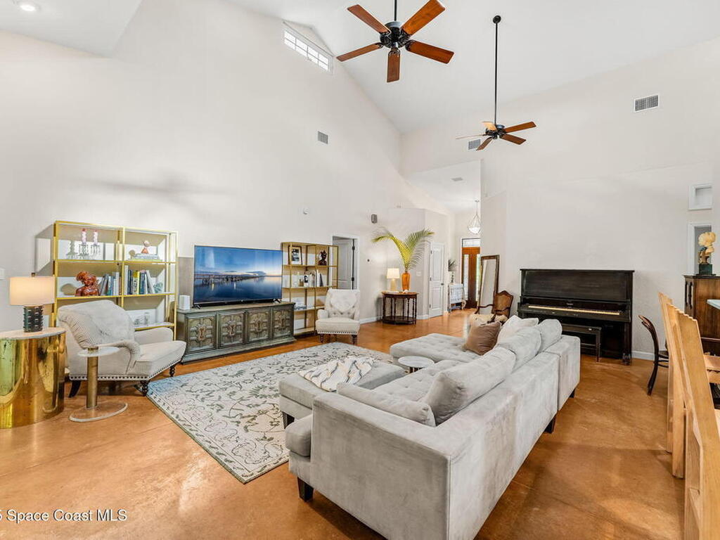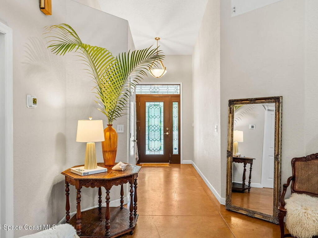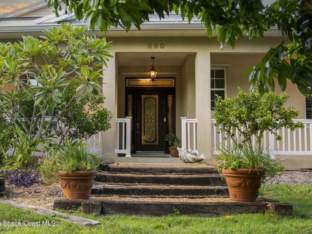 Your Florida homestead dream lives here. Architect designed and centered on a private one acre lot. This Merritt Island residence blends utility and style. 3, 707 sq. ft. with 4 bedrooms, 3 baths, office, bonus game room and a 3 car garage. Durable painted concrete floors and a cook friendly corian kitchen with custom solid oak cabinetry. Outdoor living with a screened lanai and a wraparound porch under a metal roof. Practical upgrades include hurricane shutters, a whole house vacuum, a whole house attic fan, solar panels, and 50 amp service for your RV, EV, or tools. The orchard steals the show with mango, dragon fruit, avocados, and limes. Minutes to beaches, shops, and schools yet tucked away. All information deemed reliable but not guaranteed; buyer to verify.