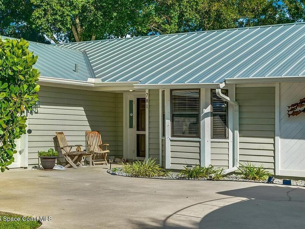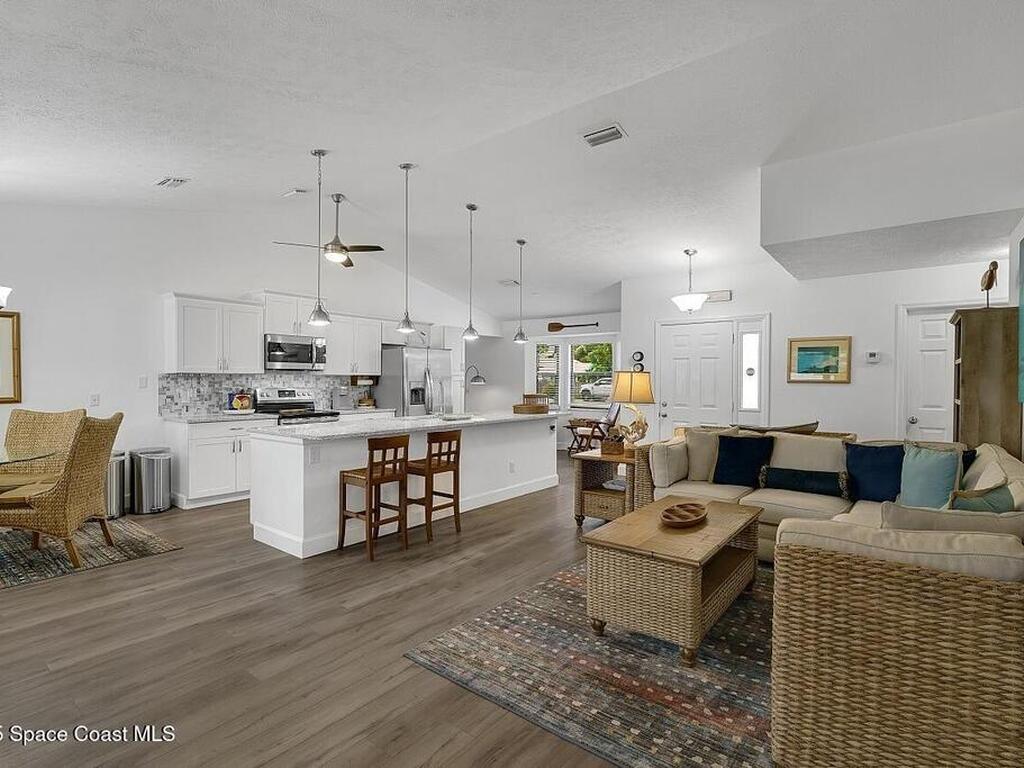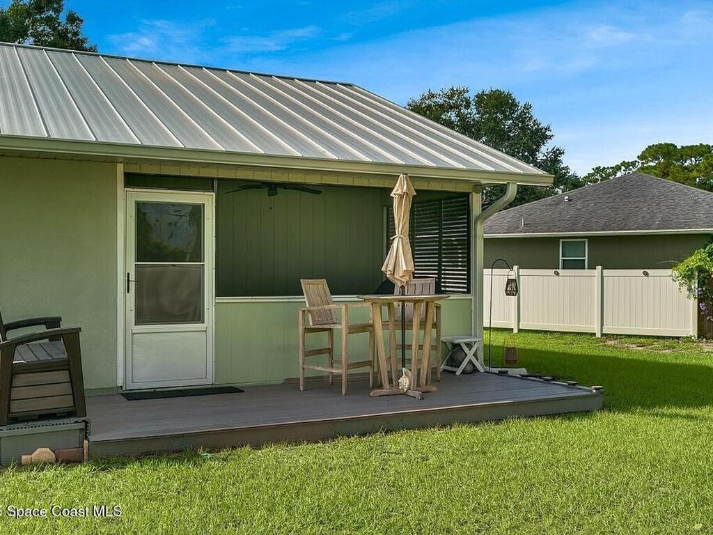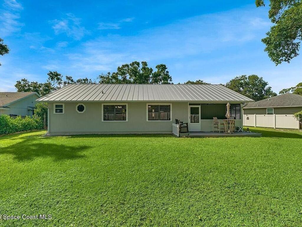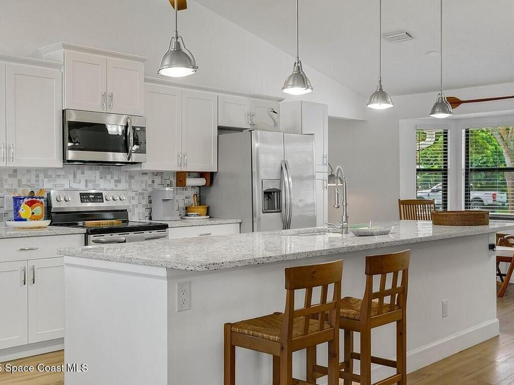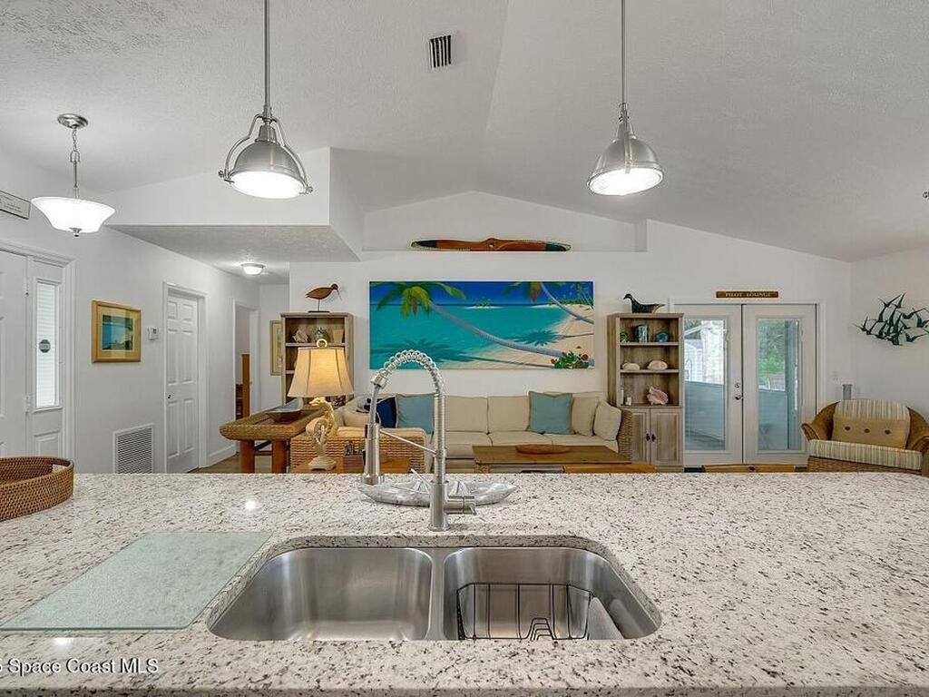 Experience Florida living at its finest in this 3-bed, 2-bath coastal dream home. Upgraded from top to bottom with a desirable split floor plan & vaulted ceilings. Open layout creates a bright, airy feel. The modern kitchen has crisp white cabinetry, granite counters, bar seating with massive island & stainless steel appliances. French doors open to a screened patio, perfect for relaxing or entertaining in the backyard. The primary suite features dual vanities, vaulted ceiling, a huge tiled full glass shower & built in closet shelving. 2020 standing seam metal roof, 2020 water heater & 2013 AC