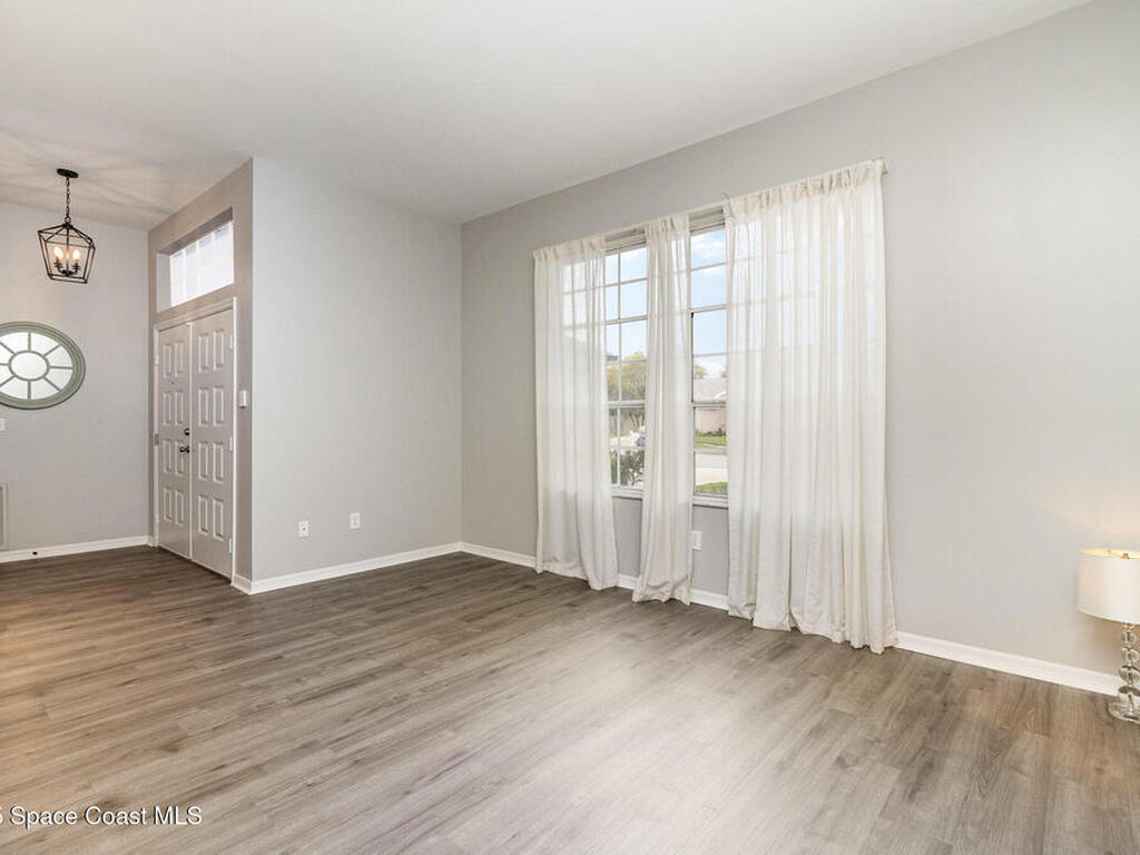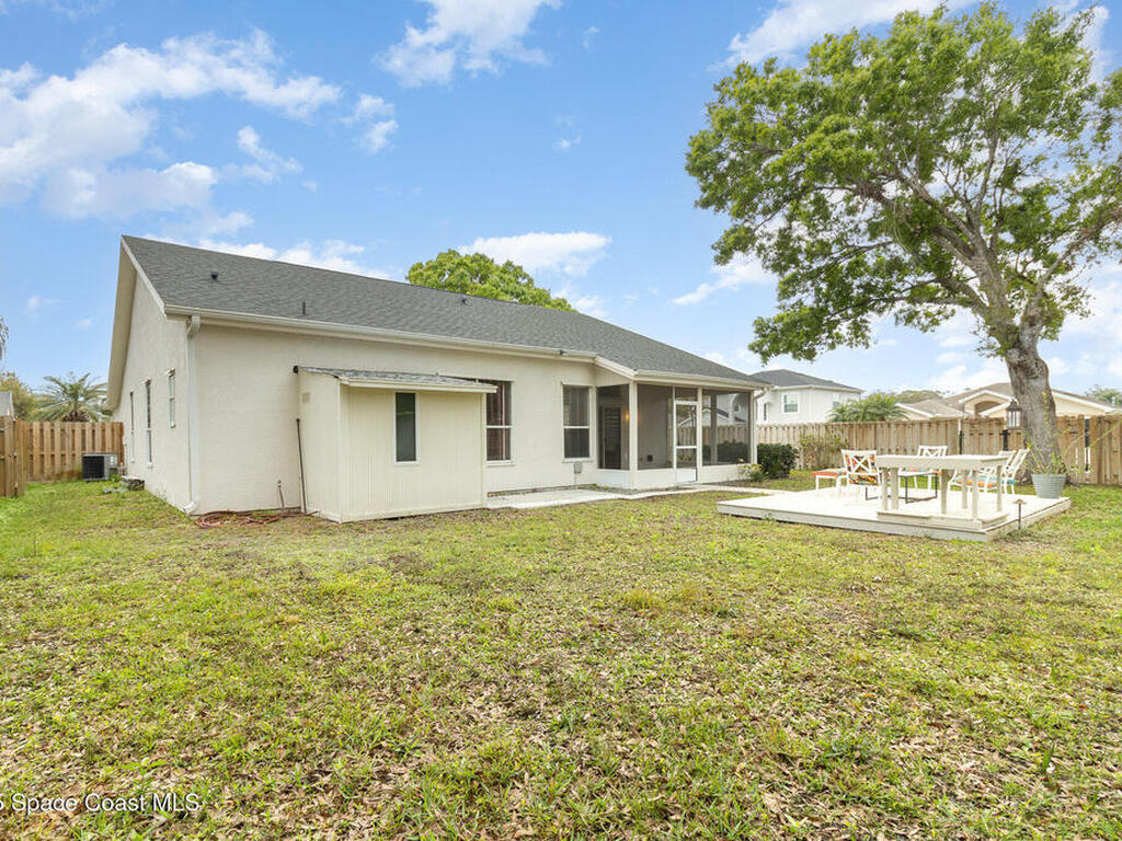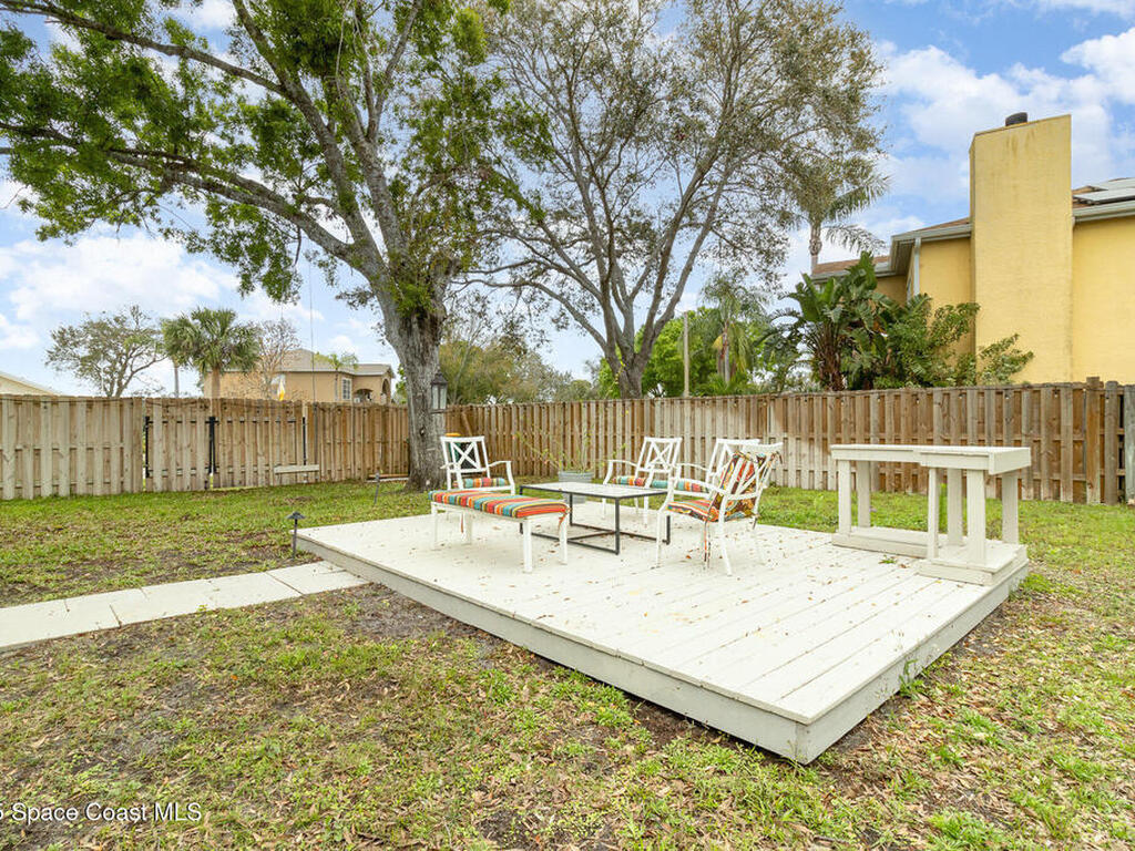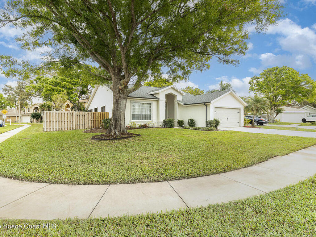 Beautifully updated 3BR/2BA home located in the heart of Viera. This move-in-ready property features luxury vinyl plank flooring throughout, energy-efficient LED lighting, and a modern kitchen with stainless steel appliances, GAS RANGE, granite countertops, and stylish cabinetry. Both bathrooms have been fully renovated with updated vanities, tiled showers and floors, and new commodes.Enjoy a private, fenced backyard with a wood deck and party lights--perfect for entertaining or relaxing outdoors. Additional features include an indoor laundry area with washer and dryer included, EV plug in the garage, Ring doorbell, and an optional alarm system. Lawn care is included. Owner will consider one small dog.Community amenities include a park at the entrance and a walking trail leading to Woodside Park and Pieloch Dog Park. Conveniently located near shopping, dining, major highways, and the beaches. Don't miss this exceptional Viera home