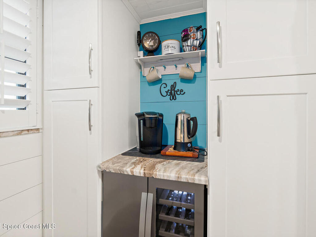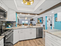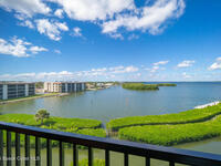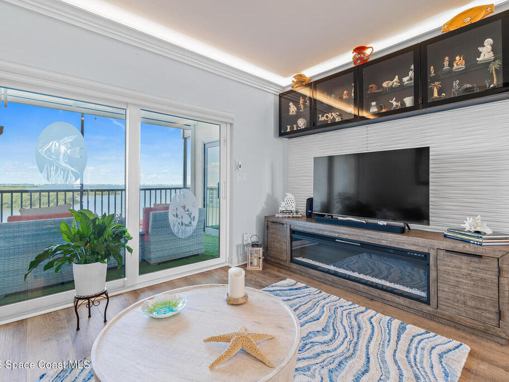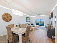 STUNNING top-floor condo w/incredible views of the Banana River! The kitchen is gorgeous w/durable leathered granite counters, generous island, crisp white shaker cabinets & newer stainless appliances. The primary suite delivers w/dual granite vanities, updated tile shower & 2 closets--including a custom walk-in for effortless organization. Guest bedroom features a Murphy bed & peek-a-boo ocean view. 9' ceilings amplify the airy open floorplan, where crown molding & subtle accent lighting create a welcoming ambiance. Soft beachy coastal colors & stylish interior doors enhance the modern yet timeless appeal. Plantation/storm shutters, new slider, private 1 car garage, NO CARPET, tons of storage & VA APPROVED too! Benefit from association-paid hot water & exceptional amenities: heated pool/spa, sauna, tennis/pickleball/basketball, fitness center, community clubhouse /dock & drive-thru car wash. This coastal retreat in vibrant Cocoa Beach combines convenience, views & value--Call today!