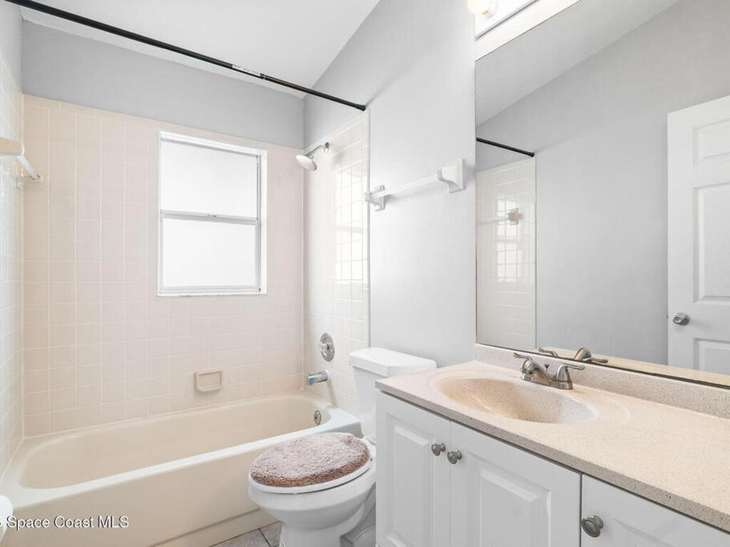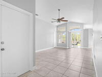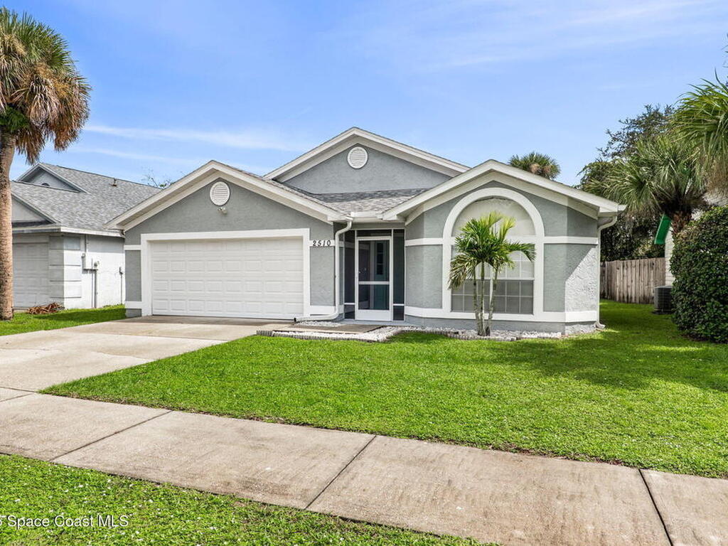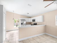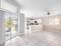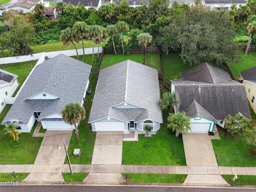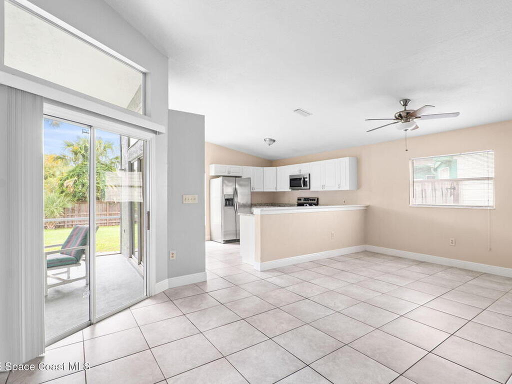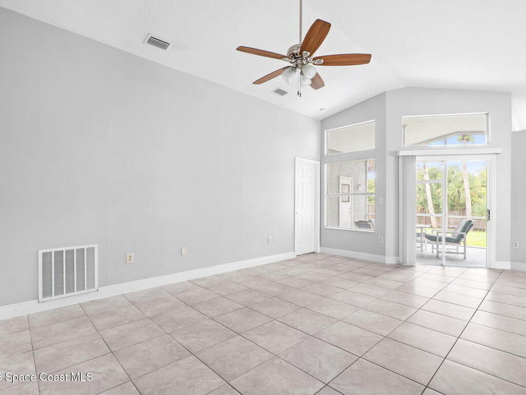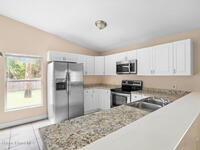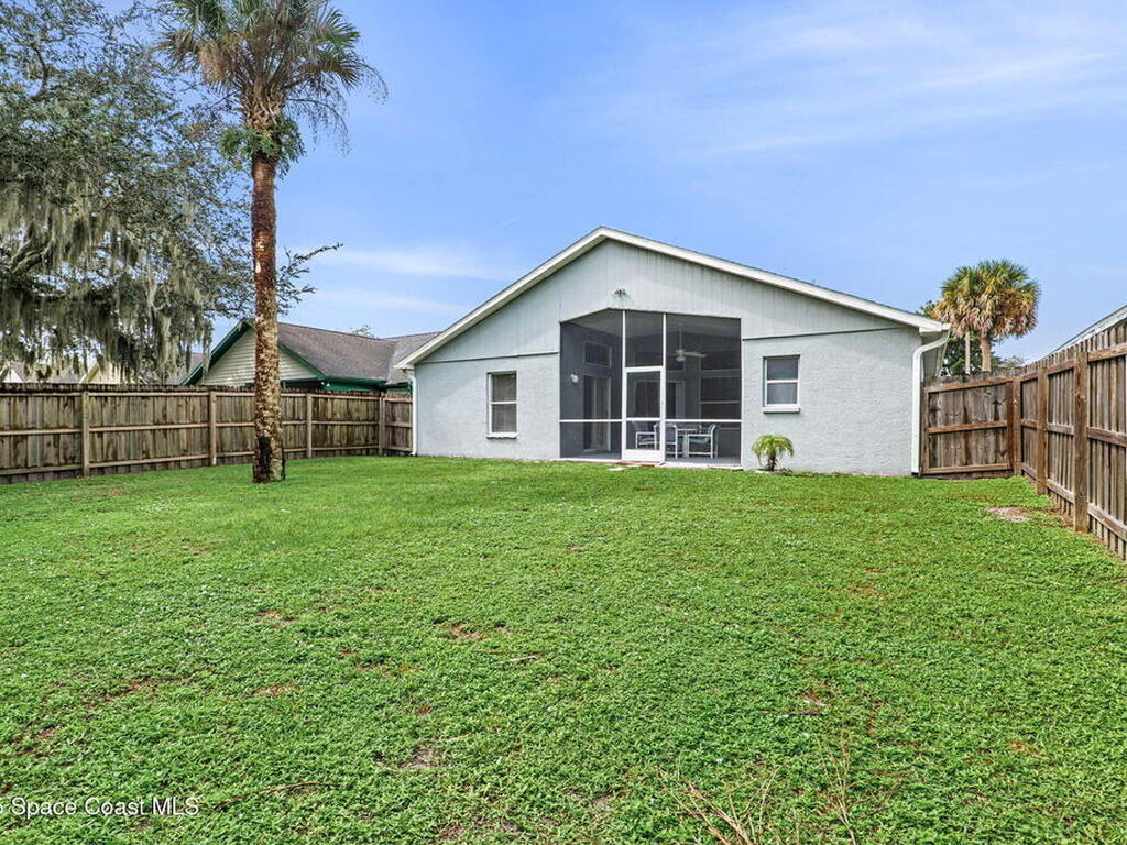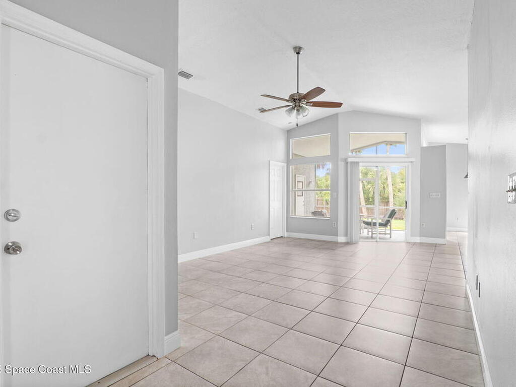 Welcome to this beautifully maintained 3-bedroom, 2-bath home nestled in a quiet, well-kept neighborhood in Titusville. Perfectly situated near shopping, restaurants, and quick access to Interstate 95, this property combines everyday convenience with the peaceful feel of a private retreat. Step inside to find a bright, open floor plan highlighted by soaring ceilings and large windows that flood the home with natural light. The spacious living area offers plenty of room for entertaining and flows effortlessly into a defined dining space and an inviting kitchen. With crisp white cabinetry, stainless-steel appliances and a breakfast bar overlooking the family room, this kitchen is designed for both style and functionality. This home has an open concept with a split floor plan. The large primary suite features an ensuite bath with recently remodeled walk-in shower. Two additional bedrooms and a full guest bath with tub offer flexible space for family, guests, or a home office. No carpet.
