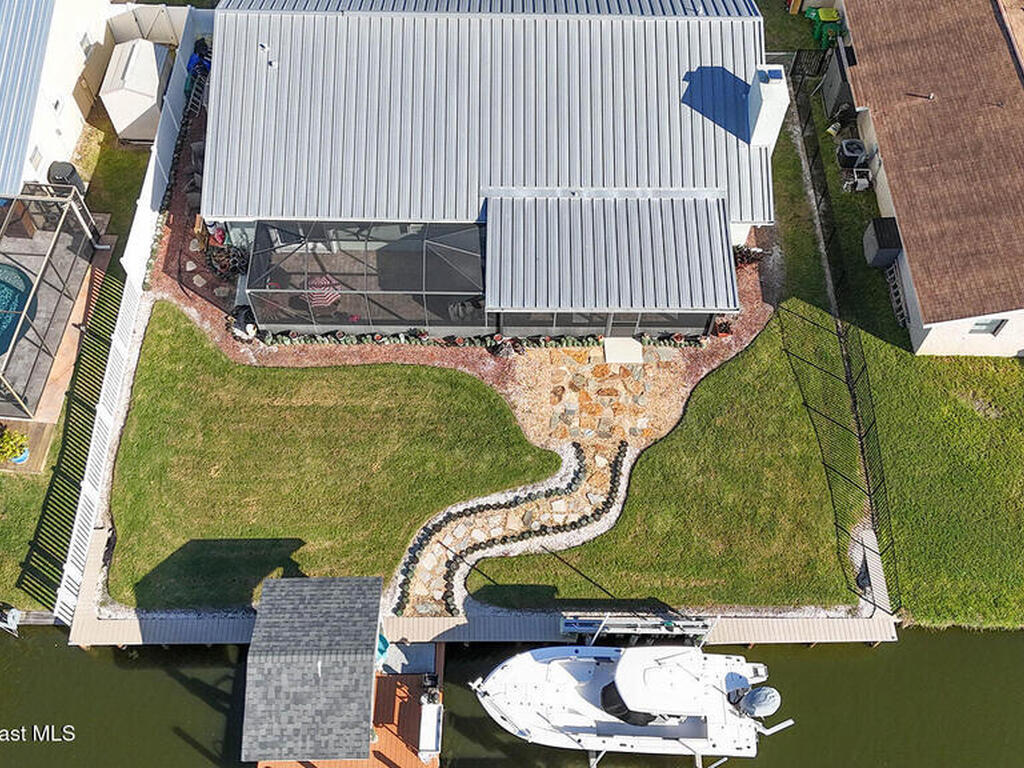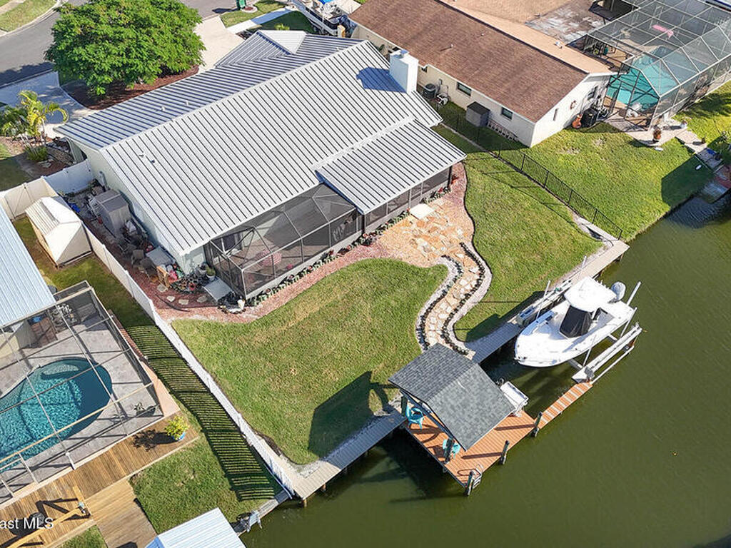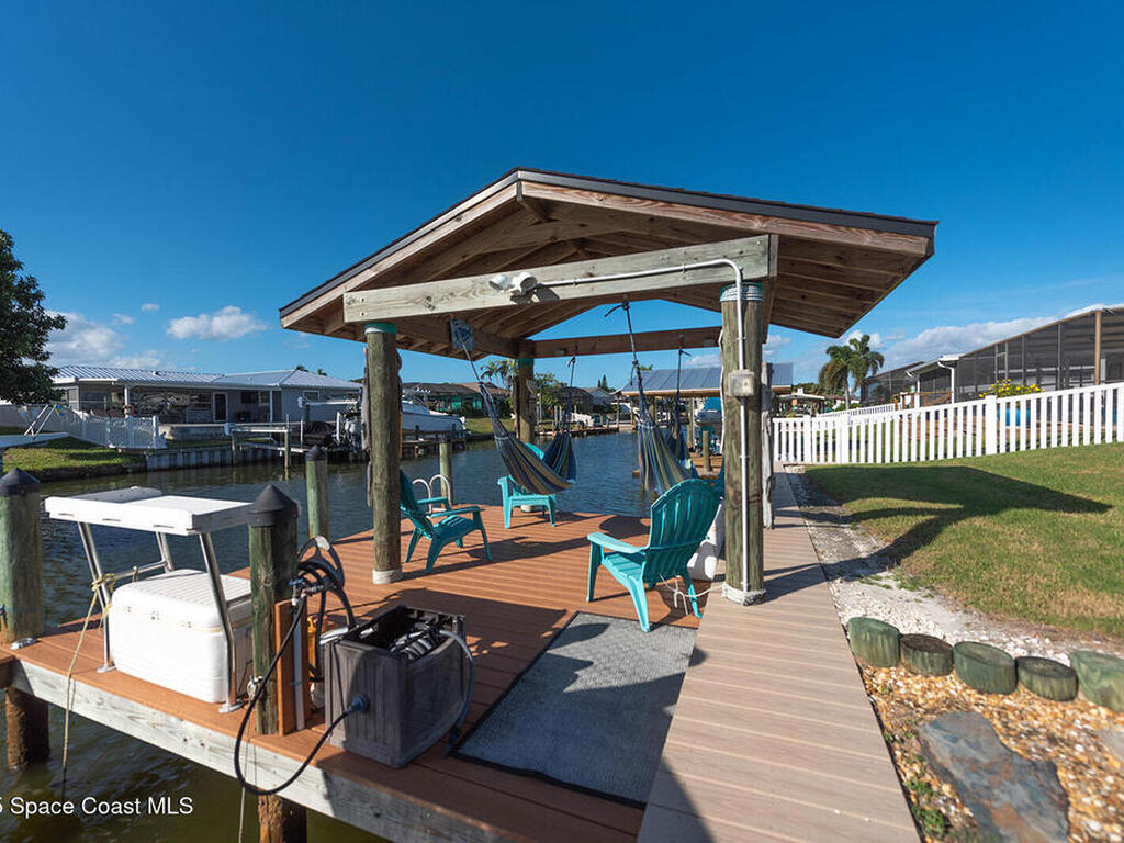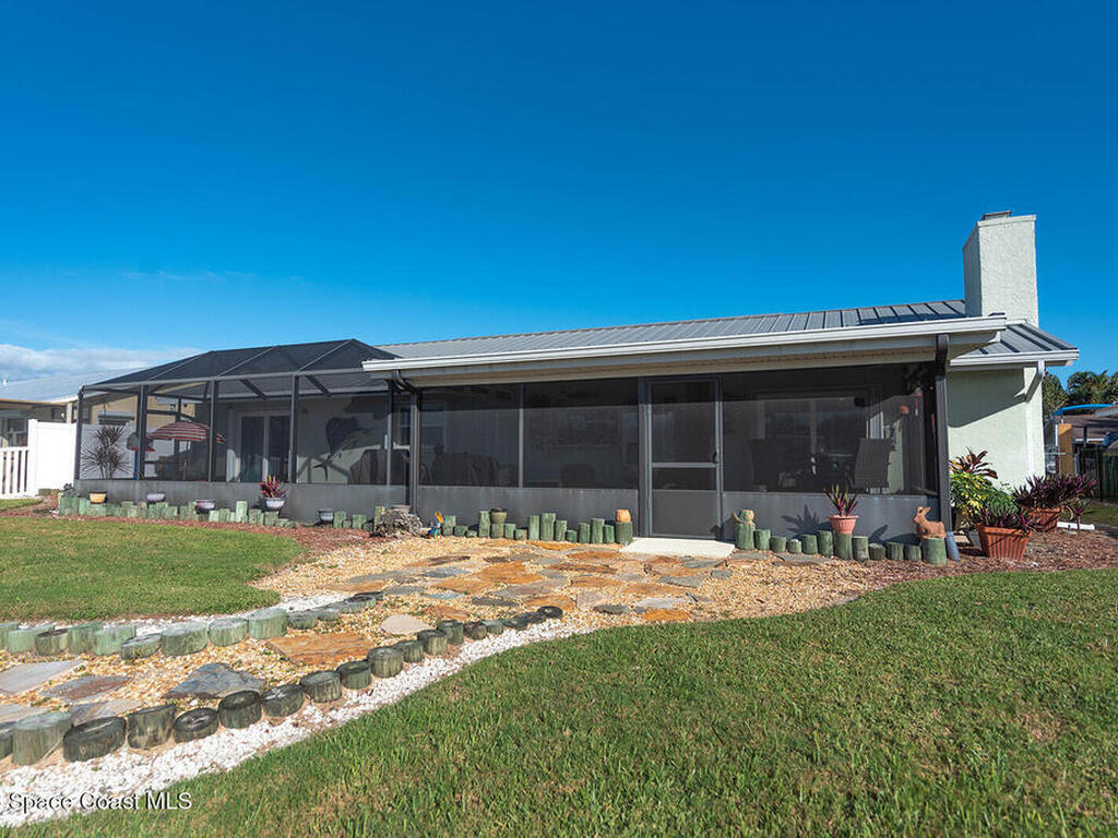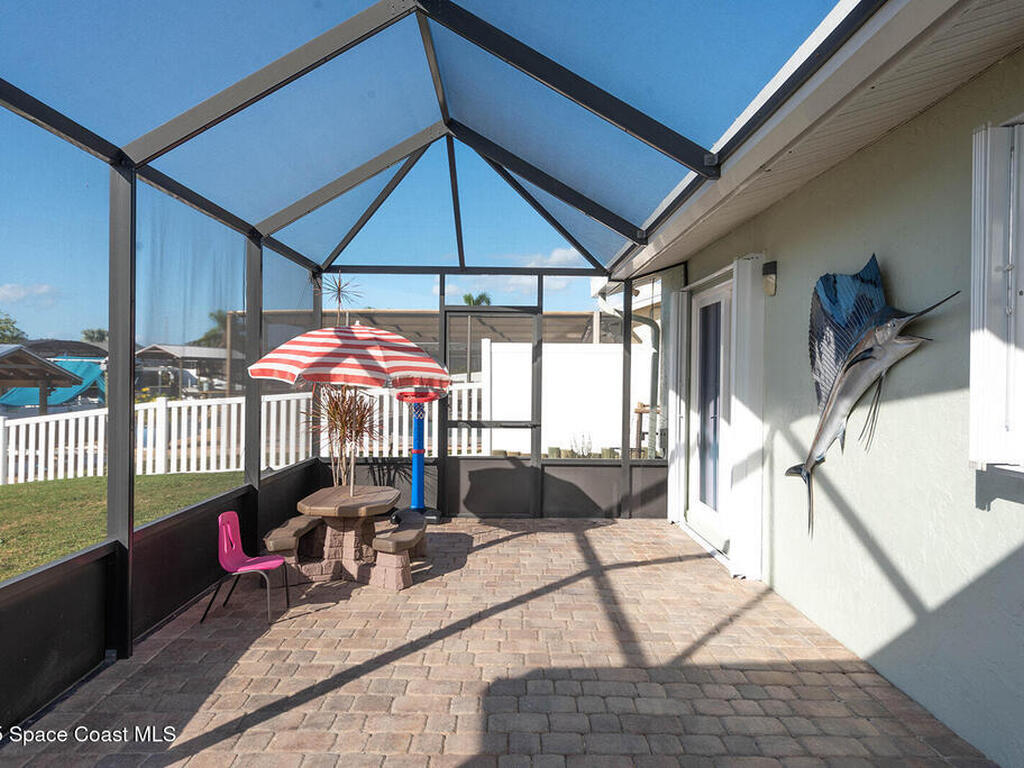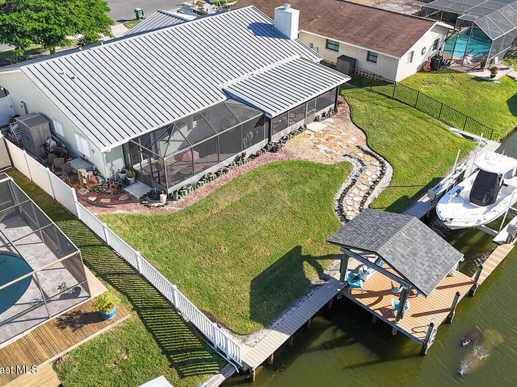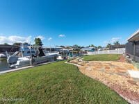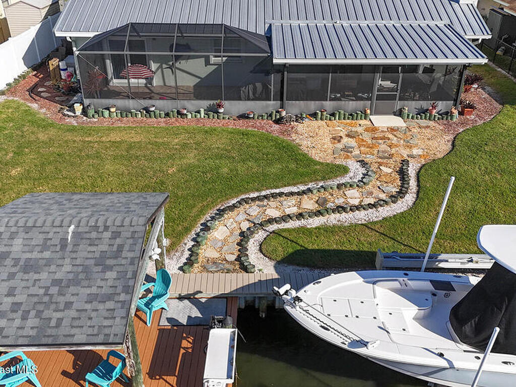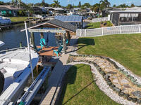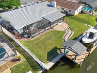Relax in paradise with this updated 3/2 open floor plan. 1 canal away from the barge canal & close to open water! This well-maintained home has a new seawall, dock & 16, 000 lb boat lift! A large open kitchen with island is the center of the home with solid surface countertops & stainless steel appliances. Both bathrooms have new tile. Accordion hurricane shutters give you peace of mind along with double insulated vinyl impact windows. The standing seam metal roof offers years of durability. Pavers & a new screened cage are provided on the back porch where you can sit & watch the manatees (pic #5) & porpoises play. A spacious 2-car garage gives you ample room for your toys. The large attic storage area with truss stairs provides tremendous storage. The home boasts a fireplace with an electric insert (can be used as a wood-burning fireplace). Custom trim work has been completed throughout the home. Electric has been updated & a tankless hot water heater installed.