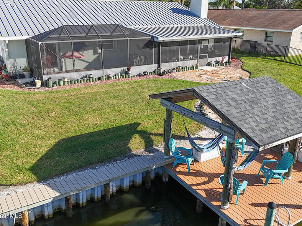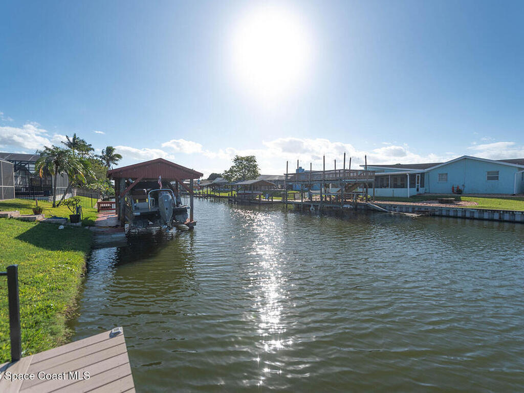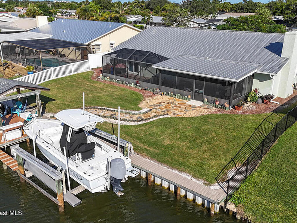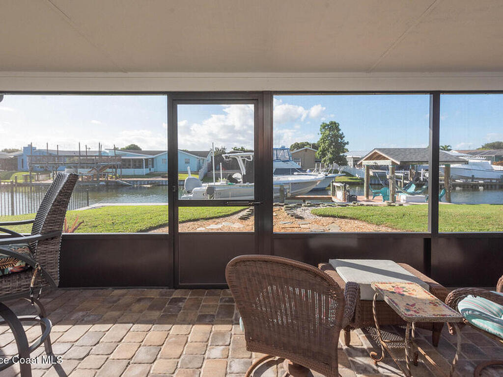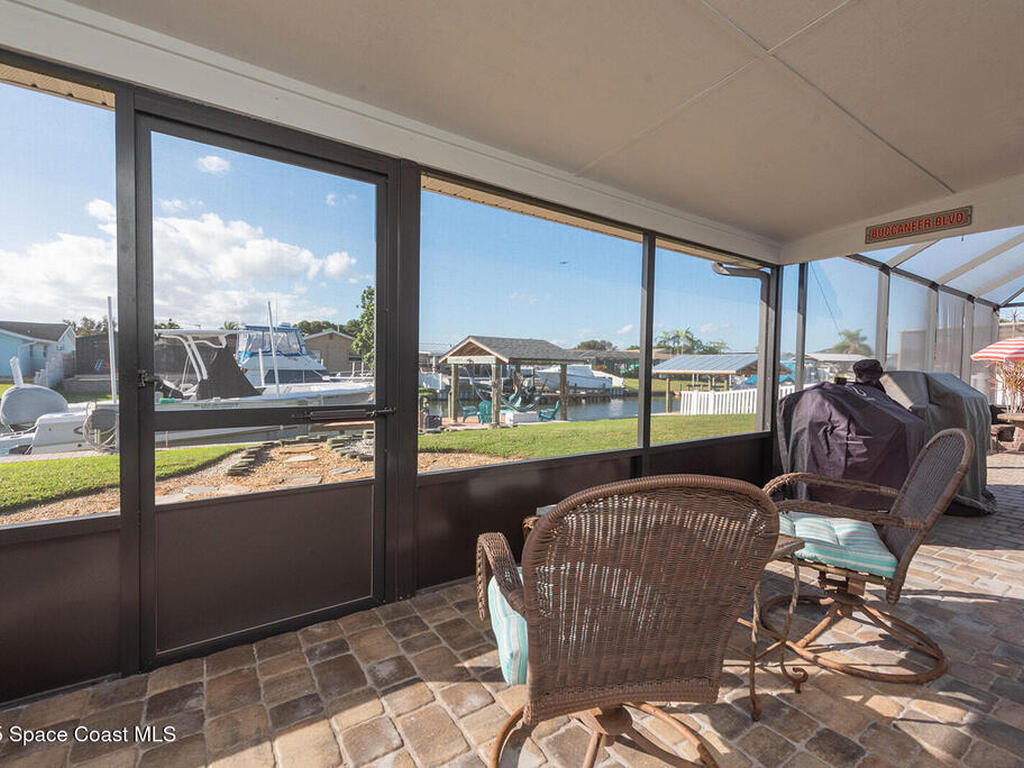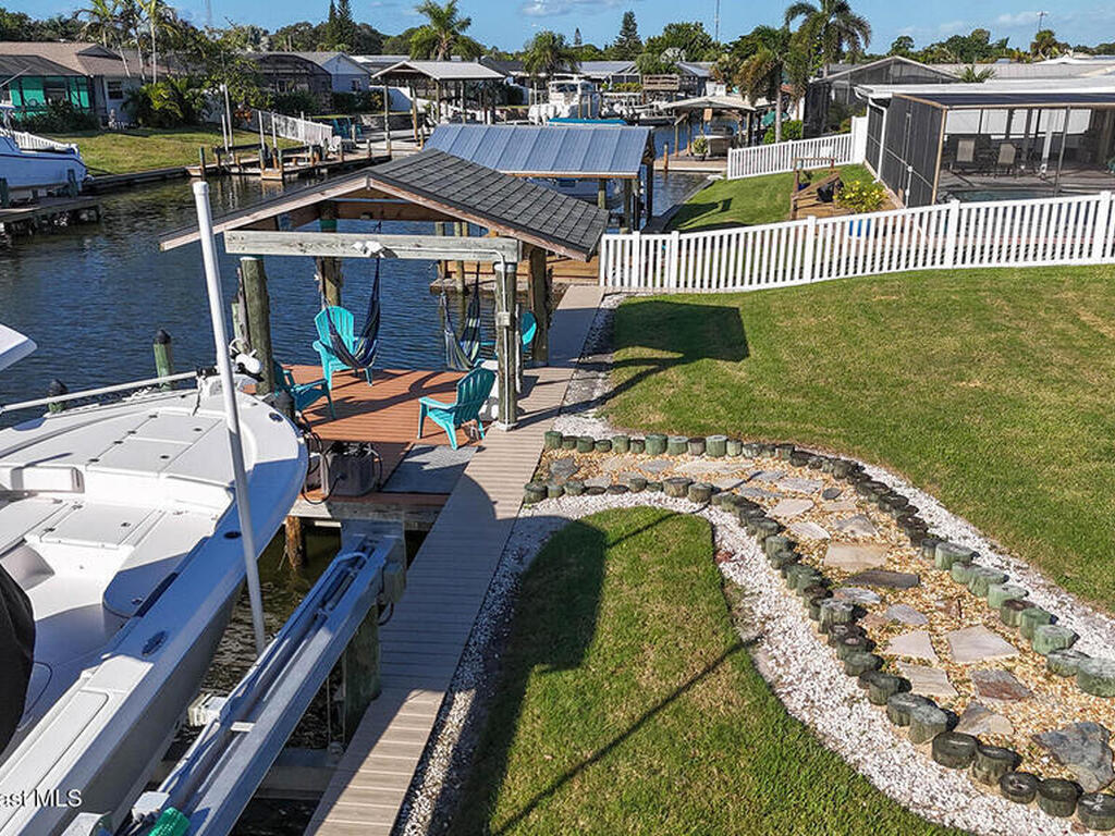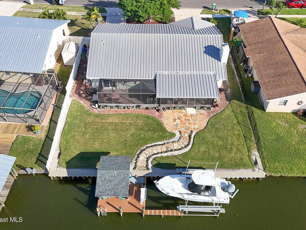 Relax in paradise with this updated 3/2 open floor plan. 1 canal away from the barge canal & close to open water! This well-maintained home has a new seawall, dock & 16, 000 lb boat lift! A large open kitchen with island is the center of the home with solid surface countertops & stainless steel appliances. Both bathrooms have new tile. Accordion hurricane shutters give you peace of mind along with double insulated vinyl impact windows. The standing seam metal roof offers years of durability. Pavers & a new screened cage are provided on the back porch where you can sit & watch the manatees (pic #5) & porpoises play. A spacious 2-car garage gives you ample room for your toys. The large attic storage area with truss stairs provides tremendous storage. The home boasts a fireplace with an electric insert (can be used as a wood-burning fireplace). Custom trim work has been completed throughout the home. Electric has been updated & a tankless hot water heater installed.