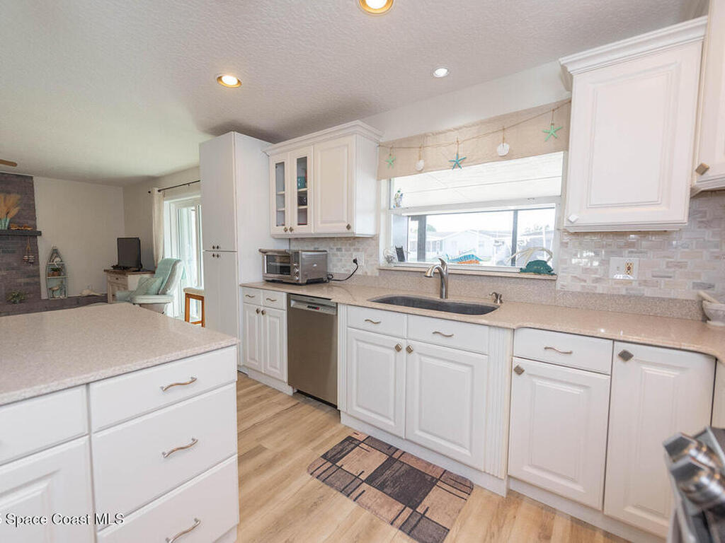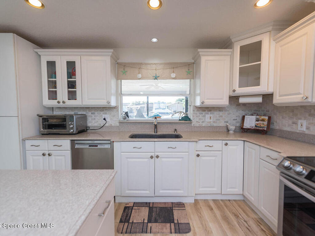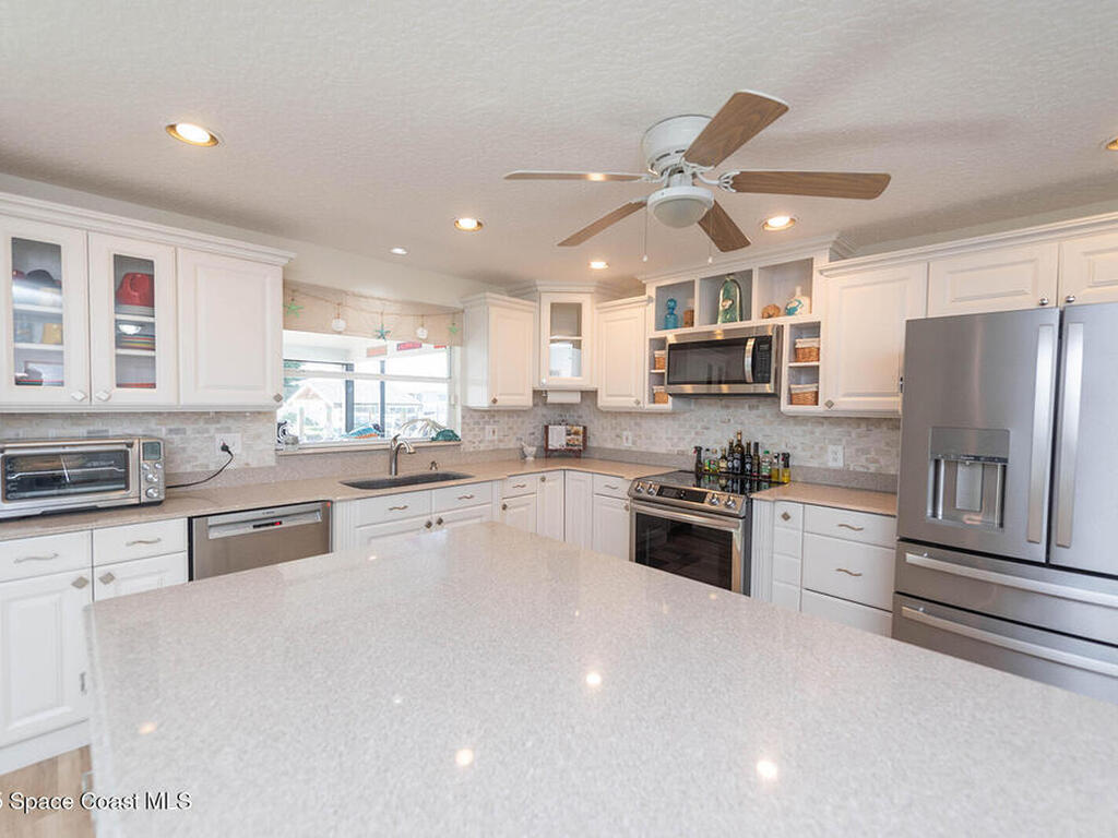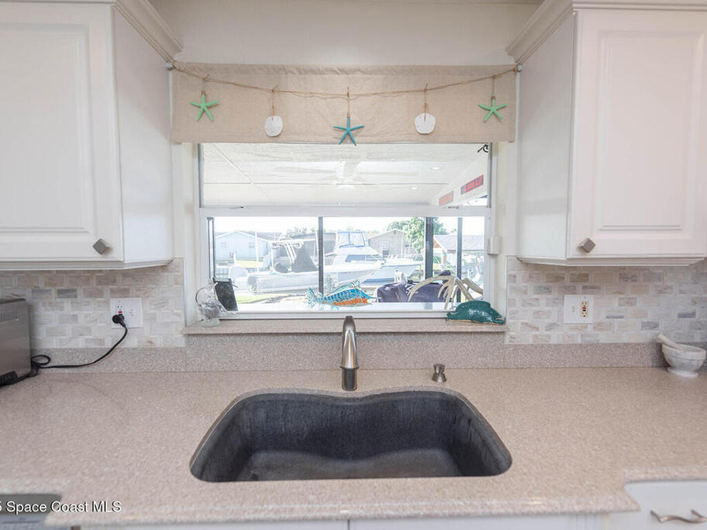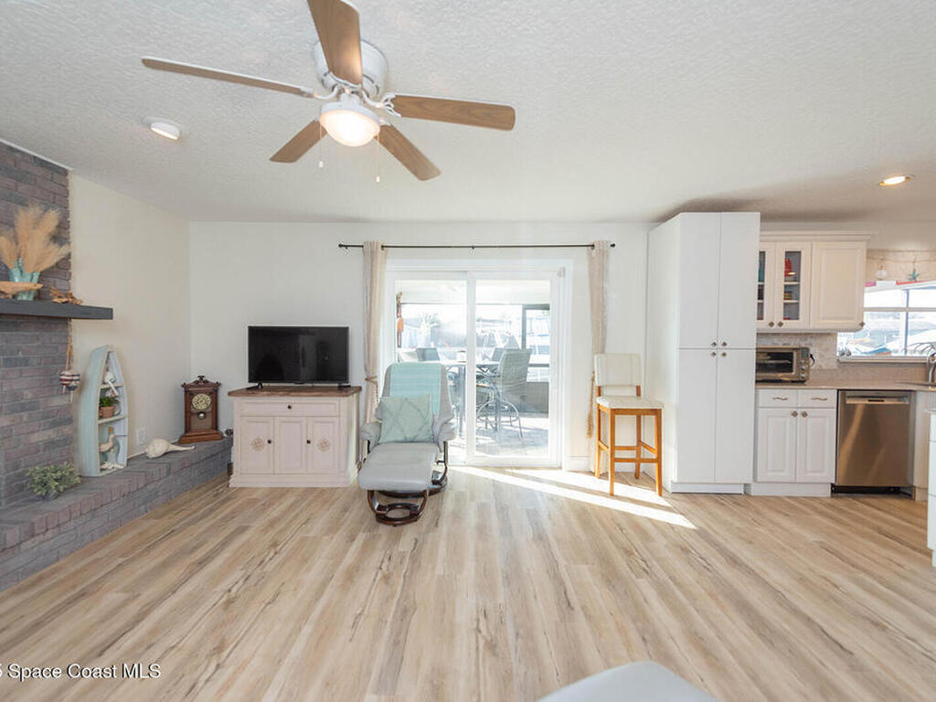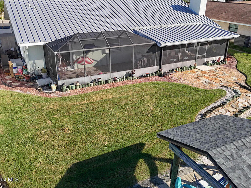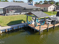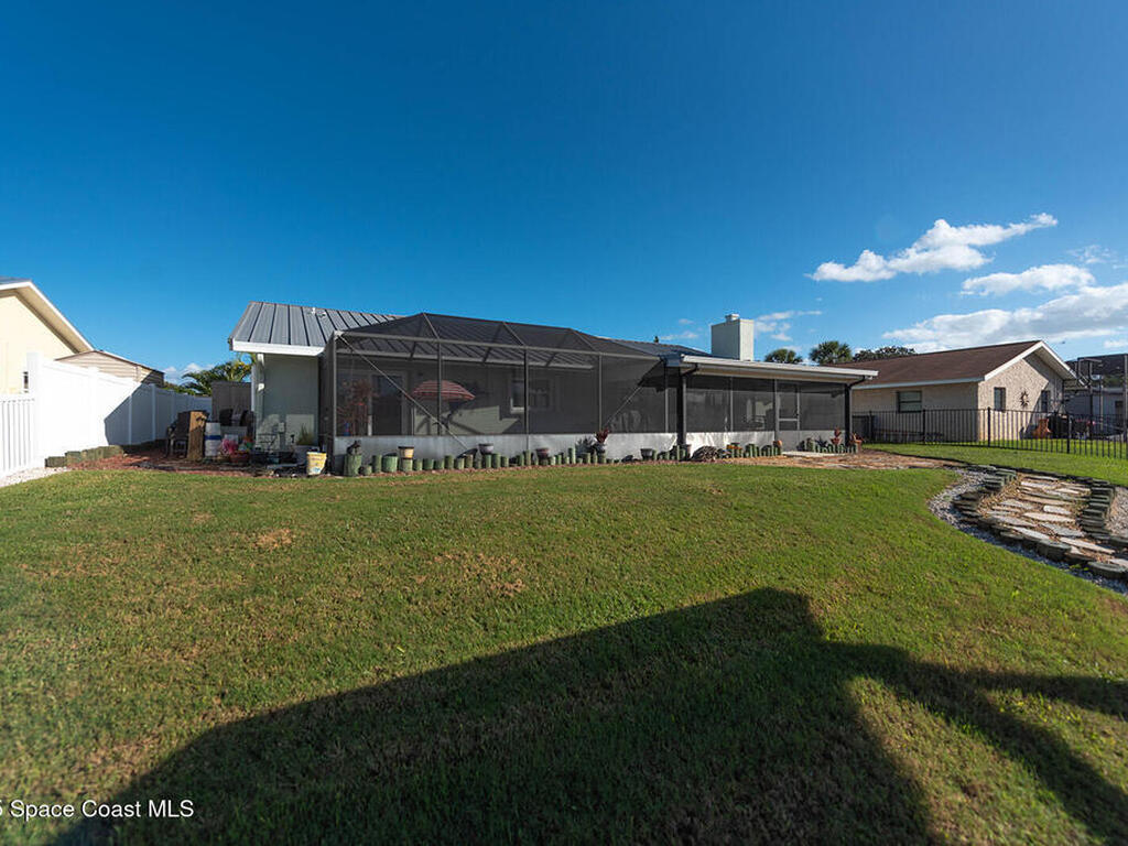 Relax in paradise with this updated 3/2 open floor plan. 1 canal away from the barge canal & close to open water! This well-maintained home has a new seawall, dock & 16, 000 lb boat lift! A large open kitchen with island is the center of the home with solid surface countertops & stainless steel appliances. Both bathrooms have new tile. Accordion hurricane shutters give you peace of mind along with double insulated vinyl impact windows. The standing seam metal roof offers years of durability. Pavers & a new screened cage are provided on the back porch where you can sit & watch the manatees (pic #5) & porpoises play. A spacious 2-car garage gives you ample room for your toys. The large attic storage area with truss stairs provides tremendous storage. The home boasts a fireplace with an electric insert (can be used as a wood-burning fireplace). Custom trim work has been completed throughout the home. Electric has been updated & a tankless hot water heater installed.