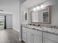 Beachside living at its best, turn-key, move in ready corner unit in desirable Harbor Isles. Just steps from your PRIVATE GARAGE, tennis courts, clubhouse, waterfront boardwalk, pools, ramp road park, & BOAT/RV STORAGE ON SITE. Florida sunrises are just a block way from quiet beach access. Inside, is extremely well maintained with vinyl wood look flooring and coast colors throughout. The chef kitchen features high end granite counters, solid wood cabinetry, and matching stainless appliances. Natural light fills the spacious family room with side windows and over sized slider and wrap around patio overlooking community lake. The waterside primary suite offers walk-in closet matching sold wood vanity w/granite, soaking tub and shower. Two guest bedrooms share a stylishly updated full bathroom. Other updates include roll down hurricane shutters, new A/C and new roofs.
