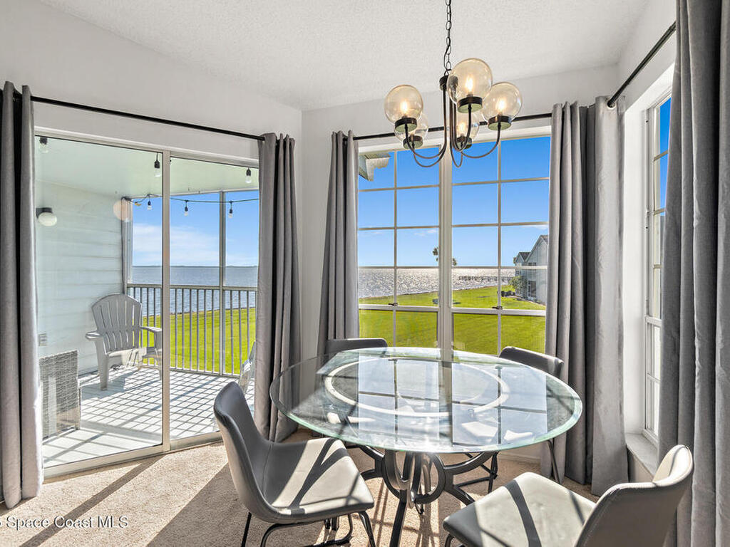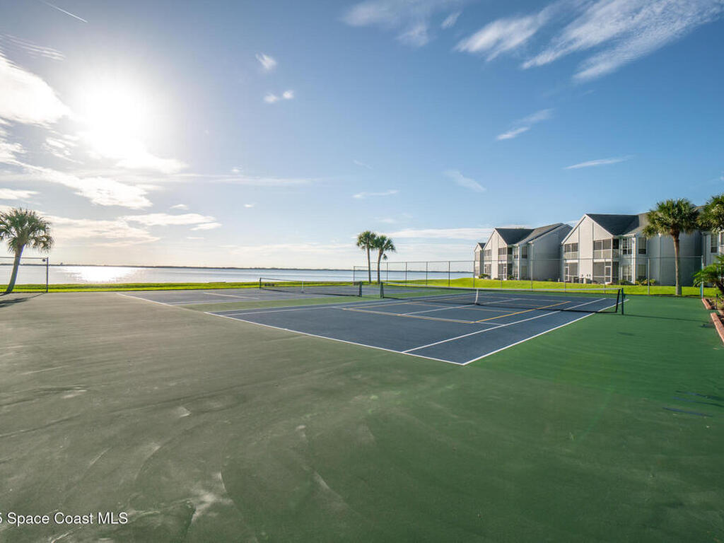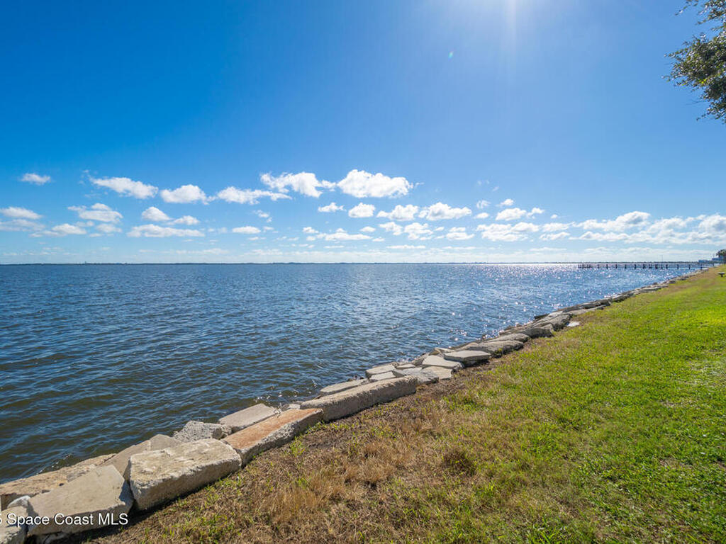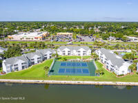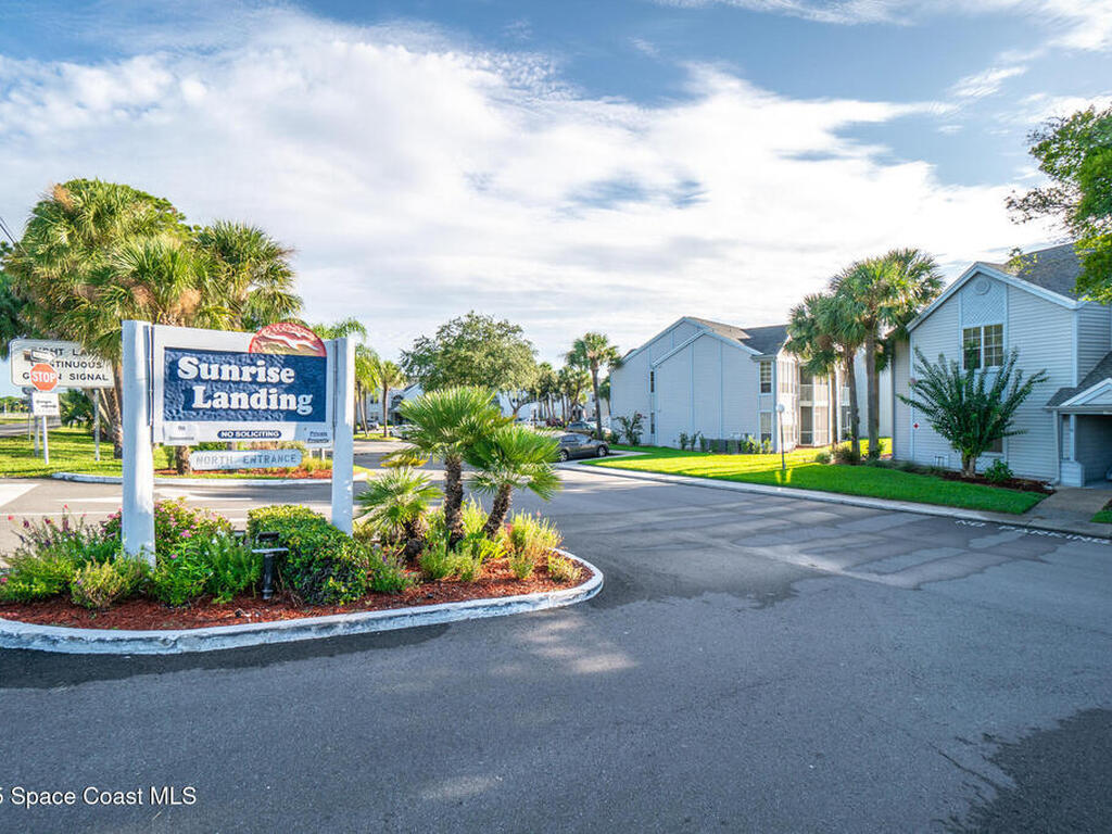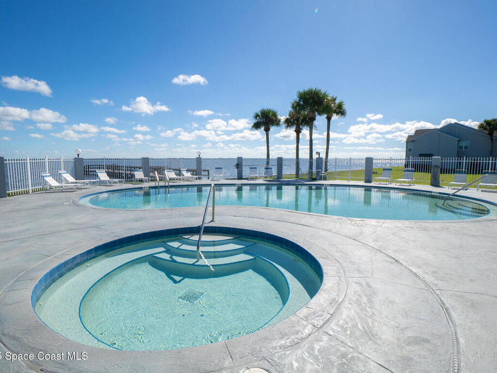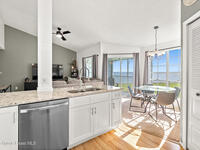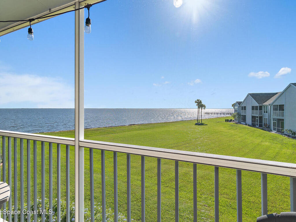 Experience breathtaking Indian River views from this beautifully maintained 2-bed, 2-bath condo in the highly desirable Sunrise Landing community. Soak in the sunshine and watch rocket launches right from your south-facing private screened balcony. Inside, this light-filled unit features an updated kitchen complete with wood-like laminate flooring, newer stainless appliances, bright white cabinetry and sleek granite countertops. The modern open layout flows seamlessly into the dining and living areas, all with spectacular river views. The spacious primary suite includes an ensuite bath with a dual-sink vanity and updated fixtures. Step outside and enjoy the well-manicured grounds and resort-style amenities including a private dock, 2 pools, 2 hot tubs, 2 saunas, 2 fishing piers, 2 clubhouses, 2 spas, tennis, pickleball & shuffleboard courts! Enjoy active community events and peaceful waterfront living all in one! Pet-friendly with low HOA fees. Assigned parking is right at your door!