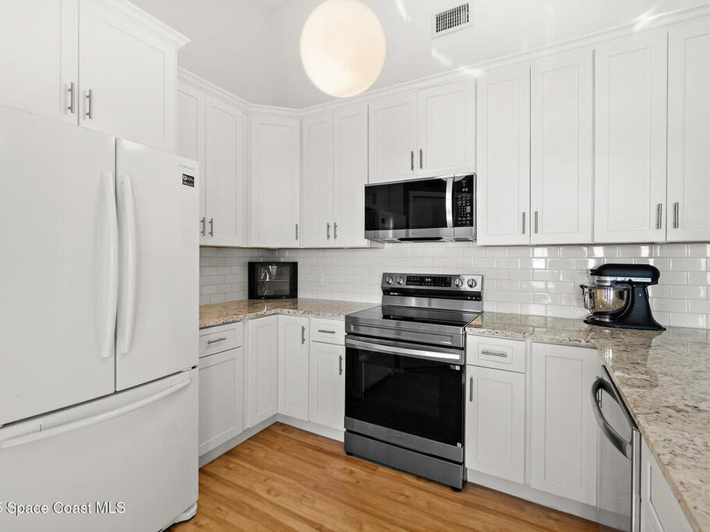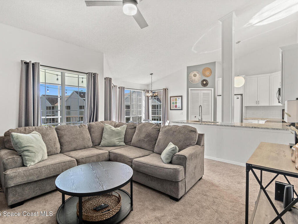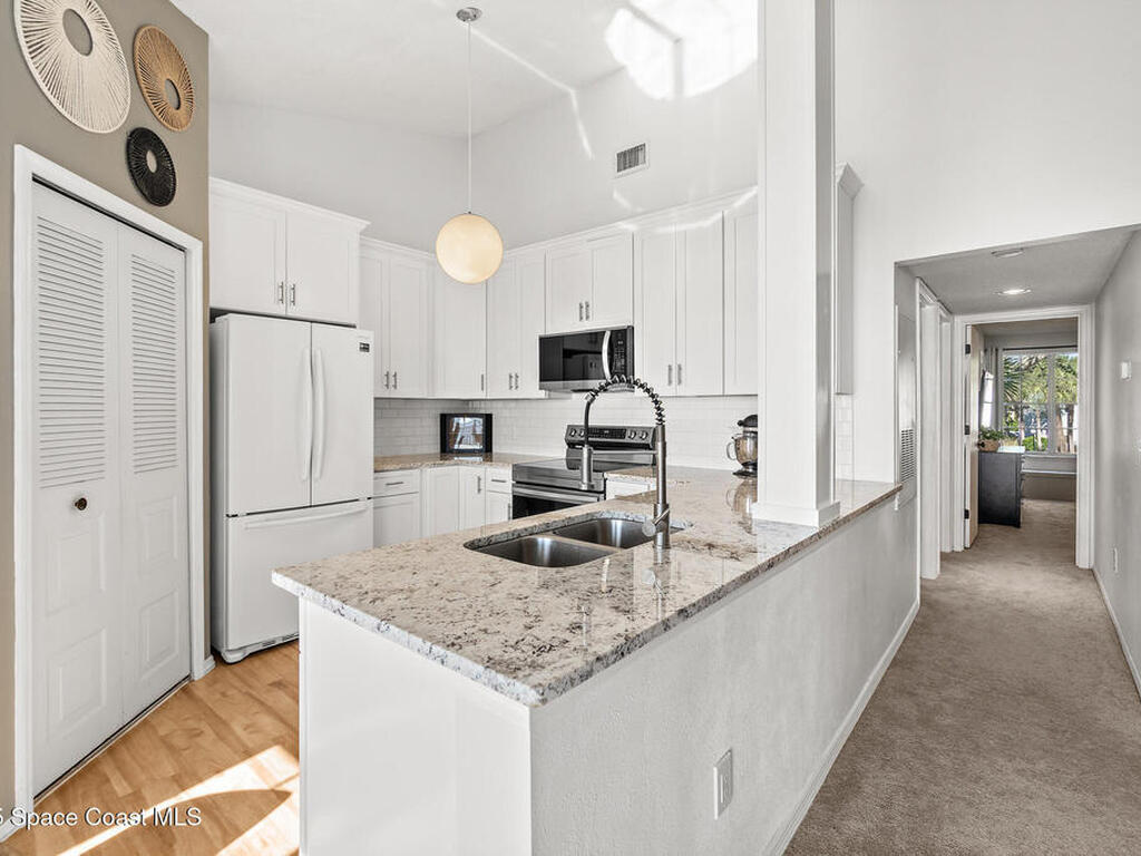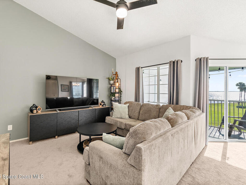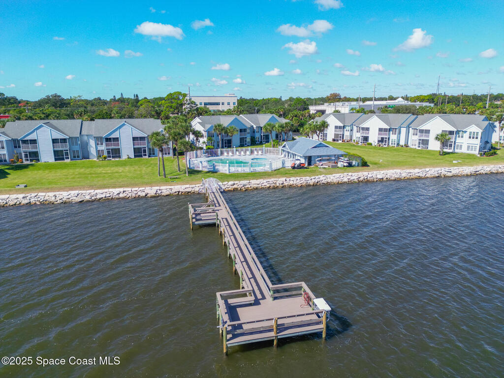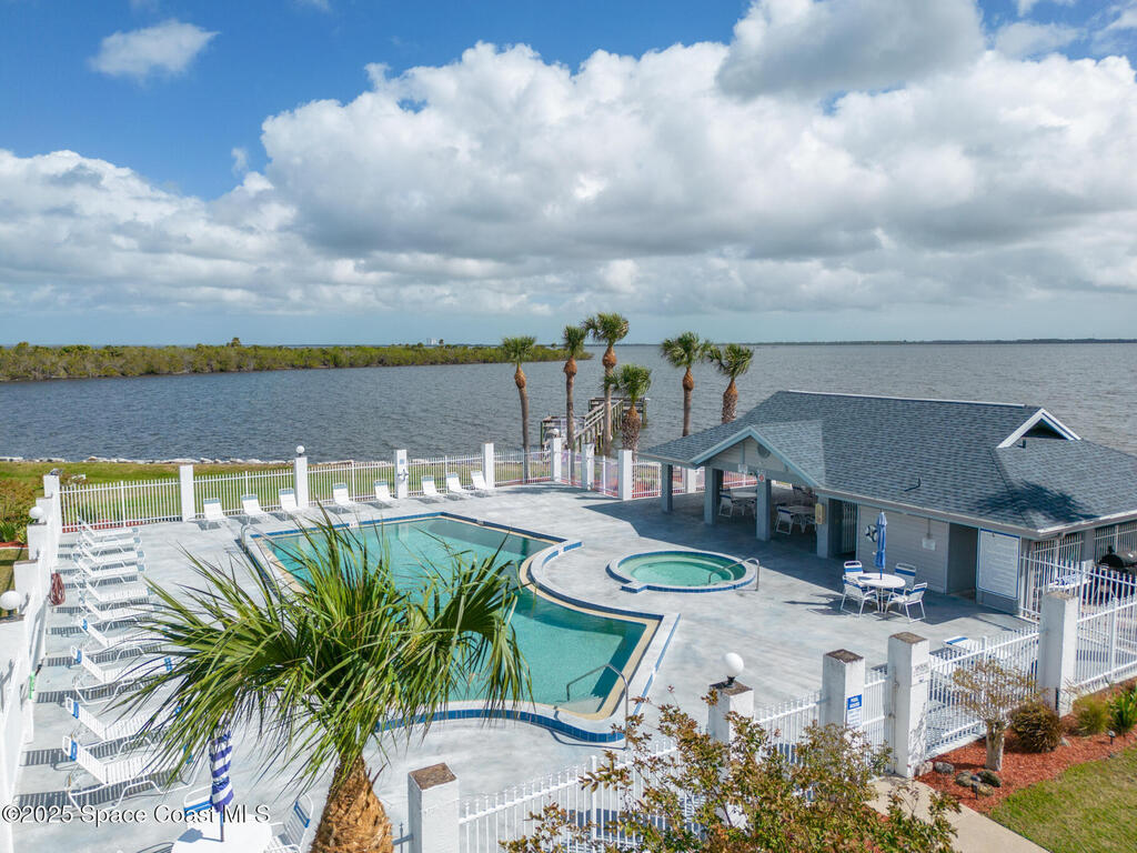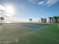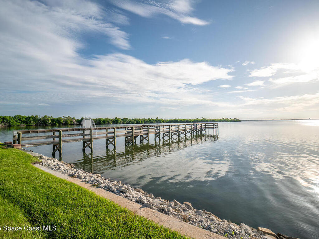 Experience breathtaking Indian River views from this beautifully maintained 2-bed, 2-bath condo in the highly desirable Sunrise Landing community. Soak in the sunshine and watch rocket launches right from your south-facing private screened balcony. Inside, this light-filled unit features an updated kitchen complete with wood-like laminate flooring, newer stainless appliances, bright white cabinetry and sleek granite countertops. The modern open layout flows seamlessly into the dining and living areas, all with spectacular river views. The spacious primary suite includes an ensuite bath with a dual-sink vanity and updated fixtures. Step outside and enjoy the well-manicured grounds and resort-style amenities including a private dock, 2 pools, 2 hot tubs, 2 saunas, 2 fishing piers, 2 clubhouses, 2 spas, tennis, pickleball & shuffleboard courts! Enjoy active community events and peaceful waterfront living all in one! Pet-friendly with low HOA fees. Assigned parking is right at your door!