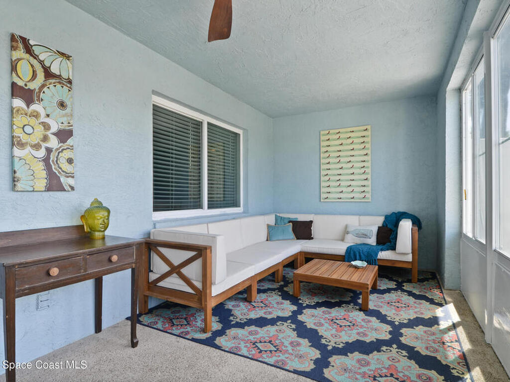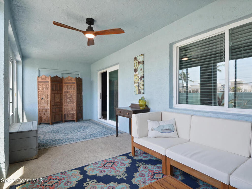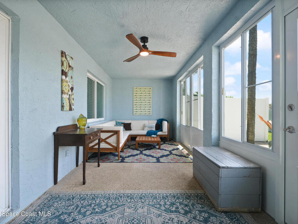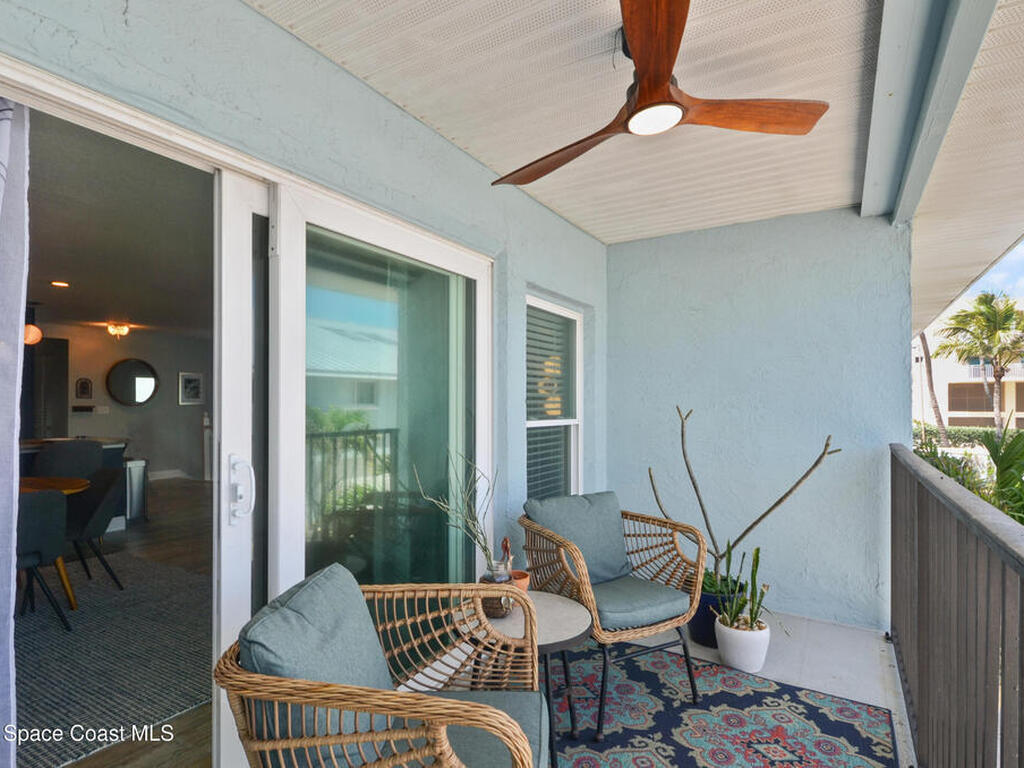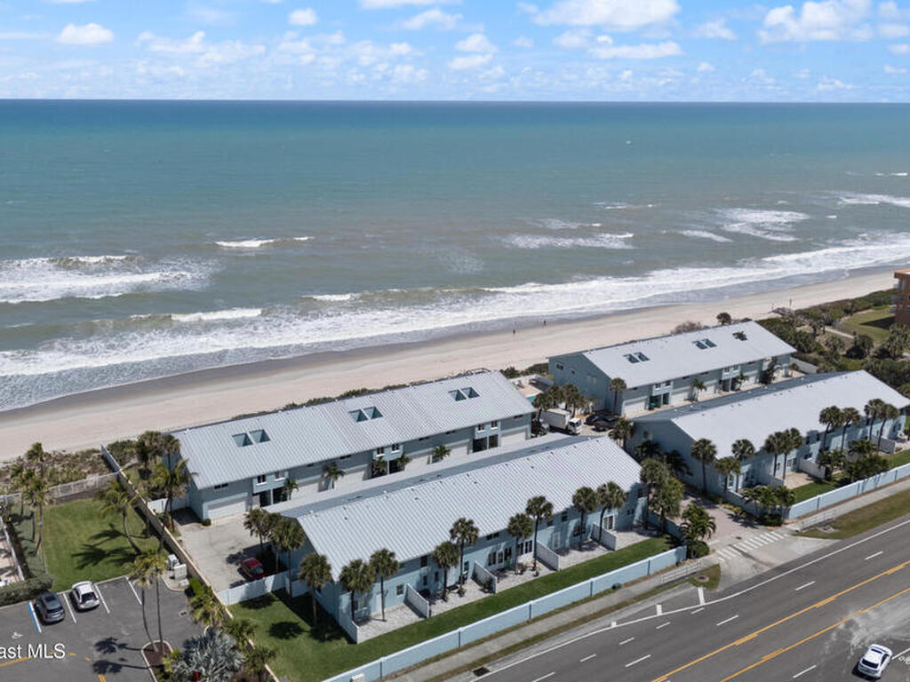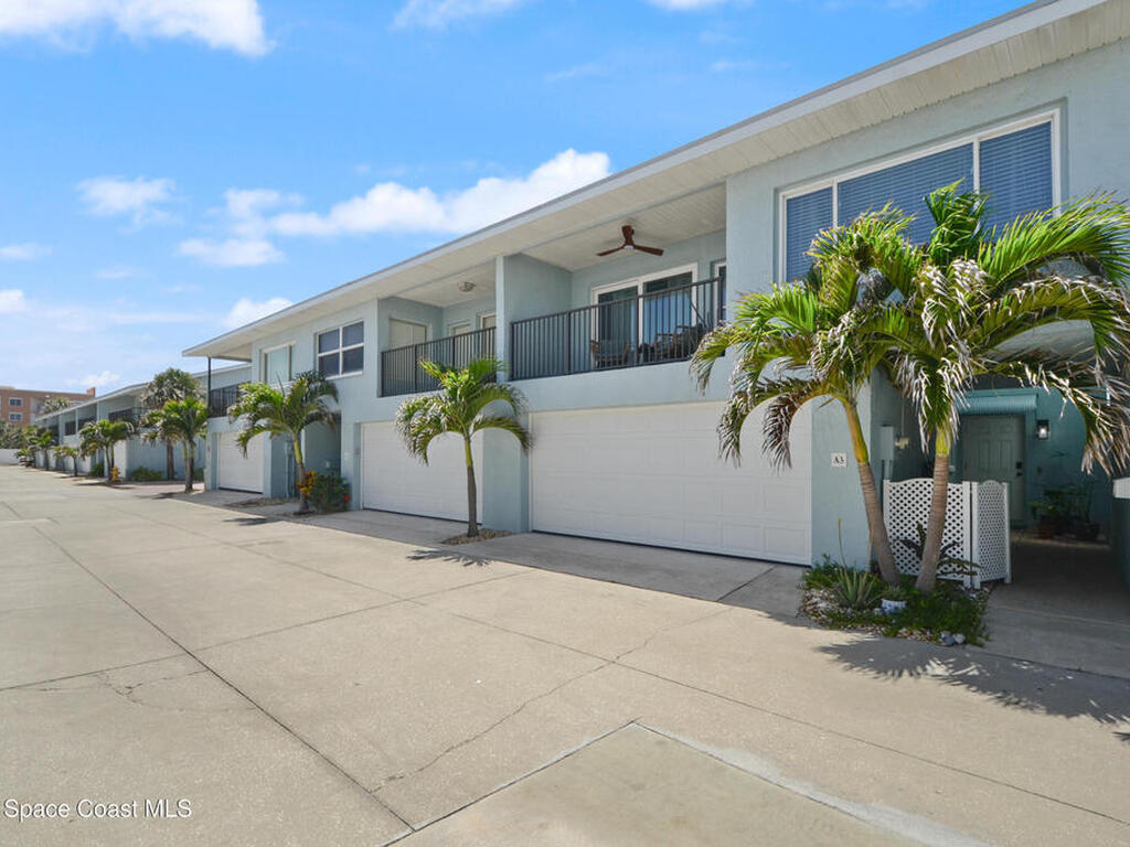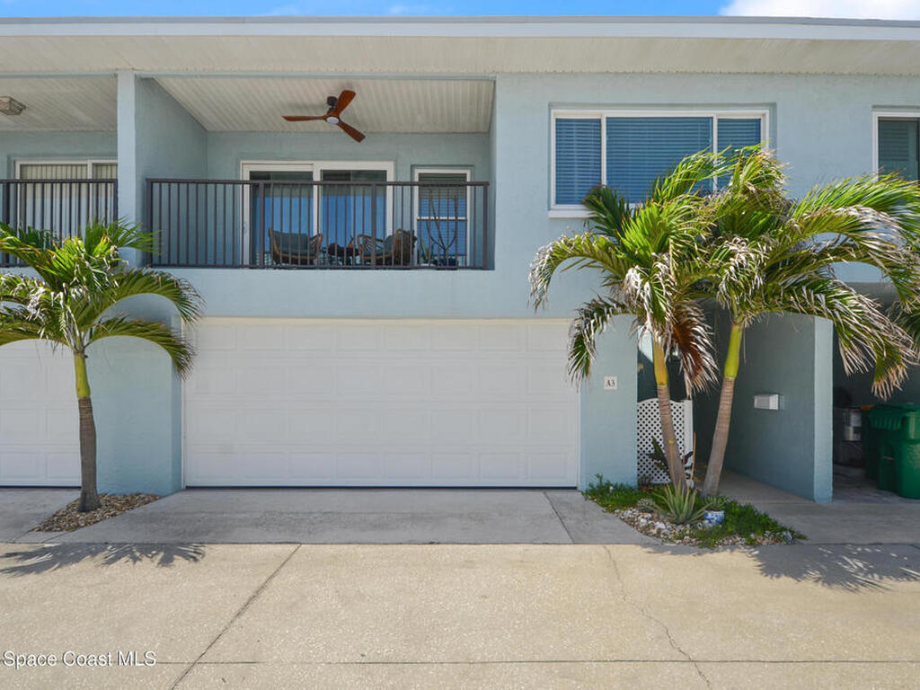 The perfect beach condo with brand new Lennox A/C, installed 2025, awaits you and your pets of any number, breed and size! It's the only beach condo complex in Indian Harbour Beach with no pet restrictions, and private, 2 car, attached garage. The spacious garage has a newly coated floor and, not only a Tesla charger, but a Tesla inverter to facilitate powering the entire unit. This stylishly appointed 3/3 is unique in so many ways, because almost the entire first level can be utilized as a multi-generational suite, or private guest suite, including a kitchenette with mini fridge, microwave and toaster oven and adjacent Florida room. With convenient beach access through the gorgeous pool area with brand new outdoor shower, and only minutes away from great shopping, dining and entertainment, this location and situation is literally the best of all worlds. Hurricane rated windows, sliders and garage door.