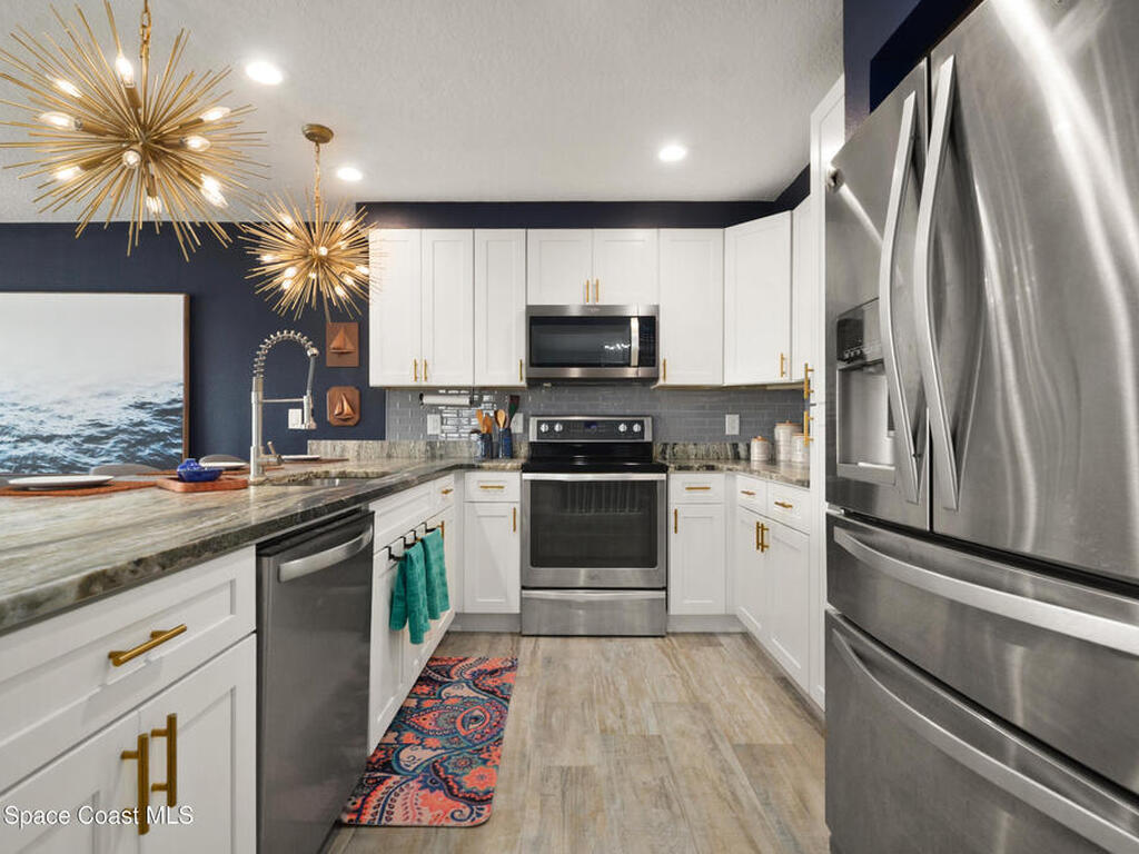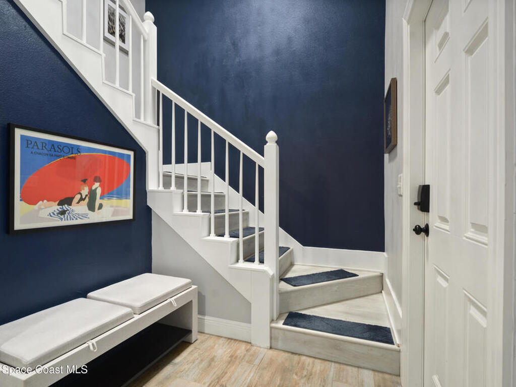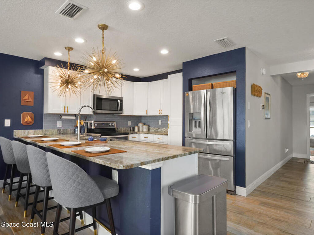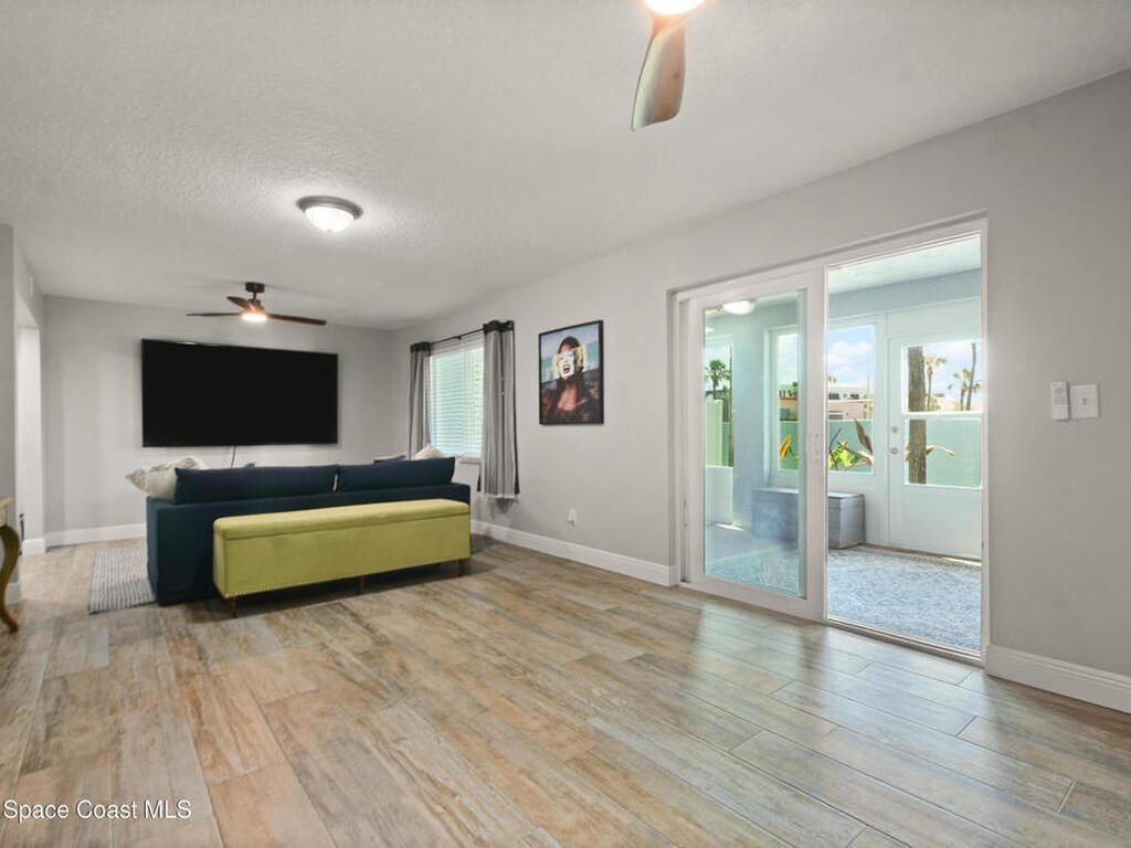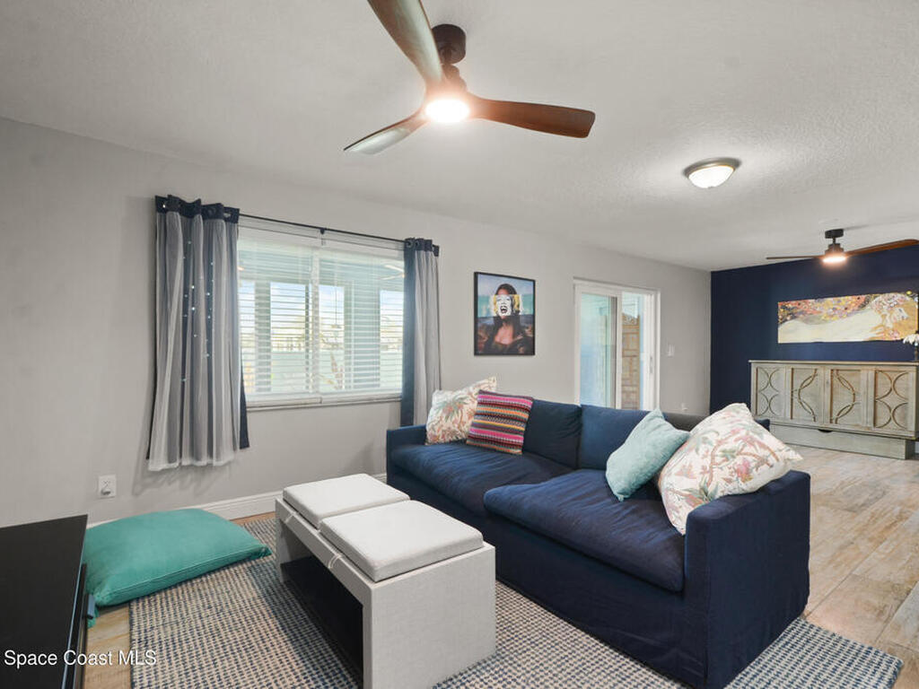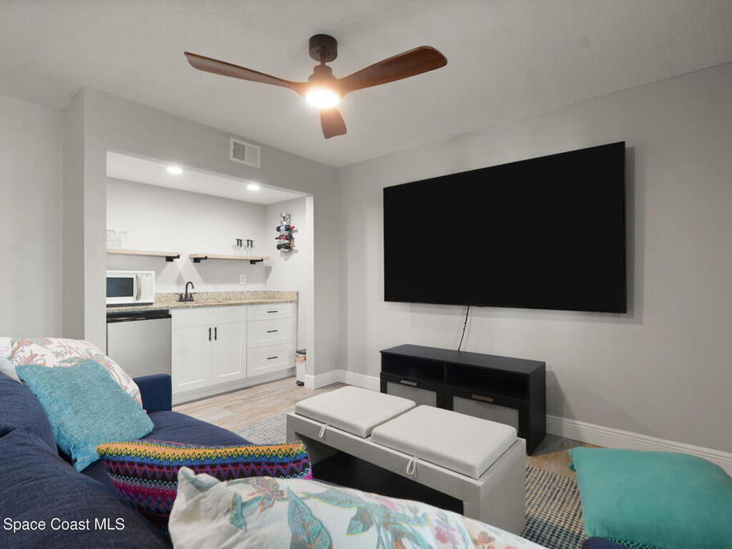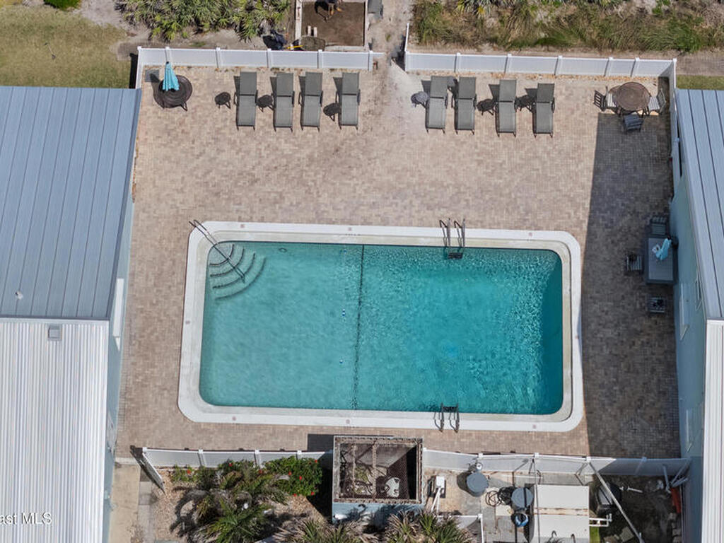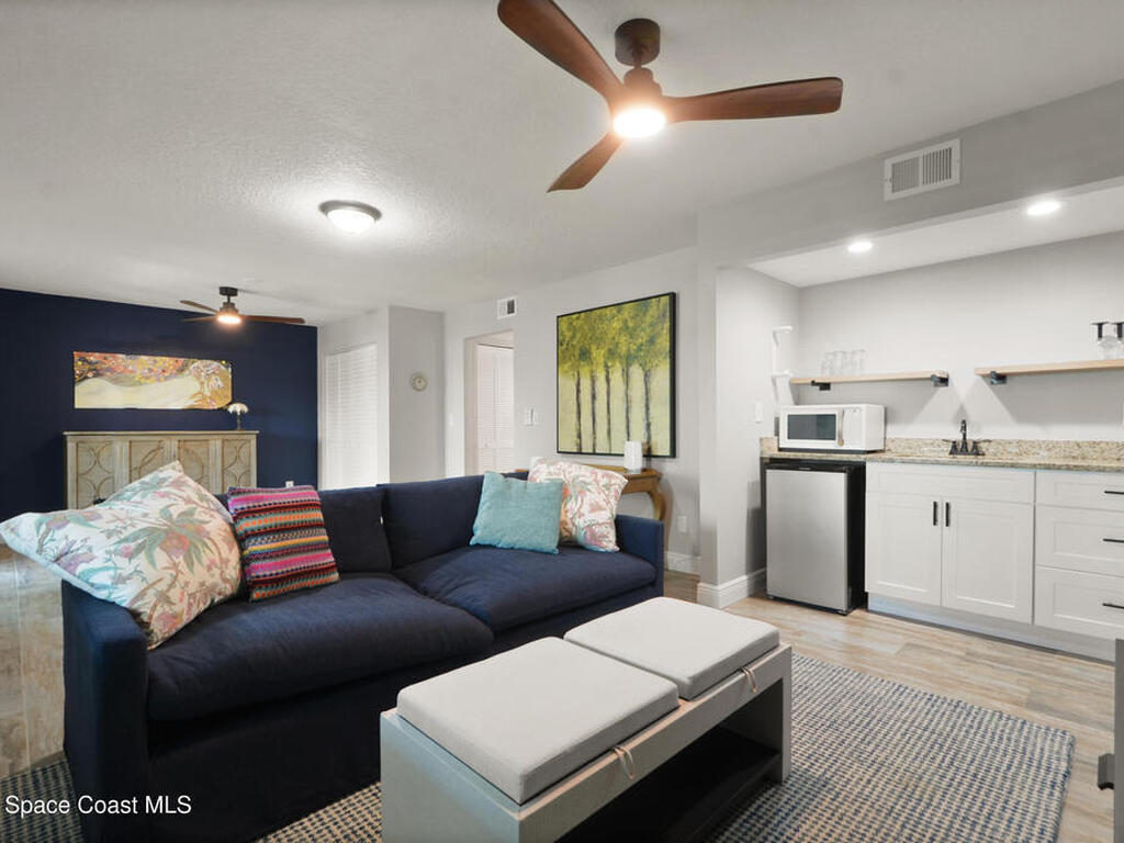 The perfect beach condo with brand new Lennox A/C, installed 2025, awaits you and your pets of any number, breed and size! It's the only beach condo complex in Indian Harbour Beach with no pet restrictions, and private, 2 car, attached garage. The spacious garage has a newly coated floor and, not only a Tesla charger, but a Tesla inverter to facilitate powering the entire unit. This stylishly appointed 3/3 is unique in so many ways, because almost the entire first level can be utilized as a multi-generational suite, or private guest suite, including a kitchenette with mini fridge, microwave and toaster oven and adjacent Florida room. With convenient beach access through the gorgeous pool area with brand new outdoor shower, and only minutes away from great shopping, dining and entertainment, this location and situation is literally the best of all worlds. Hurricane rated windows, sliders and garage door.