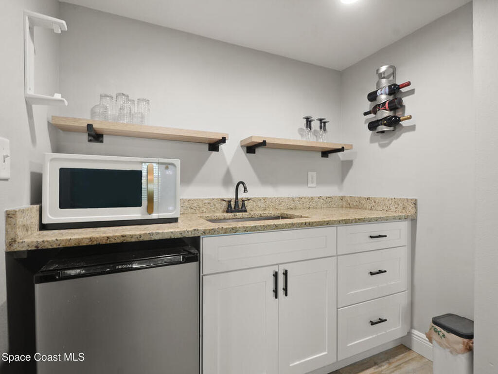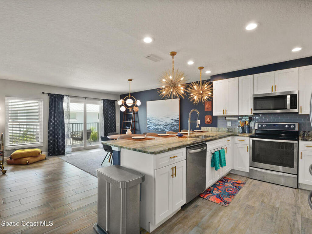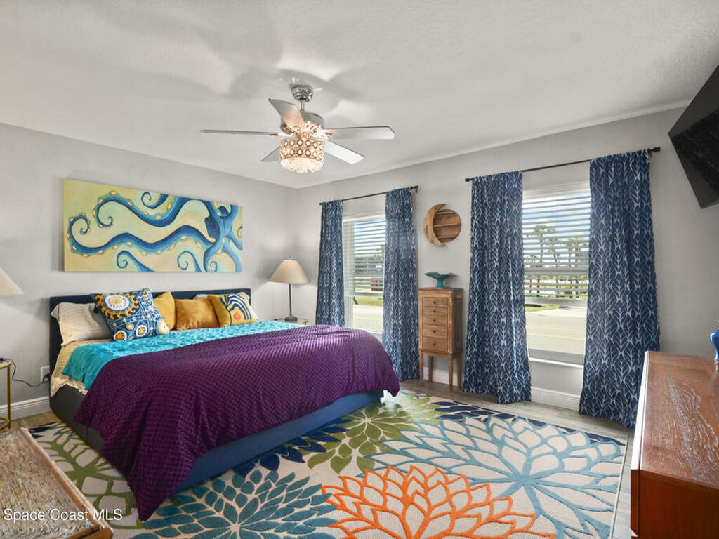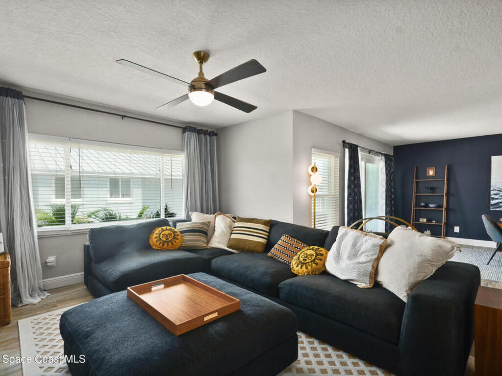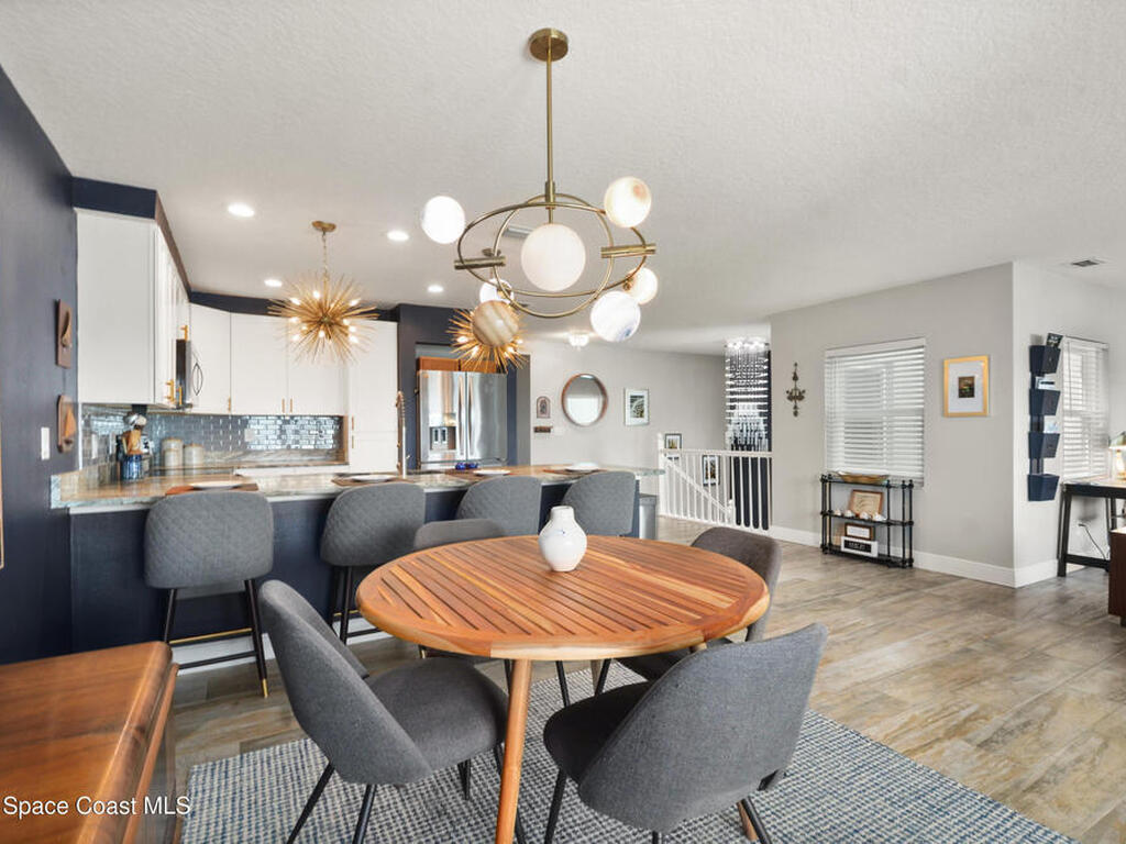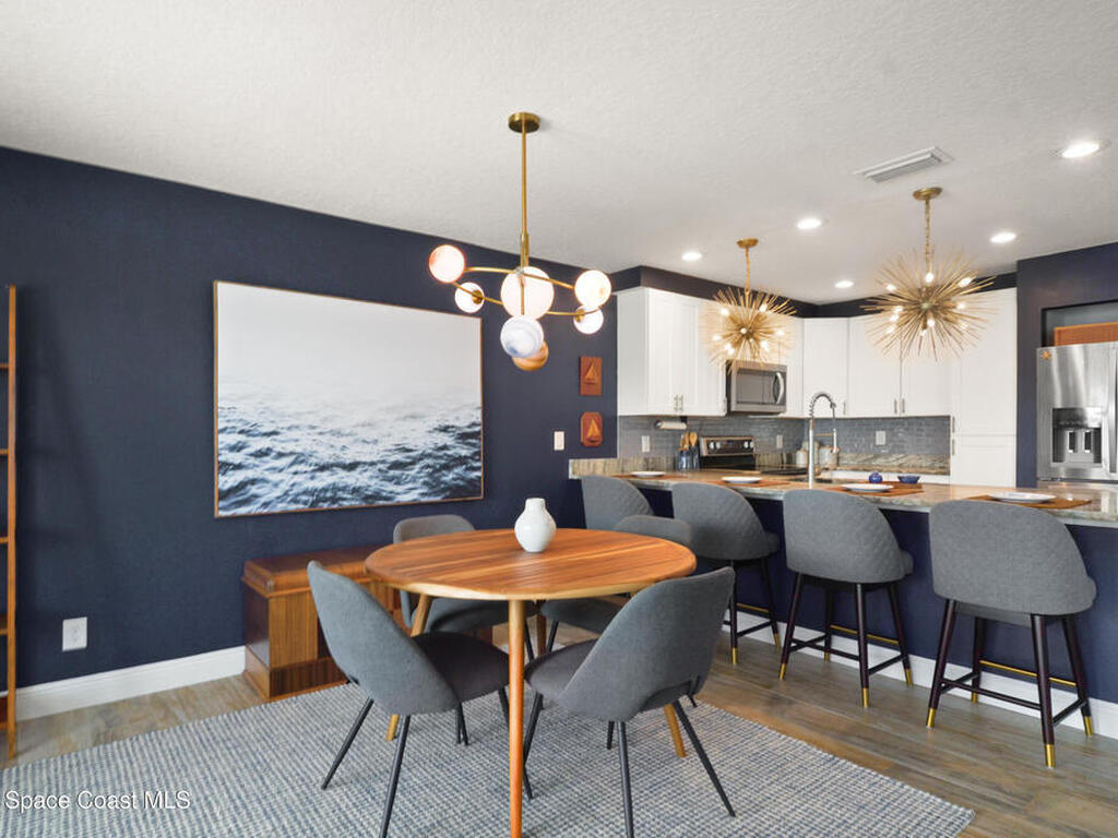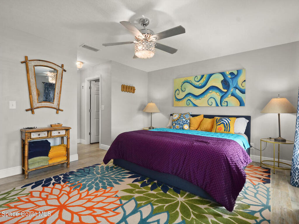 The perfect beach condo with brand new Lennox A/C, installed 2025, awaits you and your pets of any number, breed and size! It's the only beach condo complex in Indian Harbour Beach with no pet restrictions, and private, 2 car, attached garage. The spacious garage has a newly coated floor and, not only a Tesla charger, but a Tesla inverter to facilitate powering the entire unit. This stylishly appointed 3/3 is unique in so many ways, because almost the entire first level can be utilized as a multi-generational suite, or private guest suite, including a kitchenette with mini fridge, microwave and toaster oven and adjacent Florida room. With convenient beach access through the gorgeous pool area with brand new outdoor shower, and only minutes away from great shopping, dining and entertainment, this location and situation is literally the best of all worlds. Hurricane rated windows, sliders and garage door.
