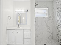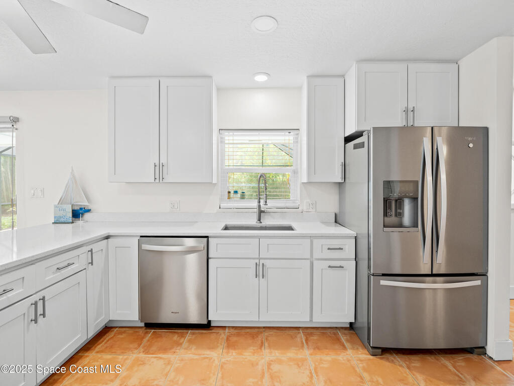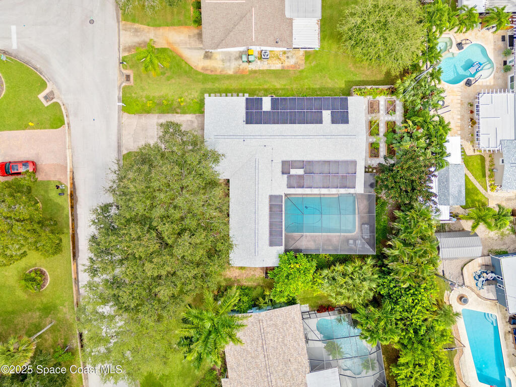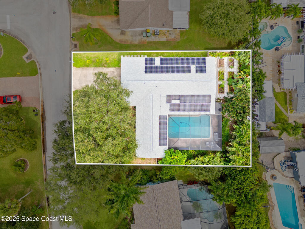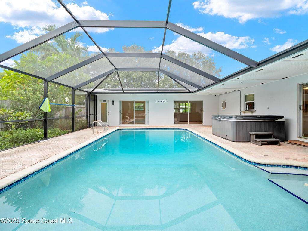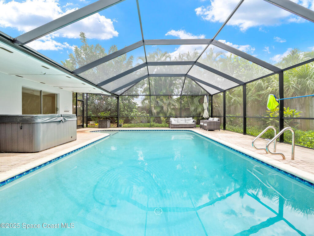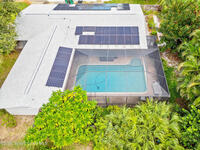 Beachside pool home with paid off solar at closing! 2021 Roof, 200 Amp Electric Box, Impact Windows, and doors. Step into this meticulously kept home, as you walk in you have a living room, which leads to the primary bedroom with a remodeled bathroom that has a pool door and walk in closet. As you keep walking you have your oversized laundry room with plenty of storage available, conveniently located dining room and your remodeled kitchen with newer soft close, all wood cabinets, quartz countertops, and one year old stainless steel appliances! A true split floor plan with two more bedrooms, a remodeled bathroom and a living area. Your private oasis in the backyard with a screened in pool, hot tub and an expansive deck perfect for lounging or hosting guests! The solar panels come with a backup battery so you have power even when the power grid goes out. You have a garden on the side of the house with fruits and vegetables ready to harvest! Come see this centrally located beach home!