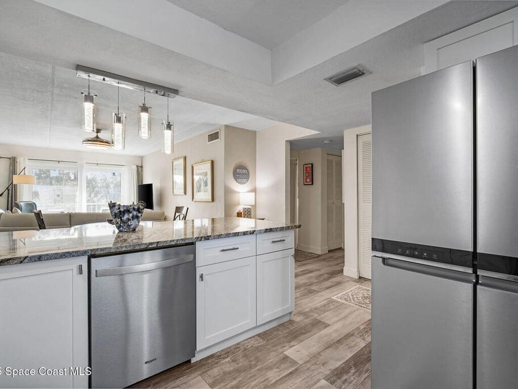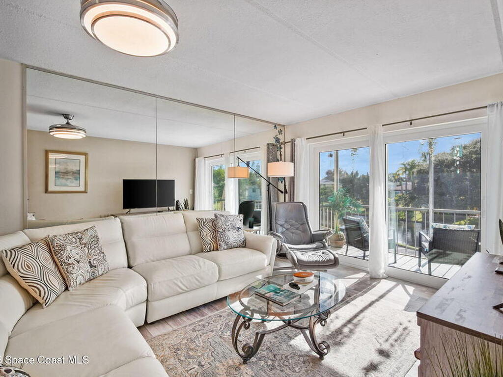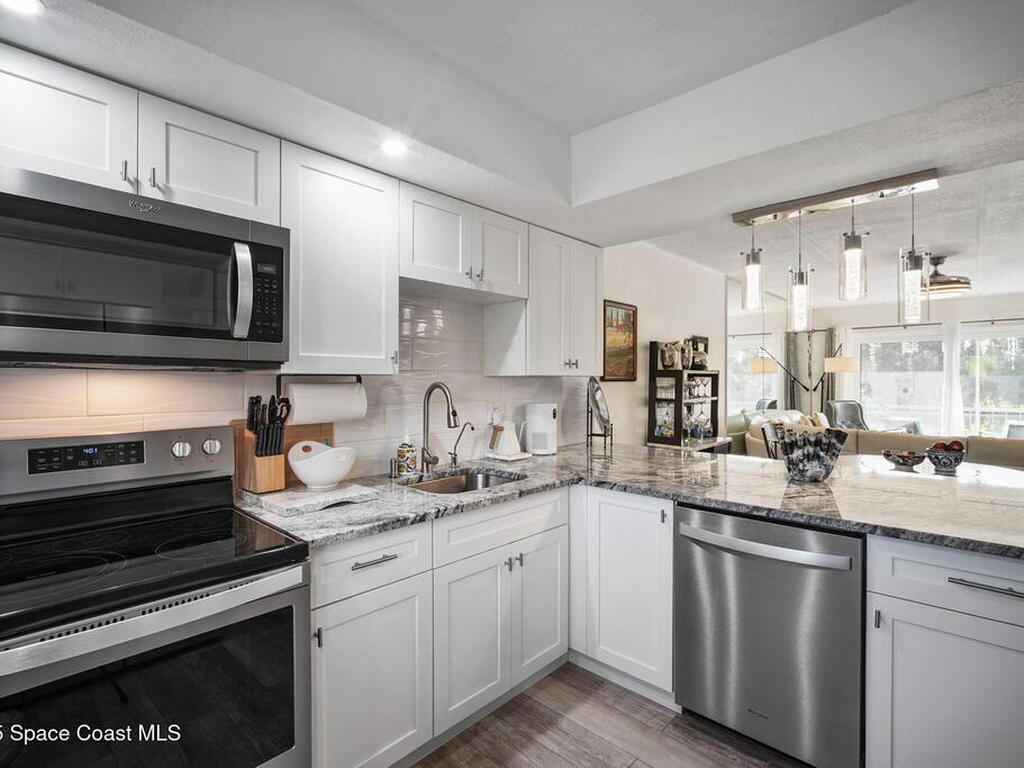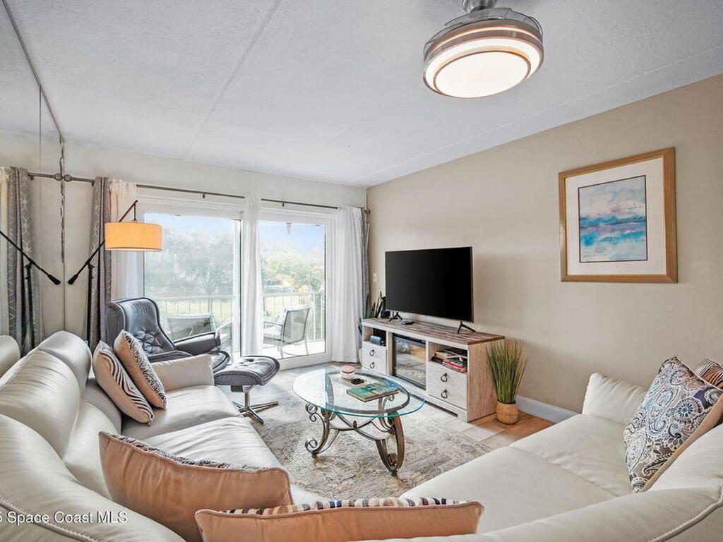 Welcome to 1001 W Eau Gallie Blvd, Unit 229--a bright, move-in-ready home in a canal-facing building steps from the Eau Gallie Arts District (EGAD) and just minutes across the causeway to Canova Beach. Start your day with coffee on the private balcony while boats drift by; stretch out on the property's expansive lawn to the river for sunset; then cool off at the community canal-facing pool. Weekends are effortless: stroll to murals, galleries, cafes, breweries, and markets, or launch a kayak/paddleboard from the community dock with boat access via the canal.Inside, modern comfort meets durability: impact windows (2024) and custom impact sliders, luxury plank flooring throughout, and a smart layout with a barn door that creates a private primary suite, plus in-unit laundry. The remodeled kitchen shines with quartz countertops, an oversized island with storage on both sides, soft-close cabinetry, a deep farmhouse sink, and in-sink water filtration. All major appliances included