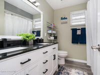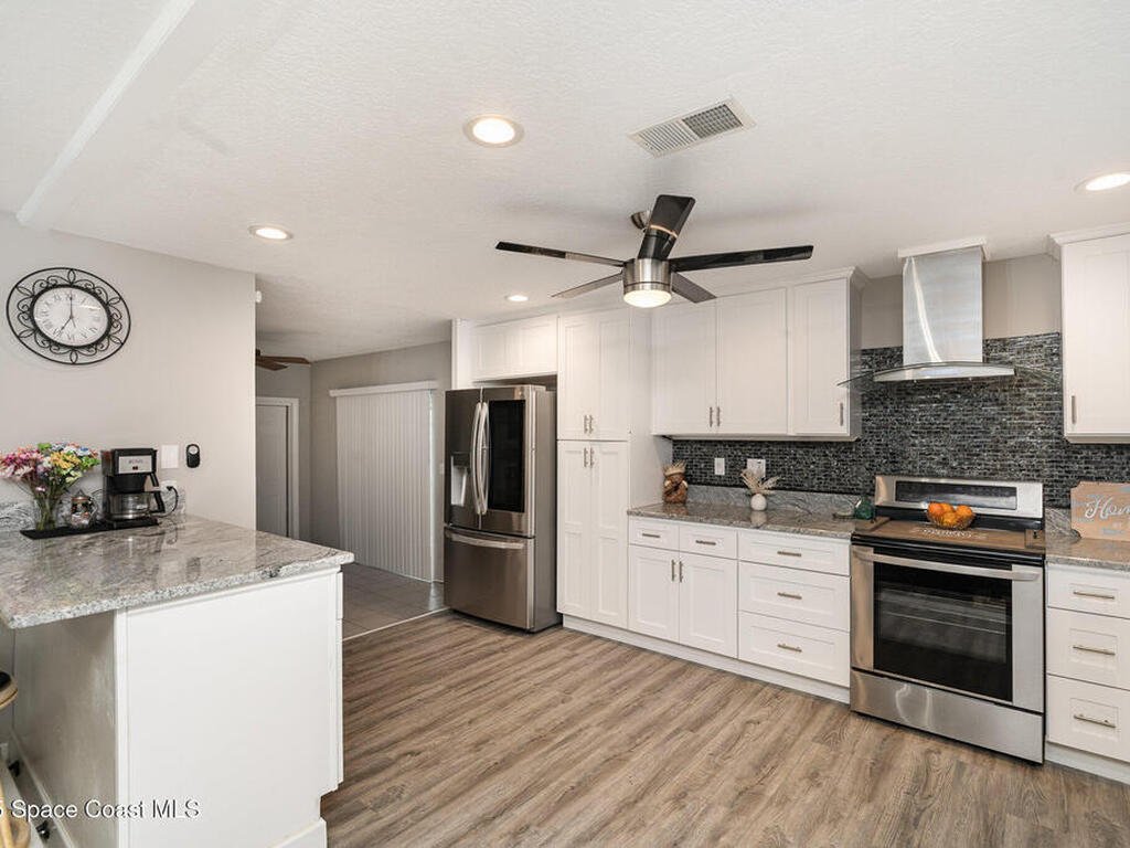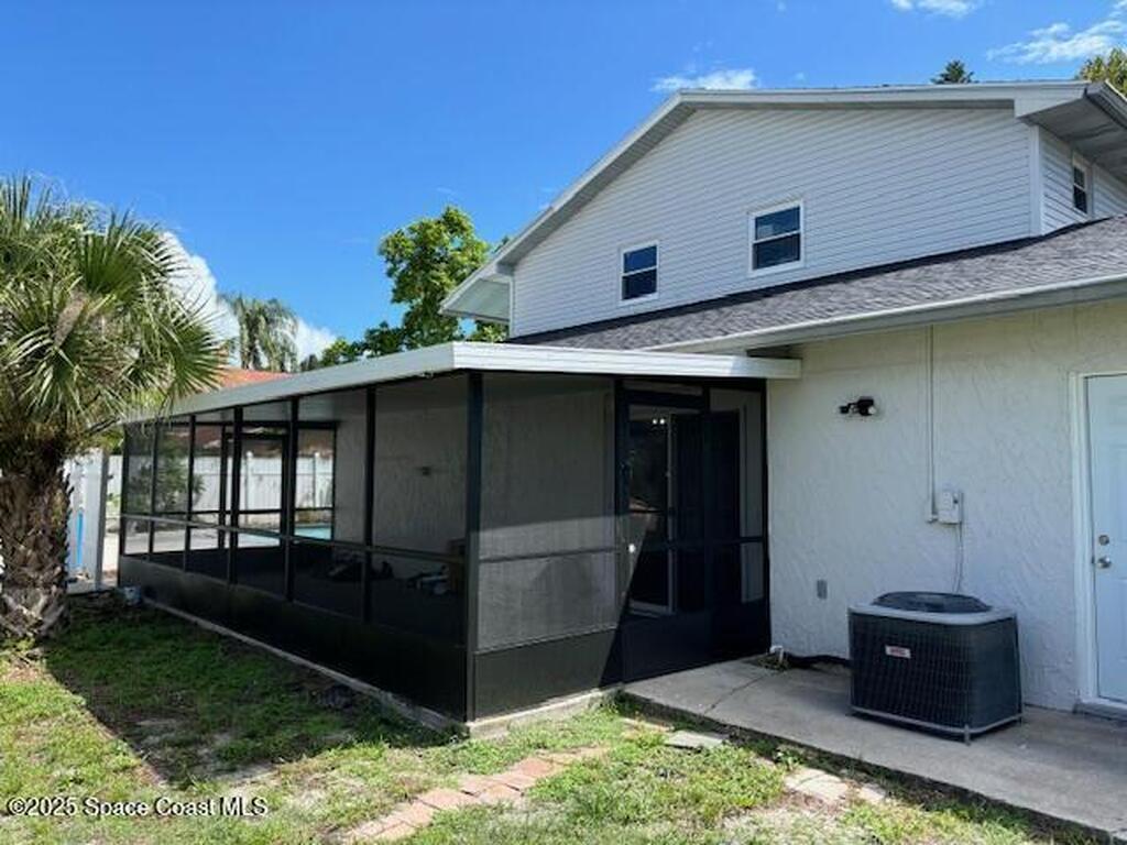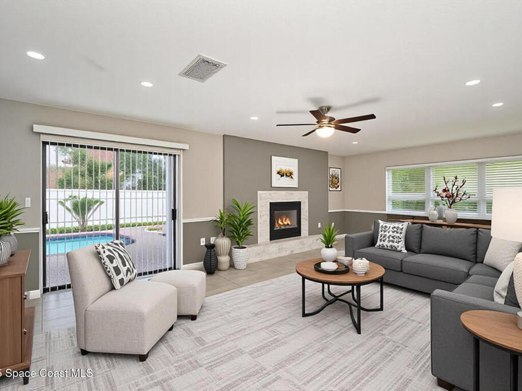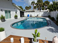 Unique 3 bed/3 bath pool home in S. Merritt Island! Lg corner lot w/fenced side yard & pool area! Pool refinished w/8 ft deep end, newer equip, and refinished pool deck! Newer HVAC, panel, and BRAND NEW ROOF! Windows/all doors upgraded as well! Extra deep 3 car garage w/addl outdoor parking for RV, boat, etc. Walkway opens to 20x20 covered porch; enclosed patio in side yard by pool area as well! First floor boasts open concept - Kitchen with EVERYTHING updated, separate DR and LR w/fireplace; both w/patio doors providing access to the newly renovated pool area. Great entertaining space! Laundry area and 1/2 bath complete first floor! Upper level features oversized owners suite w/walk in closet, lg updated bath with walk-in, jetted shower, new tile, new vanity, new flooring, etc. Observation balcony overlooking pool for viewing of those awesome Cape launches! Two addl beds & updated full bath complete second floor! Virtually staged pics incl in pics of LR, Pool, Primary Bed