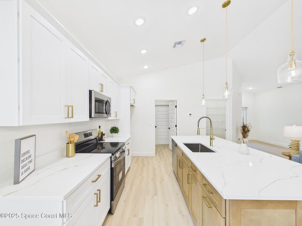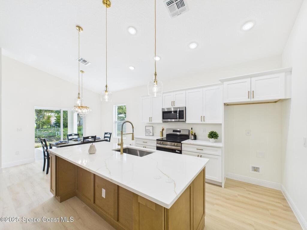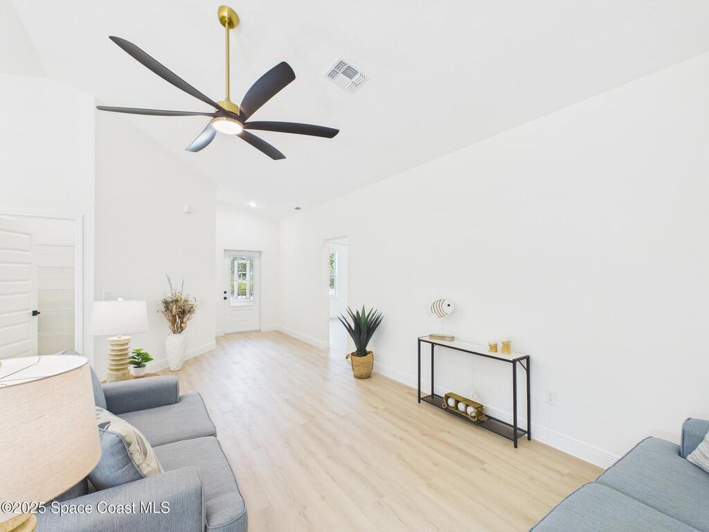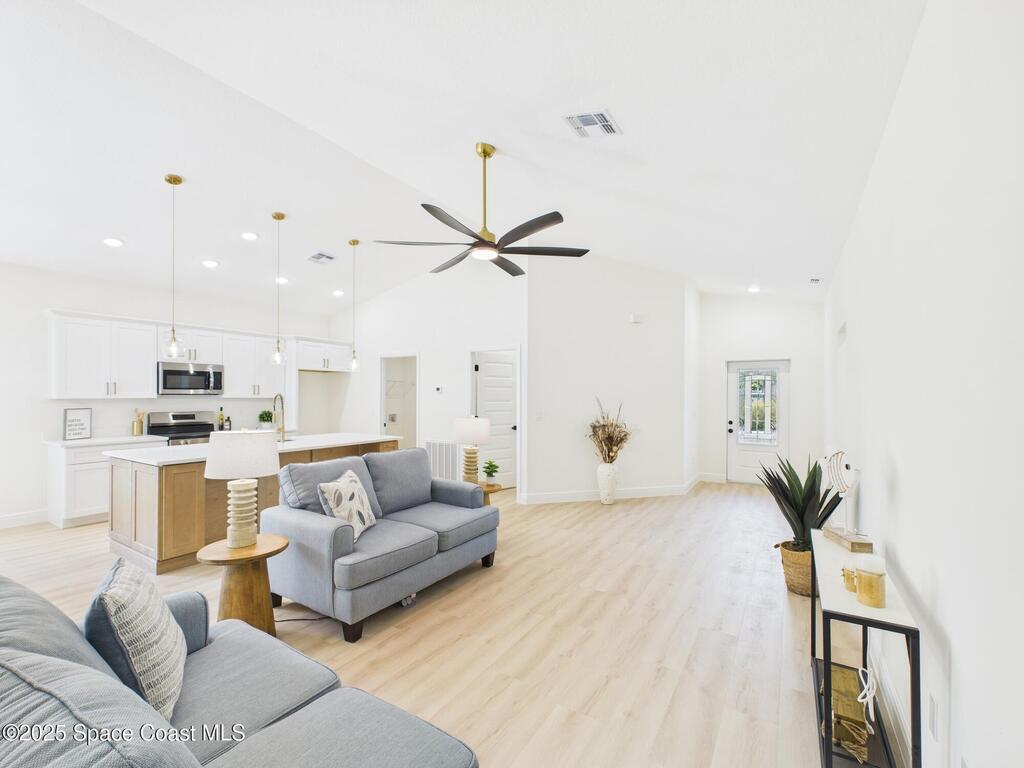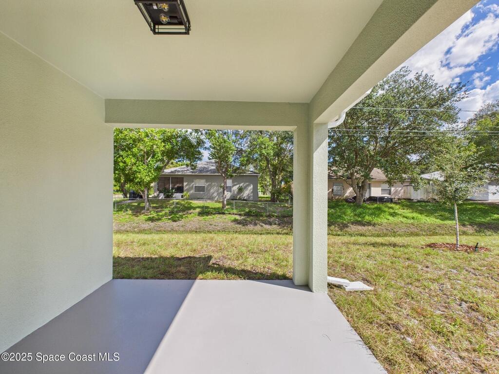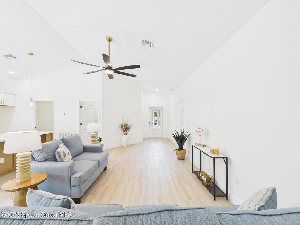 Come see this amazing newly built 3/2 home and experience quality builder upgrades. On a corner lot, with county water, the upgrades in this home make it move-in ready. Luxury vinyl plank flooring throughout, soft close shaker cabinetry in both baths and kitchen, topped with luxury quartz counters, IMPACT resistant glass doors and windows, modern fans, lighting fixtures and garage door opener are already installed! With easy access to CR 512, you are minutes away from the Indian River Lagoon and our fabulous Beaches! Make your appointment today.