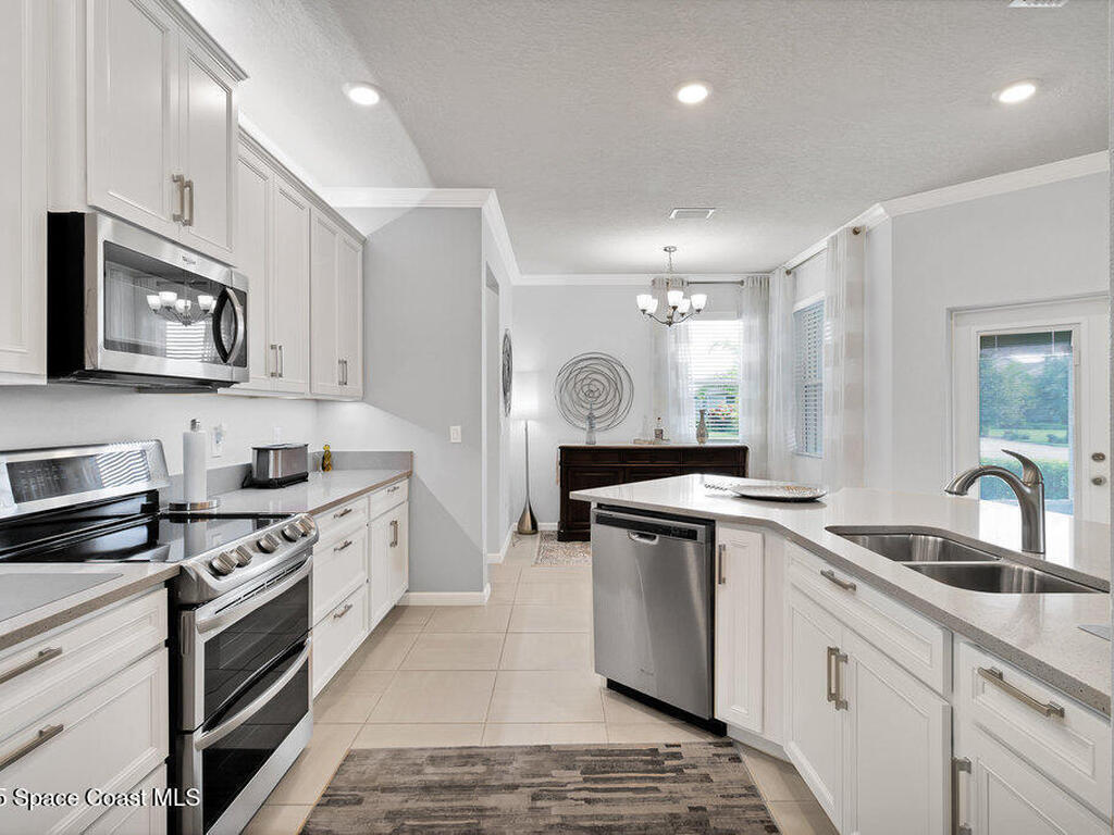 Welcome to Pointe West, one of Vero's most desirable golf communities. This beautifully maintained 4-bedroom, 2-bath home spans 2, 076 sq ft of thoughtfully designed living space; perfect for anyone seeking the FL lifestyle. This bright, open-concept floor plan features high ceilings, tile floors thru-out, crown molding, lots of windows & abundant natural light. The modern kitchen offers SS appliances, granite countertops, 42-inch cabinets & custom pantry; a perfect blend of style & functionality. The primary suite is your private retreat, complete with a custom walk-in closet & en-suite bath featuring dual vanities, walk-in shower & a linen closet. Three addl bedr at the front of the home provide flexible space for guests, office, or growing family. Enjoy your front yard oasis, boasting peaceful green space and no thru traffic. A rear-entry 2-car gar w/ epoxy floors is a unique feature of this charming community. Relax on the covered, screened lanai, a perfect spot for morning coffee.