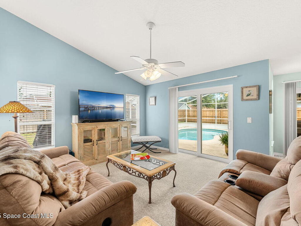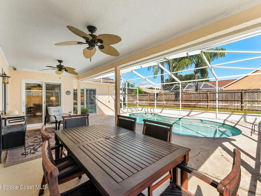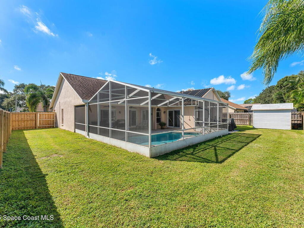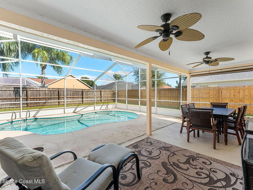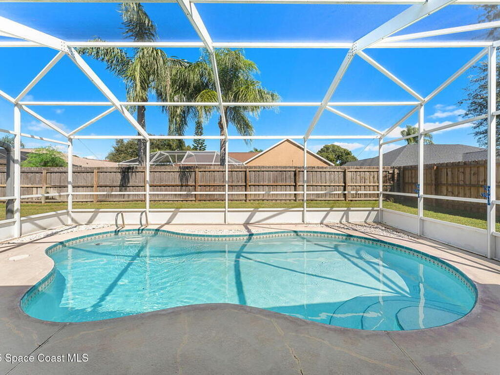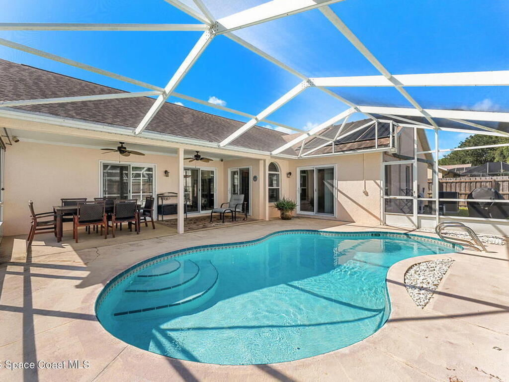 Full of natural light and easy Florida charm, this Rockledge pool home was designed for comfortable living. A thoughtful split floor plan balances connection and privacy, while vaulted ceilings and soft tones create an airy, welcoming feel. The kitchen opens to a cheerful breakfast nook and dining area overlooking the pool, ideal for both quiet mornings and easy entertaining. The primary suite offers direct lanai access, walk in closet, and a spacious bath with soaking tub and walk-in shower. Two guest bedrooms and a full bath provide flexibility for family or visitors. Outside, a screened patio, sparkling pool, and large fenced backyard invite everyday relaxation. With a roof replaced in 2019, community natural gas, and space that truly lives well, this home blends comfort with a touch of coastal personality.