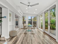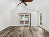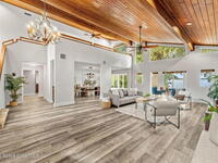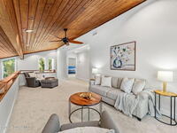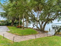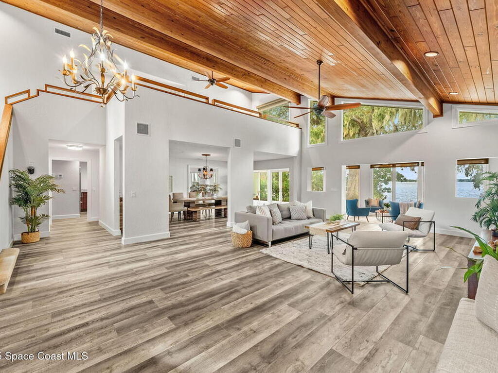 Spectacular direct Indian Riverfront home featuring 3 bedrooms plus an office, completely renovated in 2017 to combine modern design with subtle historic charm. The open layout emphasizes light and connection, with soaring glass, minimal walls, and seamless flow between indoor living spaces and lush outdoor gardens. Vaulted ceilings, LVP and tile flooring, and thoughtfully curated finishes create a warm, modern aesthetic that balances comfort with style. The first-floor primary bedroom offers privacy and river views, while the private dock with state-of-the-art Sure Step decking provides direct access to boating, kayaking, and fishing on the Indian River. Additional features include a newer paver driveway, professional landscaping, hurricane-rated windows, and dual air conditioners. Perfectly suited for those seeking Florida waterfront living, this home adapts effortlessly between contemporary and coastal-chic with just a change in furnishings.