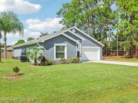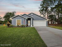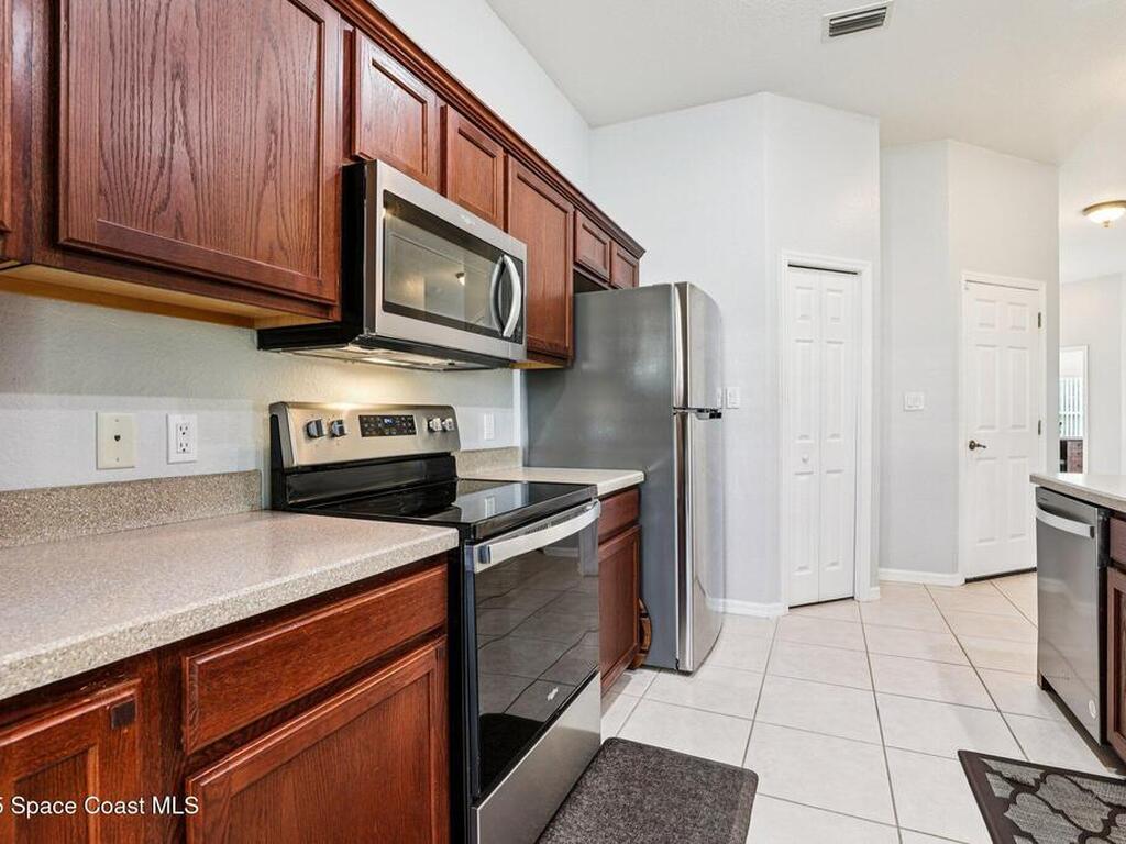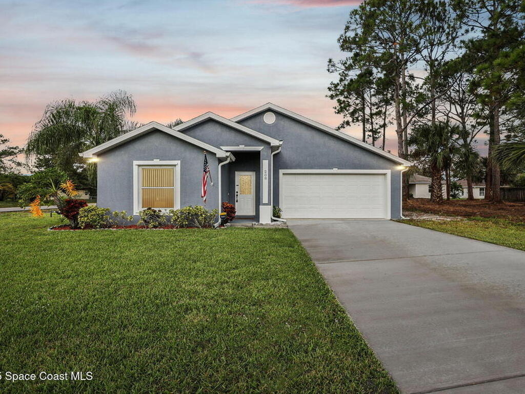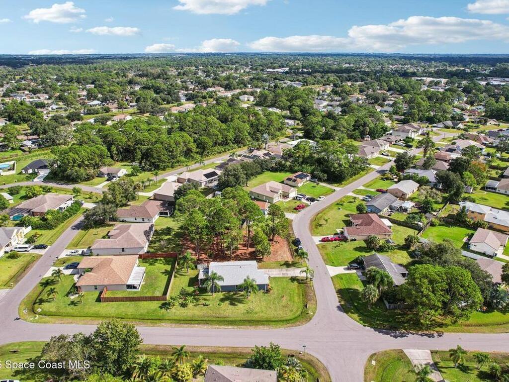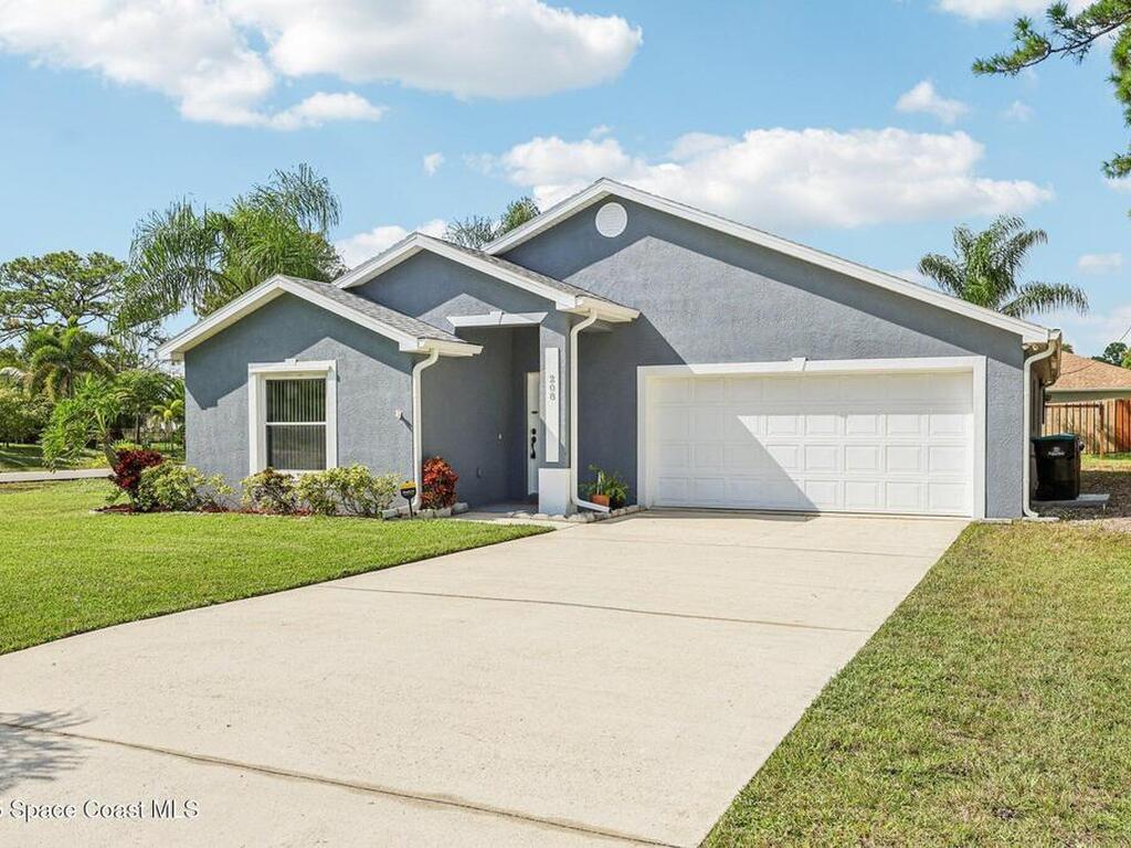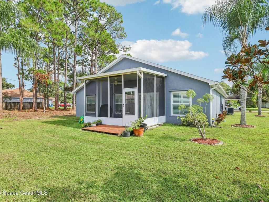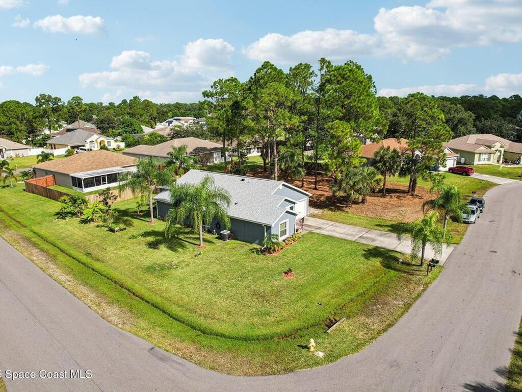Beautifully updated home on a corner lot with city water and city sewer! This stunning 3-bedroom, 2-bath home offers 1, 541 square feet of living space on a spacious 0.24-acre lot in Palm Bay. Numerous upgrades have been completed since 2023, including a NEW roof, NEW water heater, NEW appliances (washer and dryer included), exterior home painted, NEW gutters added, exterior security lighting replaced and updated smoke and CO2 detectors. The home also features Simply Safe security system with window sensors and AT&T fiber wiring for high-speed internet. Inside, you'll find an inviting open floor plan with 10' vaulted ceilings and the kitchen overlooks the dining and great room--perfect for entertaining. The oversized kitchen boasts beautiful oak cabinetry with roll-out drawers, an extra pantry, ceramic cooktop stove, built-in microwave, and refrigerator with water dispenser.