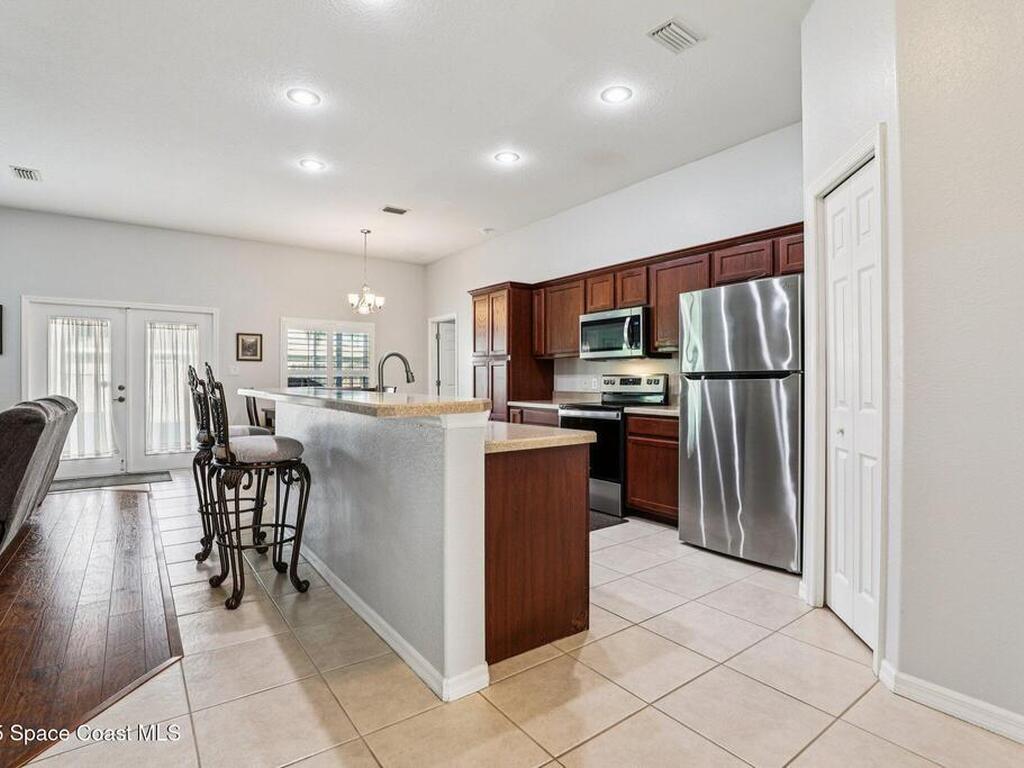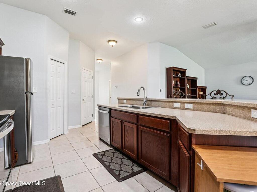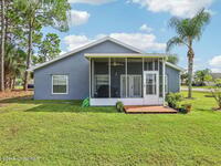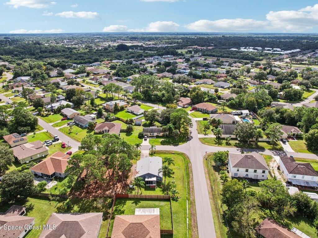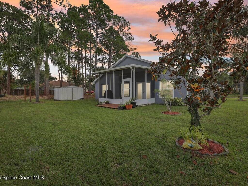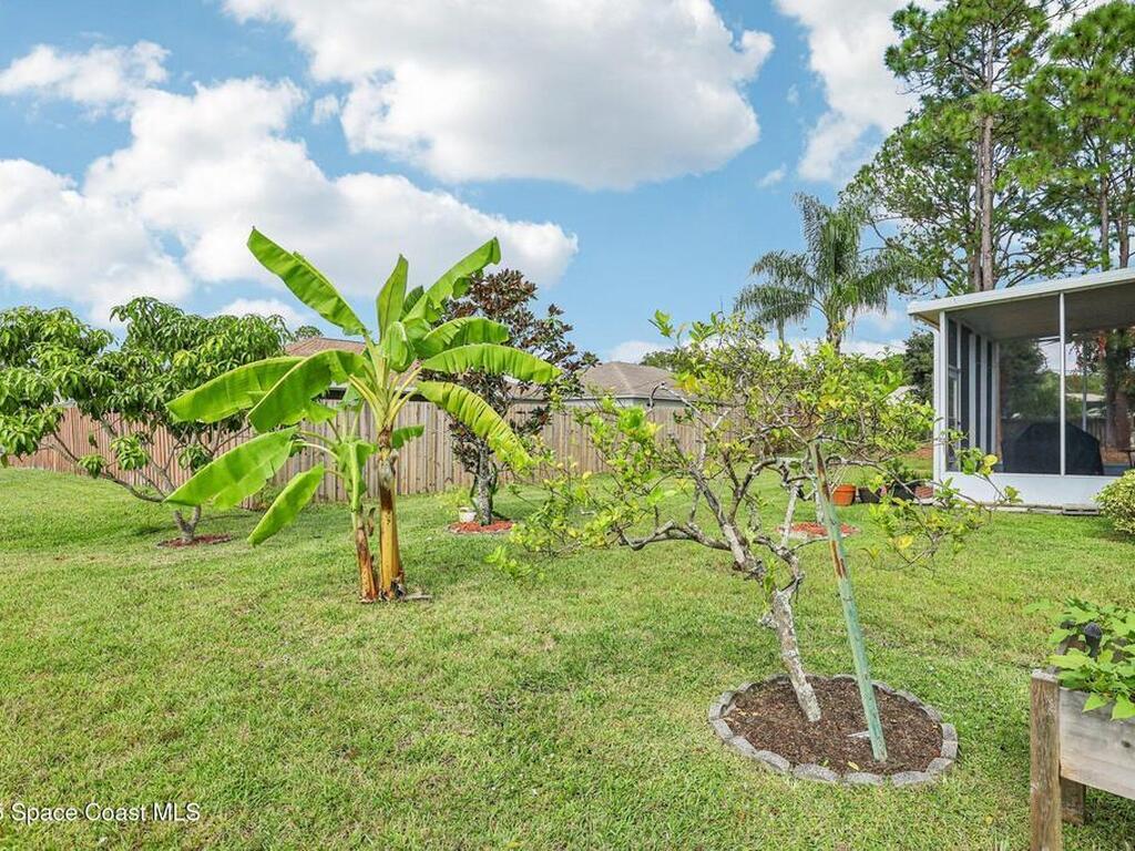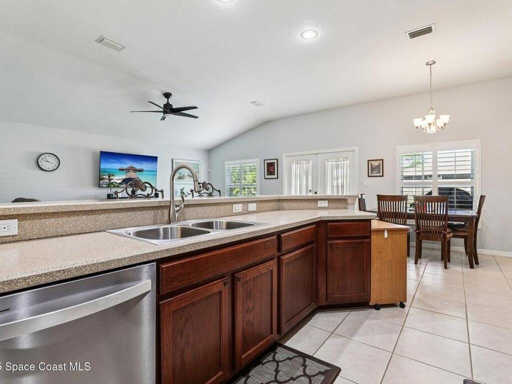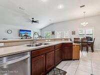 Beautifully updated home on a corner lot with city water and city sewer! This stunning 3-bedroom, 2-bath home offers 1, 541 square feet of living space on a spacious 0.24-acre lot in Palm Bay. Numerous upgrades have been completed since 2023, including a NEW roof, NEW water heater, NEW appliances (washer and dryer included), exterior home painted, NEW gutters added, exterior security lighting replaced and updated smoke and CO2 detectors. The home also features Simply Safe security system with window sensors and AT&T fiber wiring for high-speed internet. Inside, you'll find an inviting open floor plan with 10' vaulted ceilings and the kitchen overlooks the dining and great room--perfect for entertaining. The oversized kitchen boasts beautiful oak cabinetry with roll-out drawers, an extra pantry, ceramic cooktop stove, built-in microwave, and refrigerator with water dispenser.
