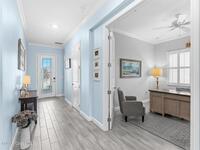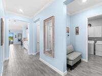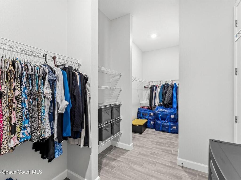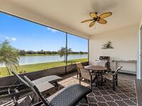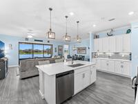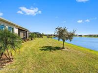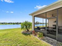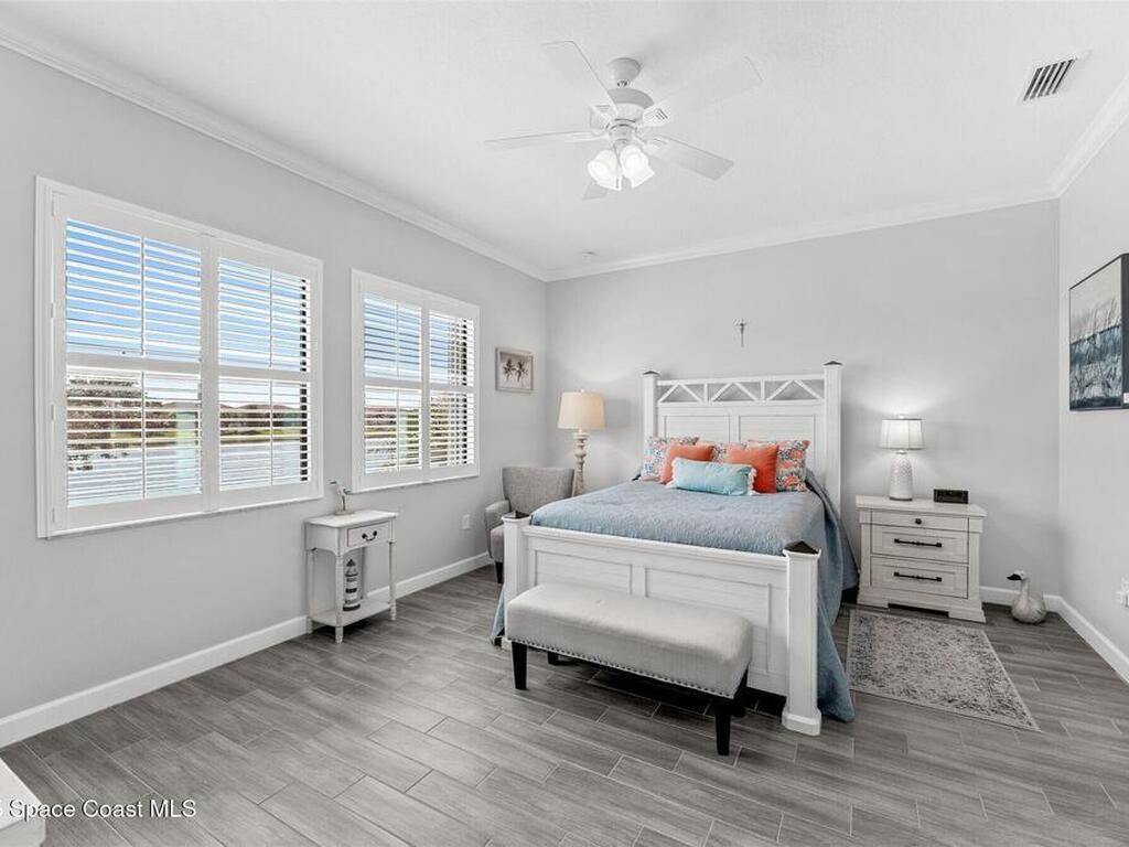 Pristine 3 bedroom plus study, 3 1/2 bath home in Bridgewater, Viera's popular 55+ resort style community! Move in ready with every upgrade: new porcelain tile plank floors throughout, crown molding, plantation shutters, screened in lanai, 8' doors, epoxy garage floors and more! Perfect for guests, every bedroom is an ensuite with its own bath! Large three panel sliders in great room bring the beautiful lake views into your home and set it apart from similar key largo style homes! The outside is as meticulous as the interior with stone trim enhancing the freshly painted exterior. As you approach the home, you will notice the stone landscape beds and impact glass etched front door. Accordion shutters are on all windows and sliders and a portable generator w/transformer switch add to your peace of mind. The private clubhouse offers a large, heated pool and spa, fitness center, tennis & pickleball courts and a movie theater! Short drive to ocean beaches, cruise ships, shopping, dining!