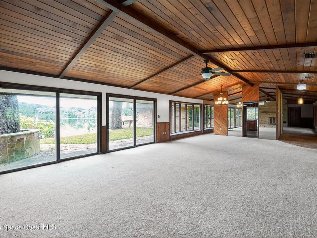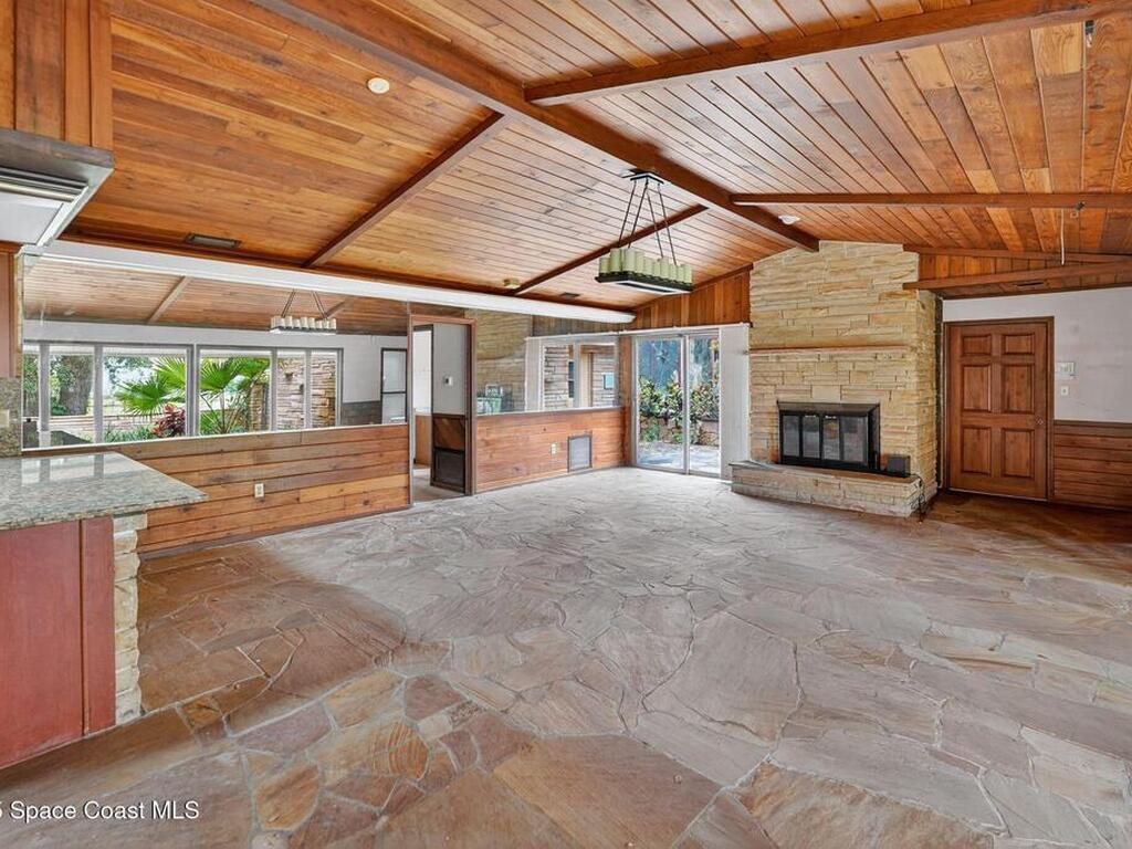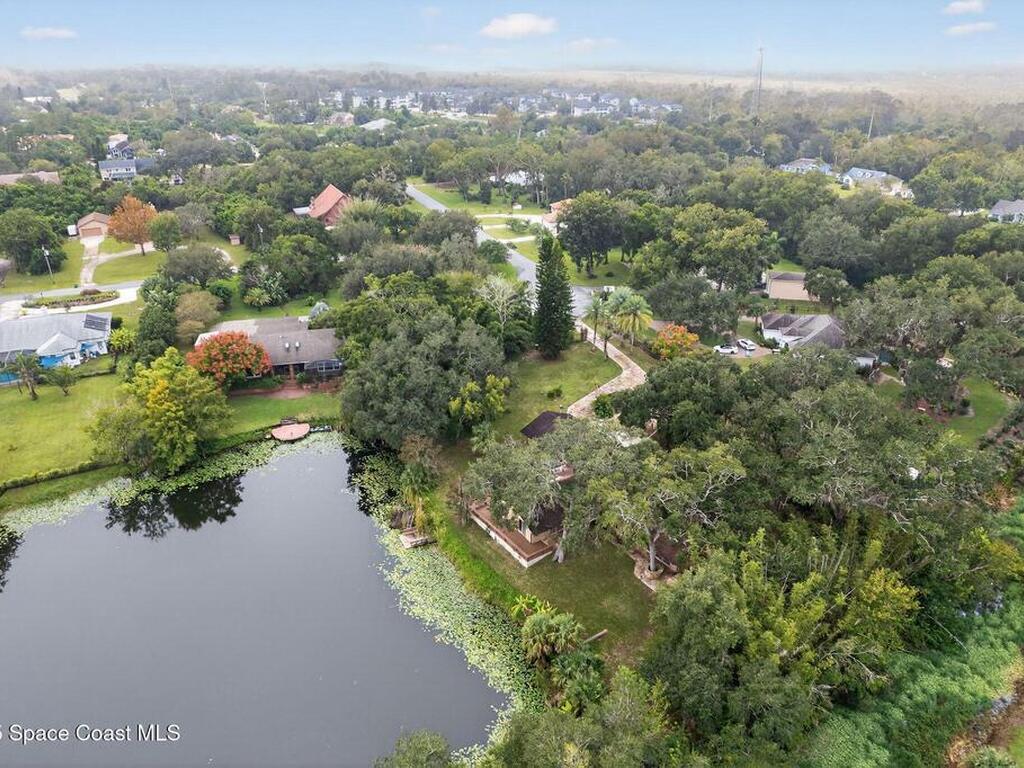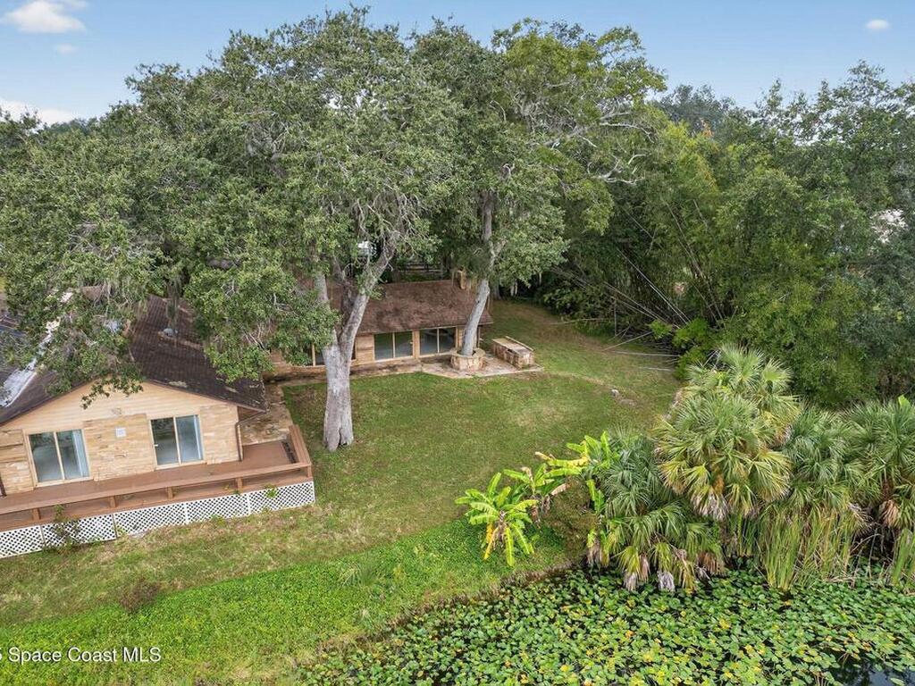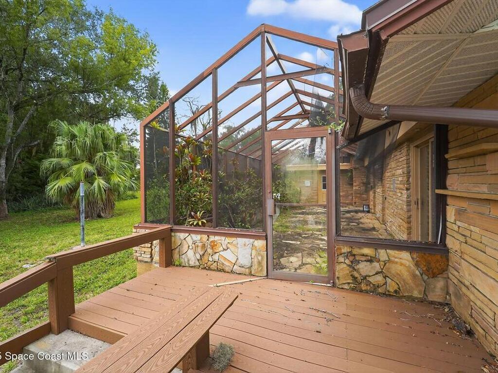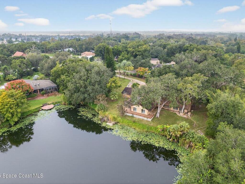 Where architecture meets nature, this rare mid-century modern retreat offers privacy, water views, and timeless design on 1.62 acres at the end of a secluded cul-de-sac. Floor-to-ceiling glass captures panoramic views of a peaceful non-motorized pond surrounded by mature trees, creating a private sanctuary perfect for paddleboarding, wildlife watching, and quiet reflection. The striking architecture features cedar tongue-and-groove ceilings, split-stone fireplaces, and a seamless indoor-outdoor flow. A dramatic family room with soaring ceilings anchors the home, while the private primary suite opens to nature with its own outdoor hot tub. Multiple decks and a screened atrium connect every space to the surrounding landscape. Located near downtown Titusville, waterfront dining, rocket launches, and nature preserves, this is more than a home--it is a lifestyle defined by serenity, design, and connection to nature.