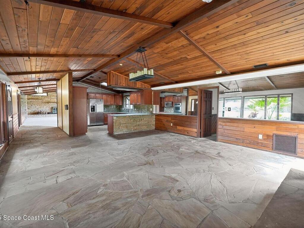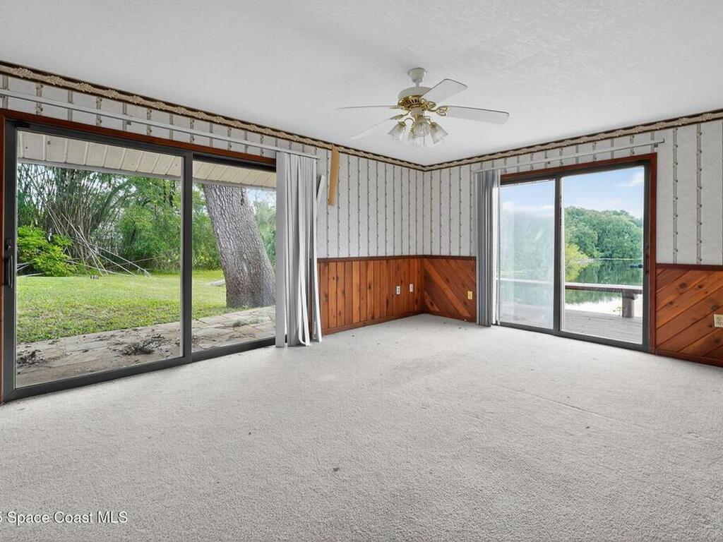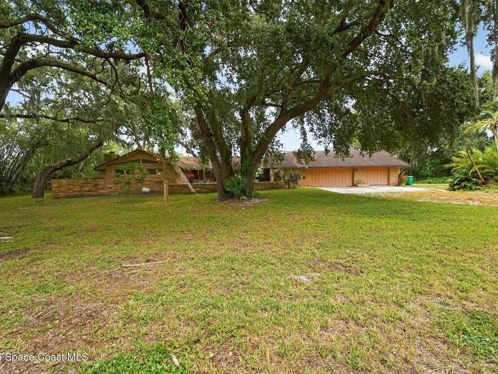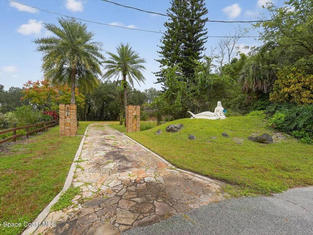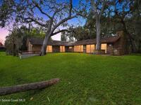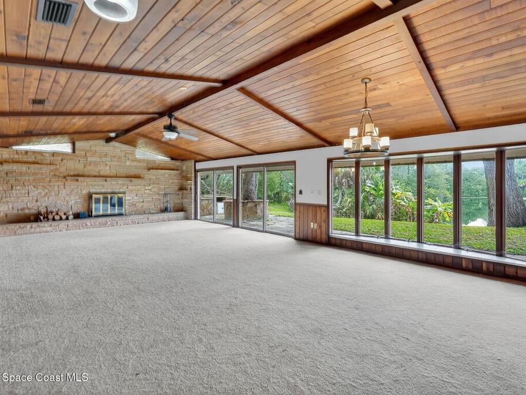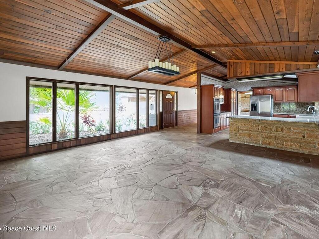 Where architecture meets nature, this rare mid-century modern retreat offers privacy, water views, and timeless design on 1.62 acres at the end of a secluded cul-de-sac. Floor-to-ceiling glass captures panoramic views of a peaceful non-motorized pond surrounded by mature trees, creating a private sanctuary perfect for paddleboarding, wildlife watching, and quiet reflection. The striking architecture features cedar tongue-and-groove ceilings, split-stone fireplaces, and a seamless indoor-outdoor flow. A dramatic family room with soaring ceilings anchors the home, while the private primary suite opens to nature with its own outdoor hot tub. Multiple decks and a screened atrium connect every space to the surrounding landscape. Located near downtown Titusville, waterfront dining, rocket launches, and nature preserves, this is more than a home--it is a lifestyle defined by serenity, design, and connection to nature.